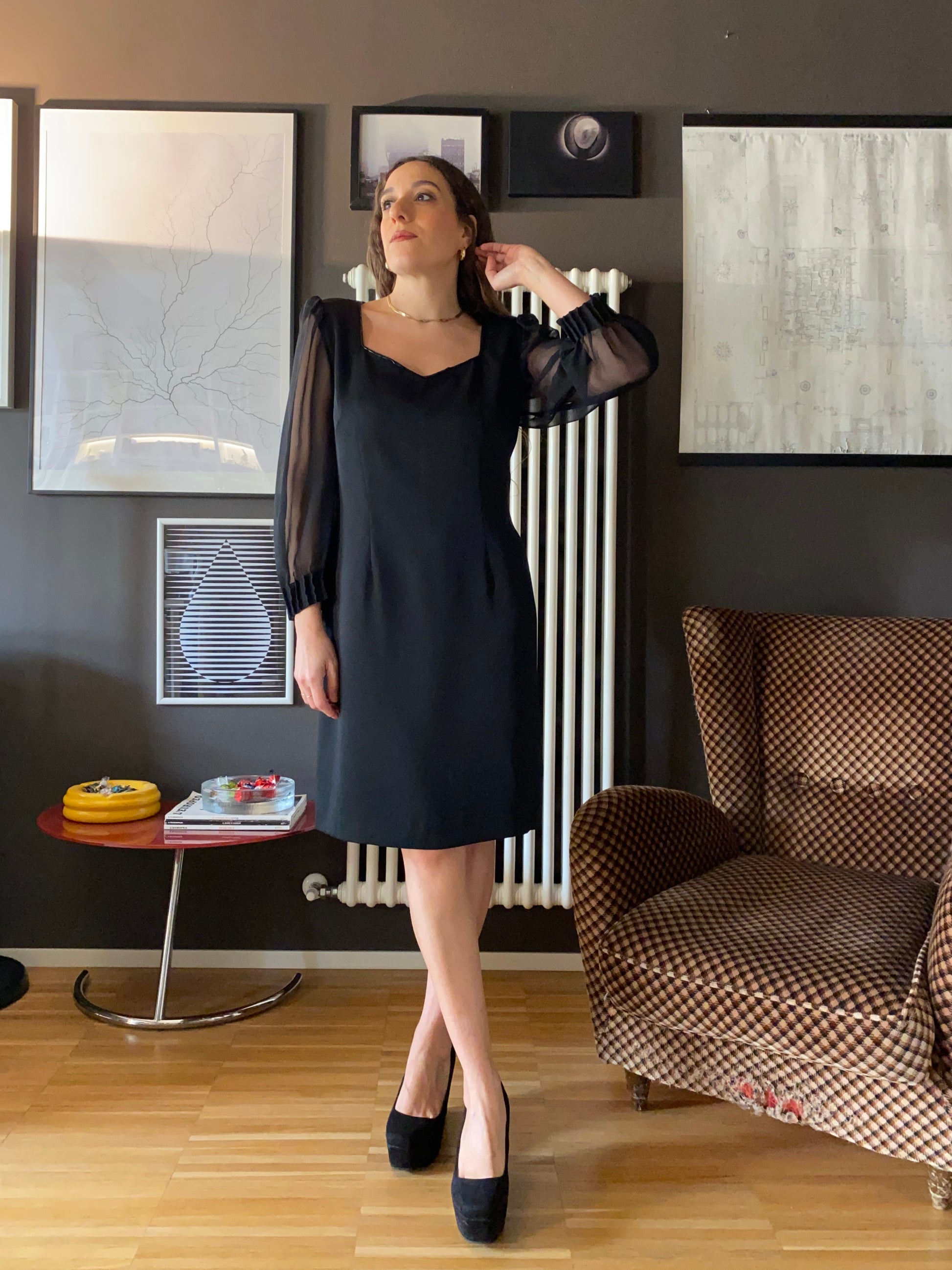 Stupendo abito sartoriale anni 70 con scollo a cuore decorato da perline nere baguette, spalline e maniche in tessuto trasparente con polsino plissettato.