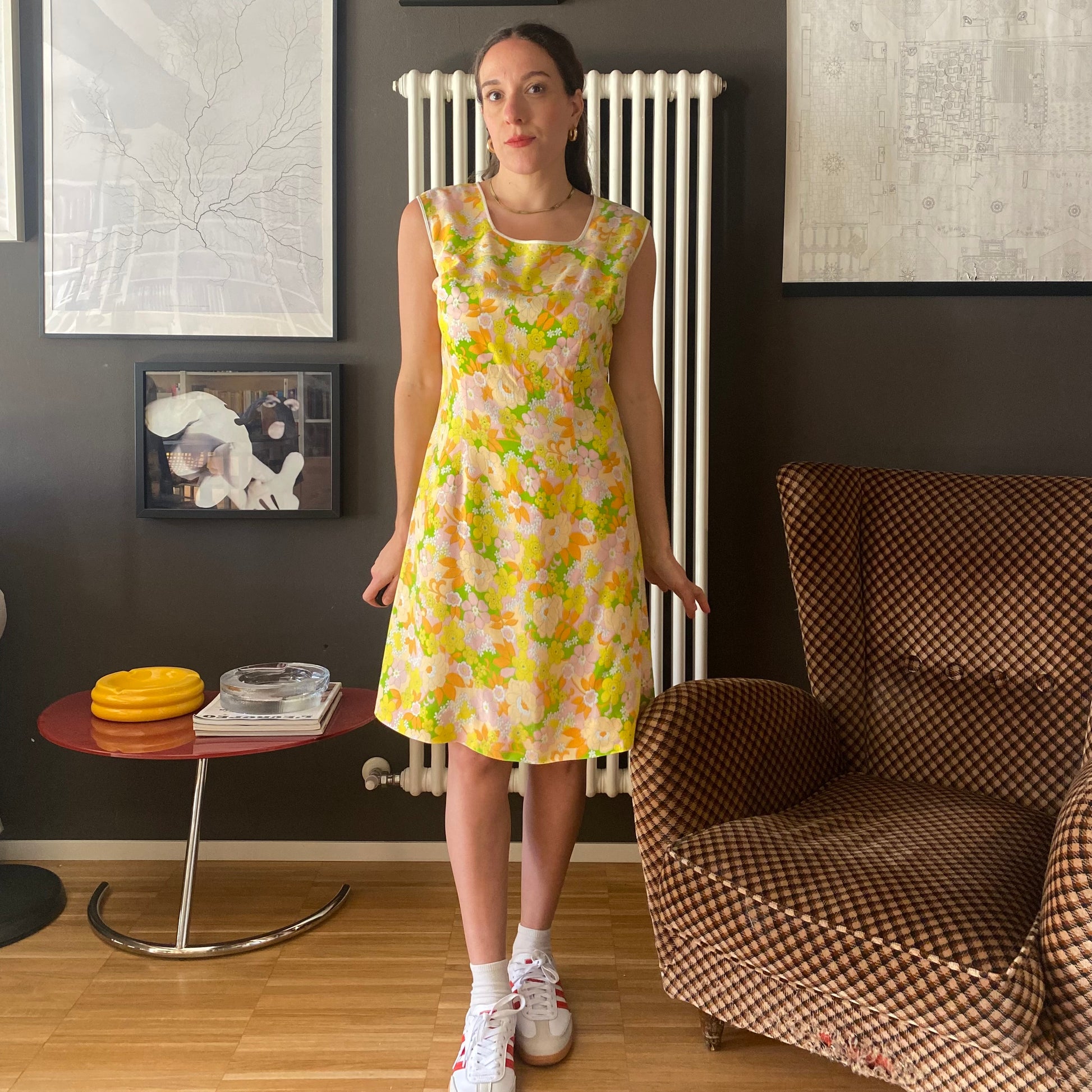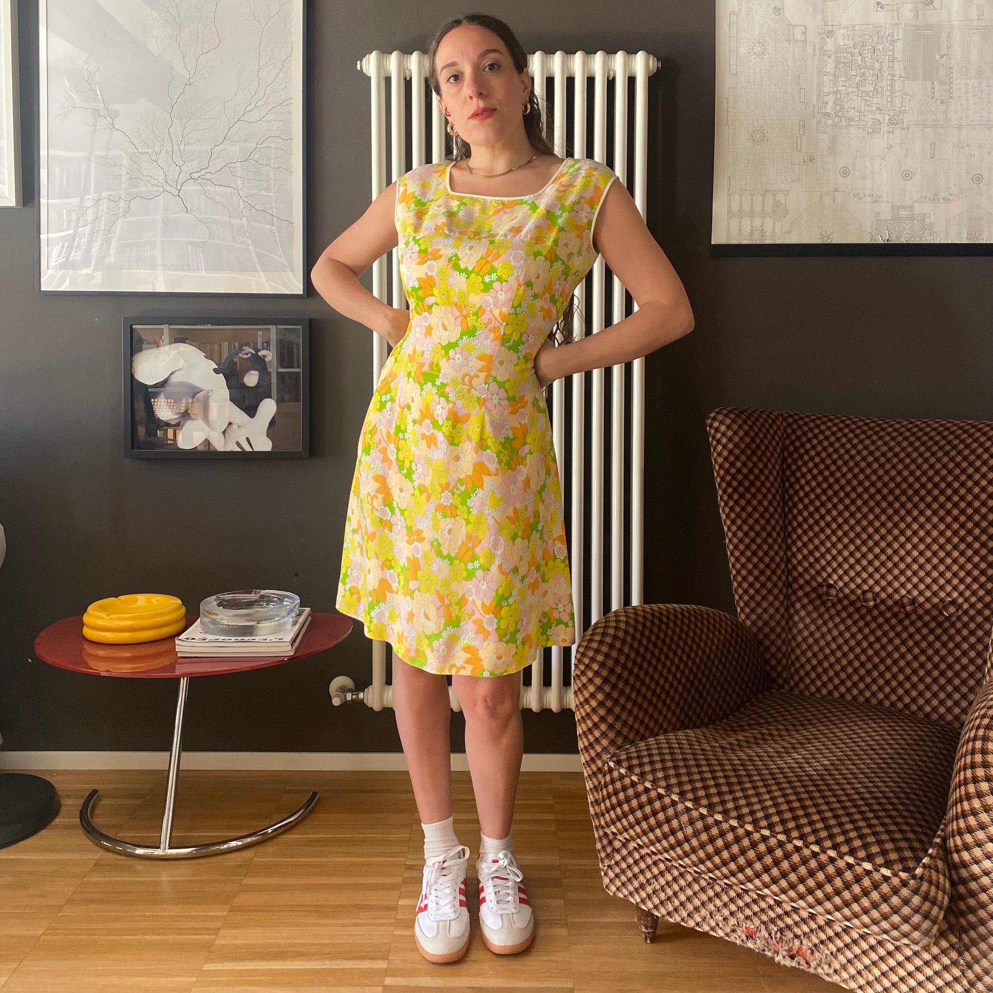 Grazioso abitino anni 70 in una meravigliosa fantasia floreale dal tocco optical. Fondo arancione chiaro e fiori gialli veridi rosa e arancione acceso.