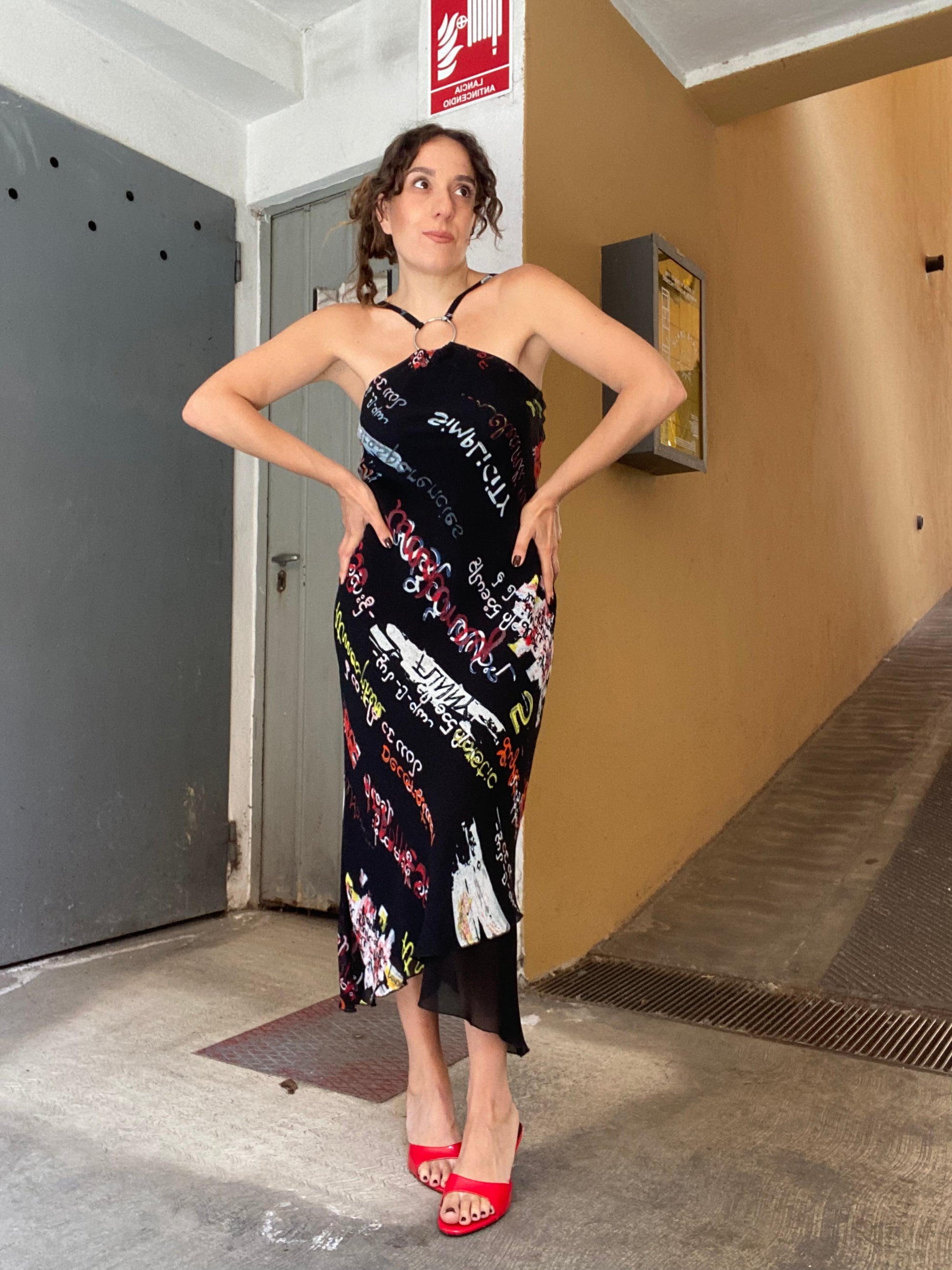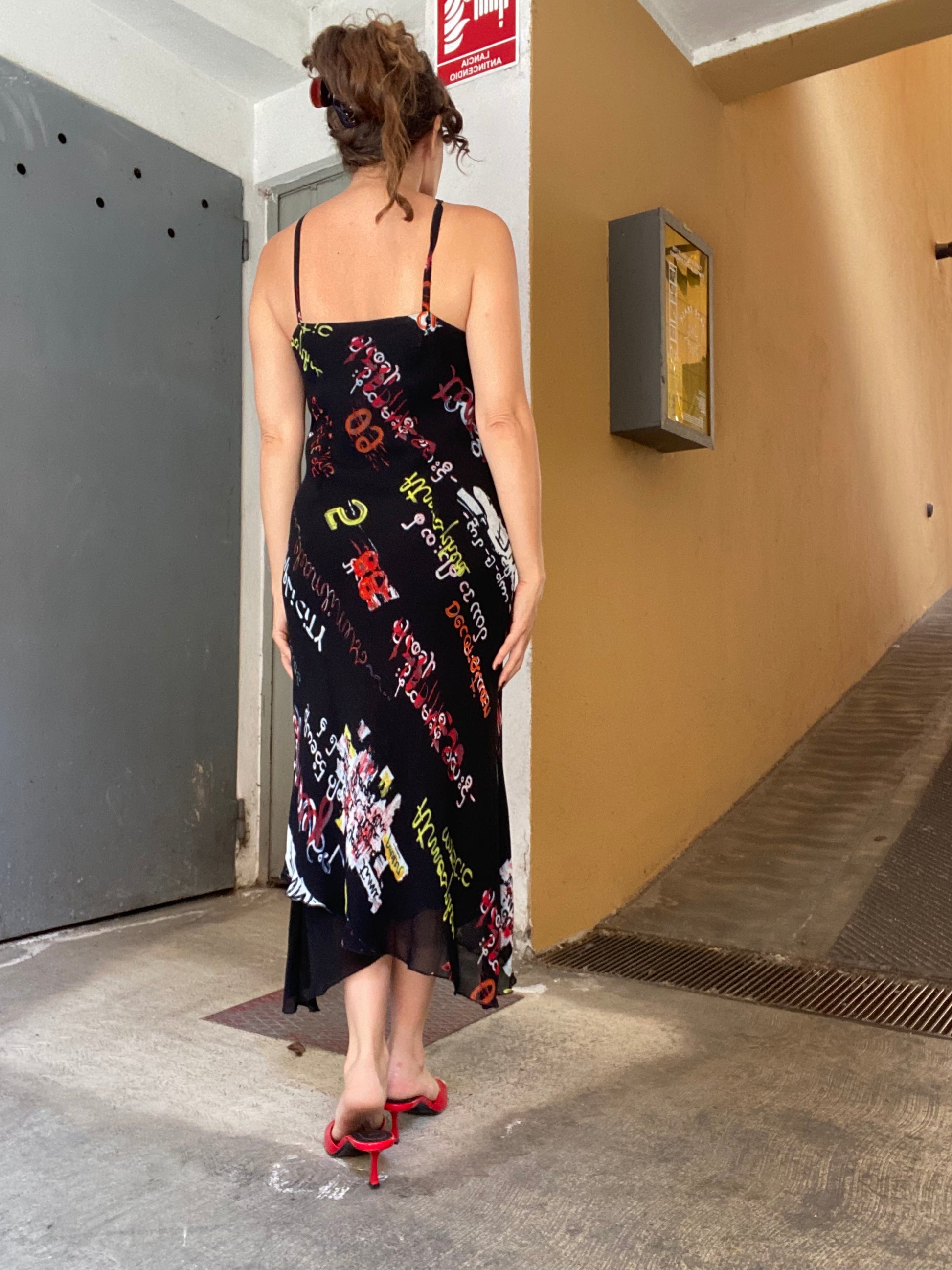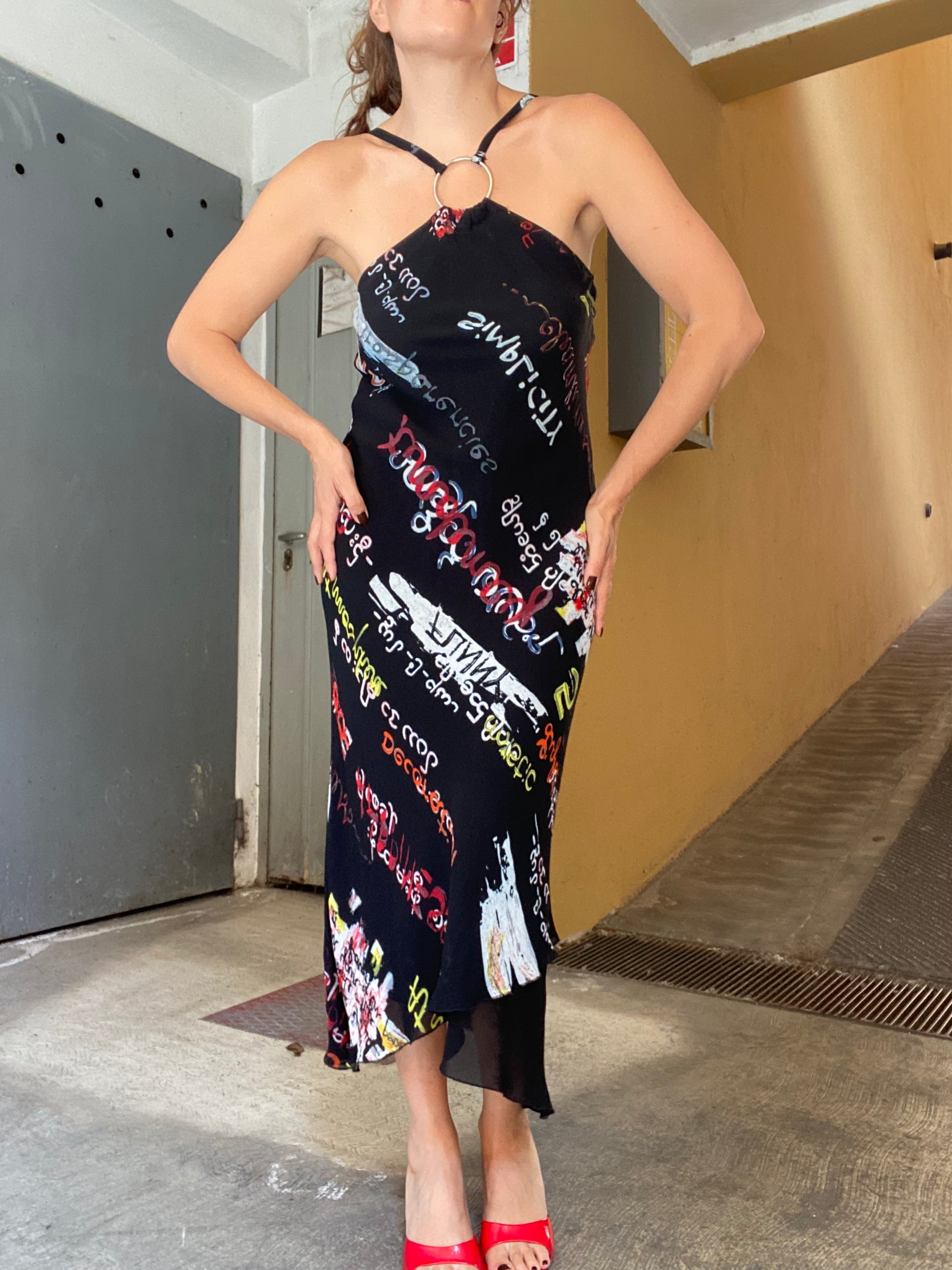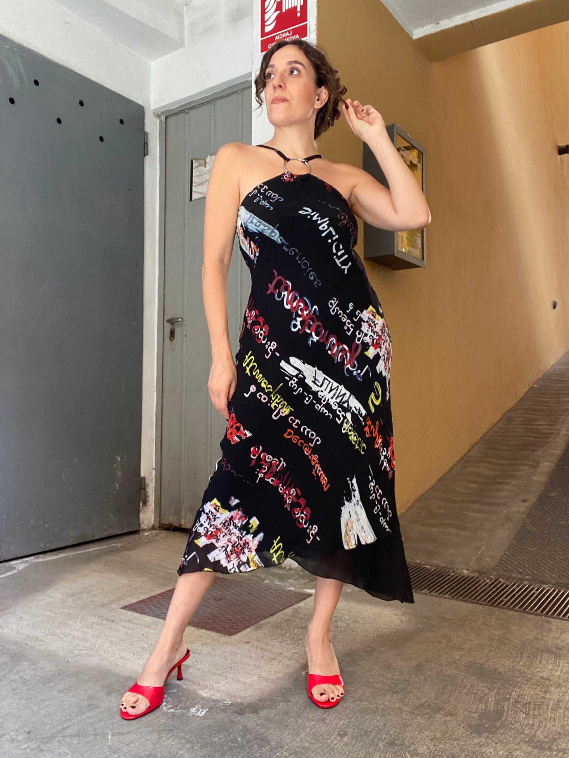 Abito lungo anni 2000, doppiato con stampa pop tipo graffiti.