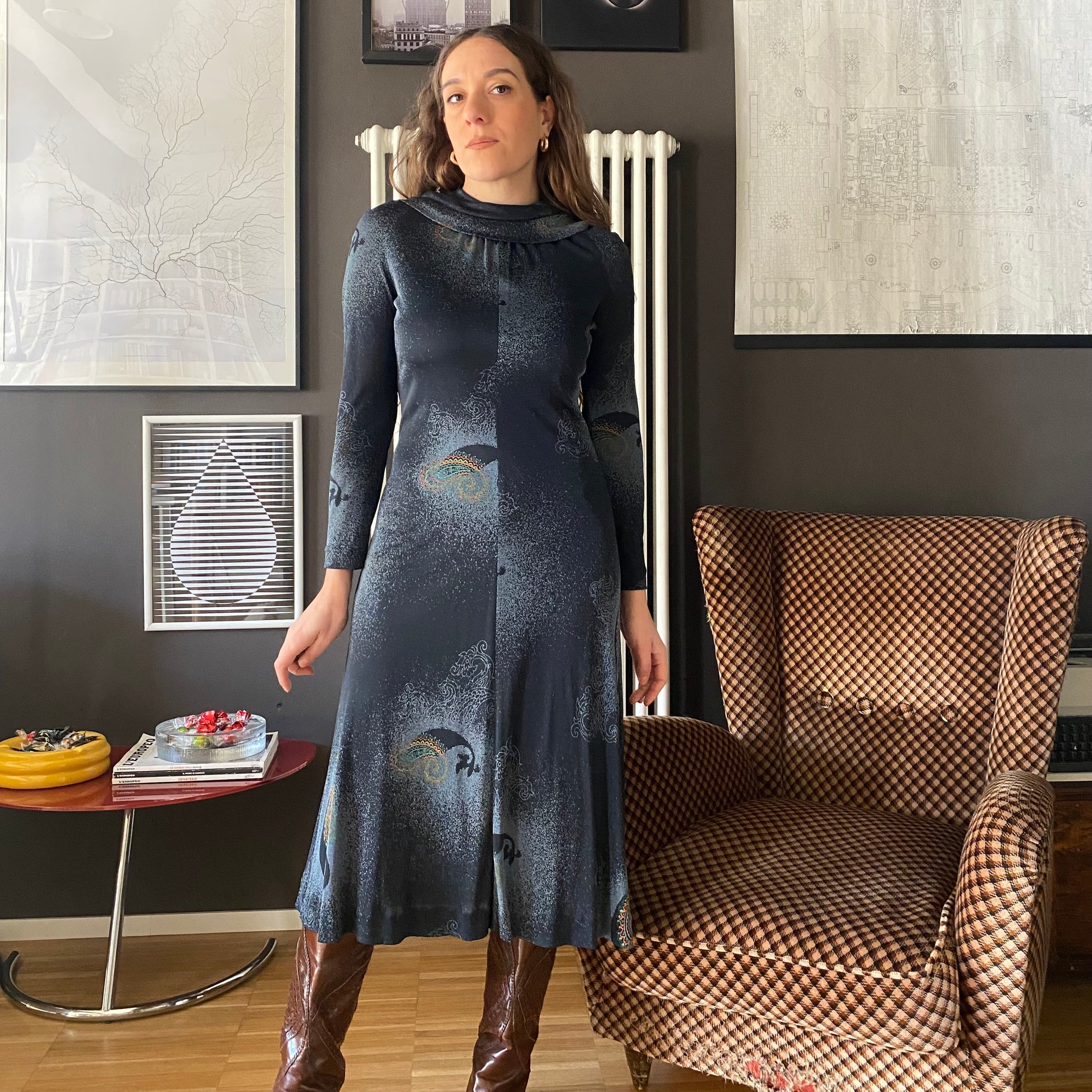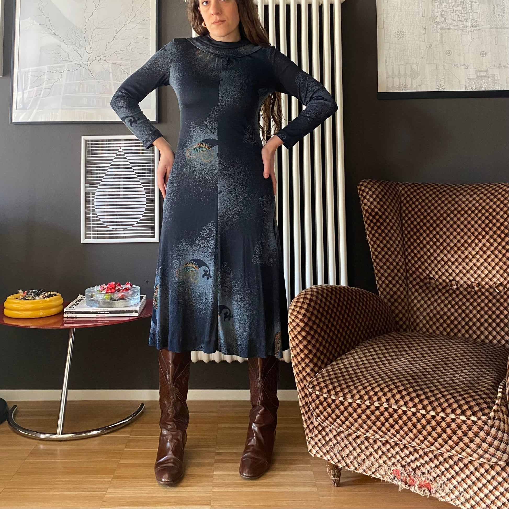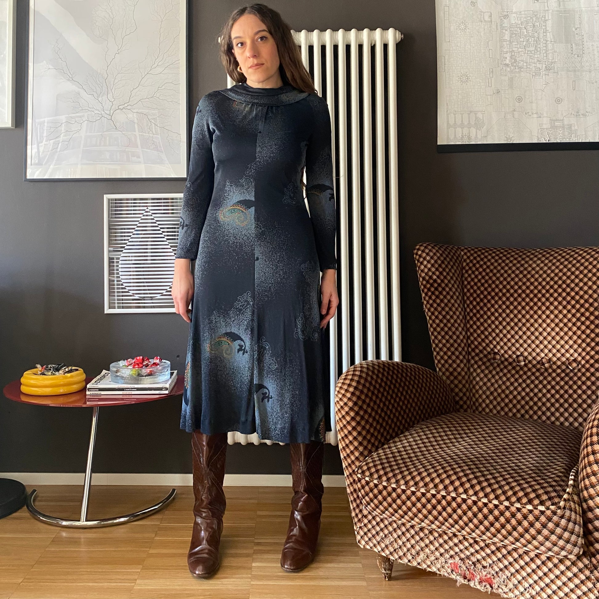 E' proprio il caso di questo meraviglioso abito anni 70 in meraviglioso e sottilissimo tessuto elasticizzato che avvolge la figura senza mortificarla.