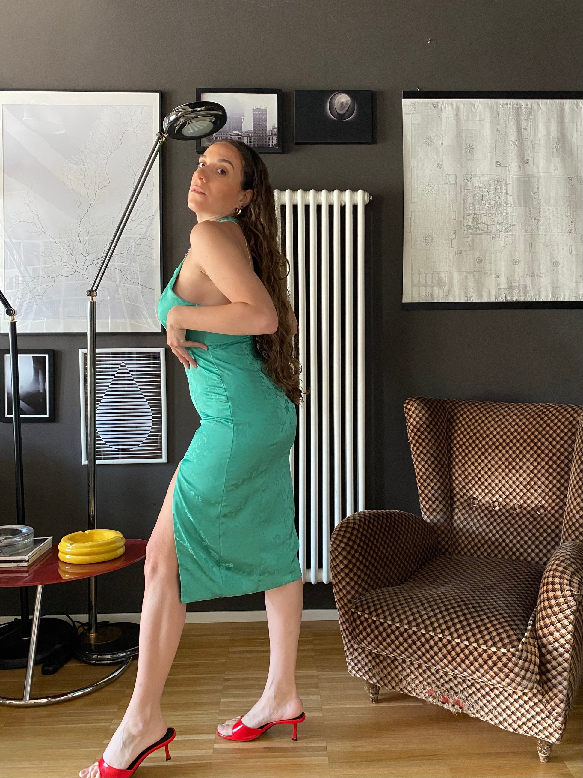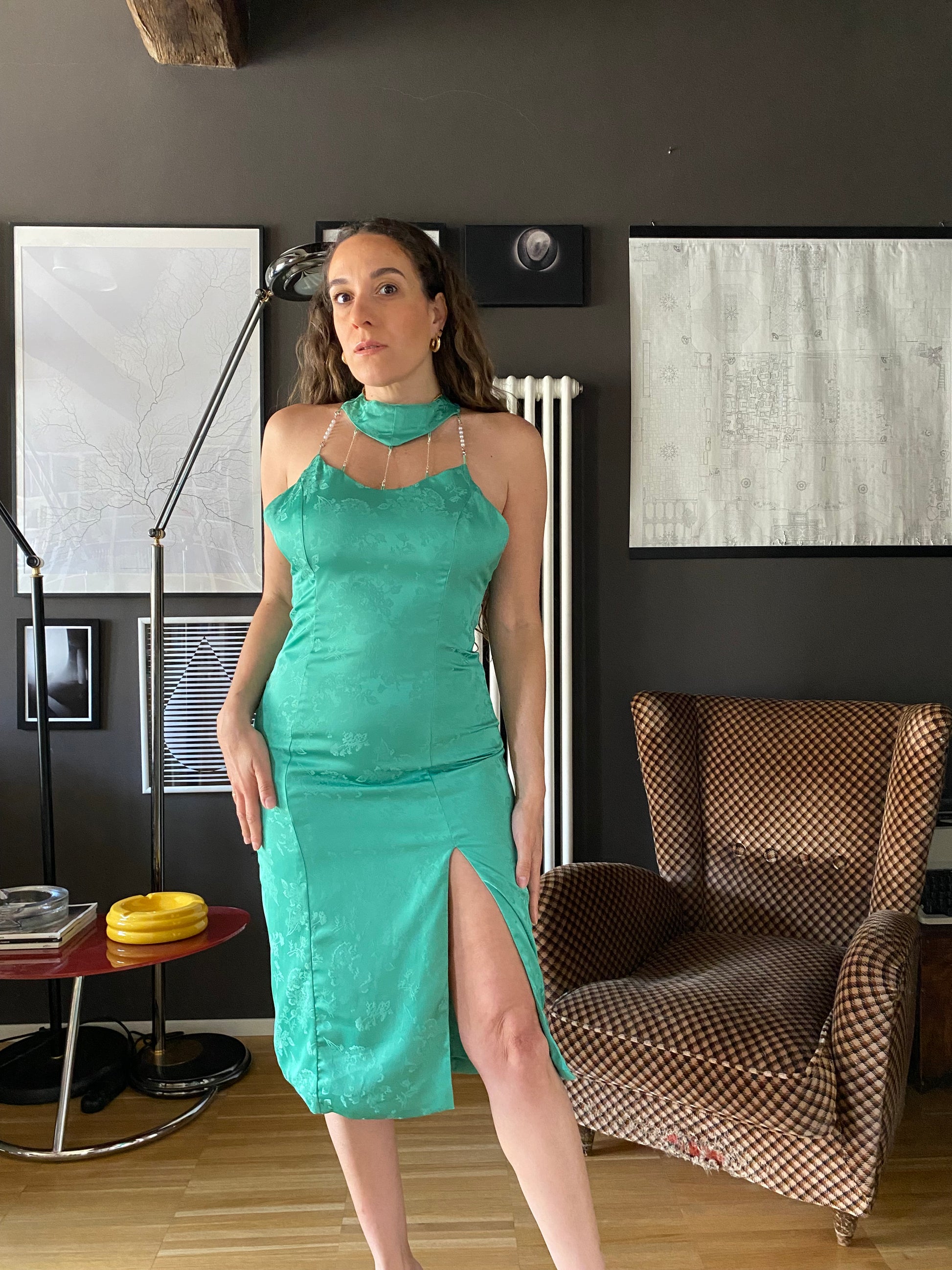 Abito fasciatissimo con spacco anteriore sinistro, lunghezza sotto al ginocchio.