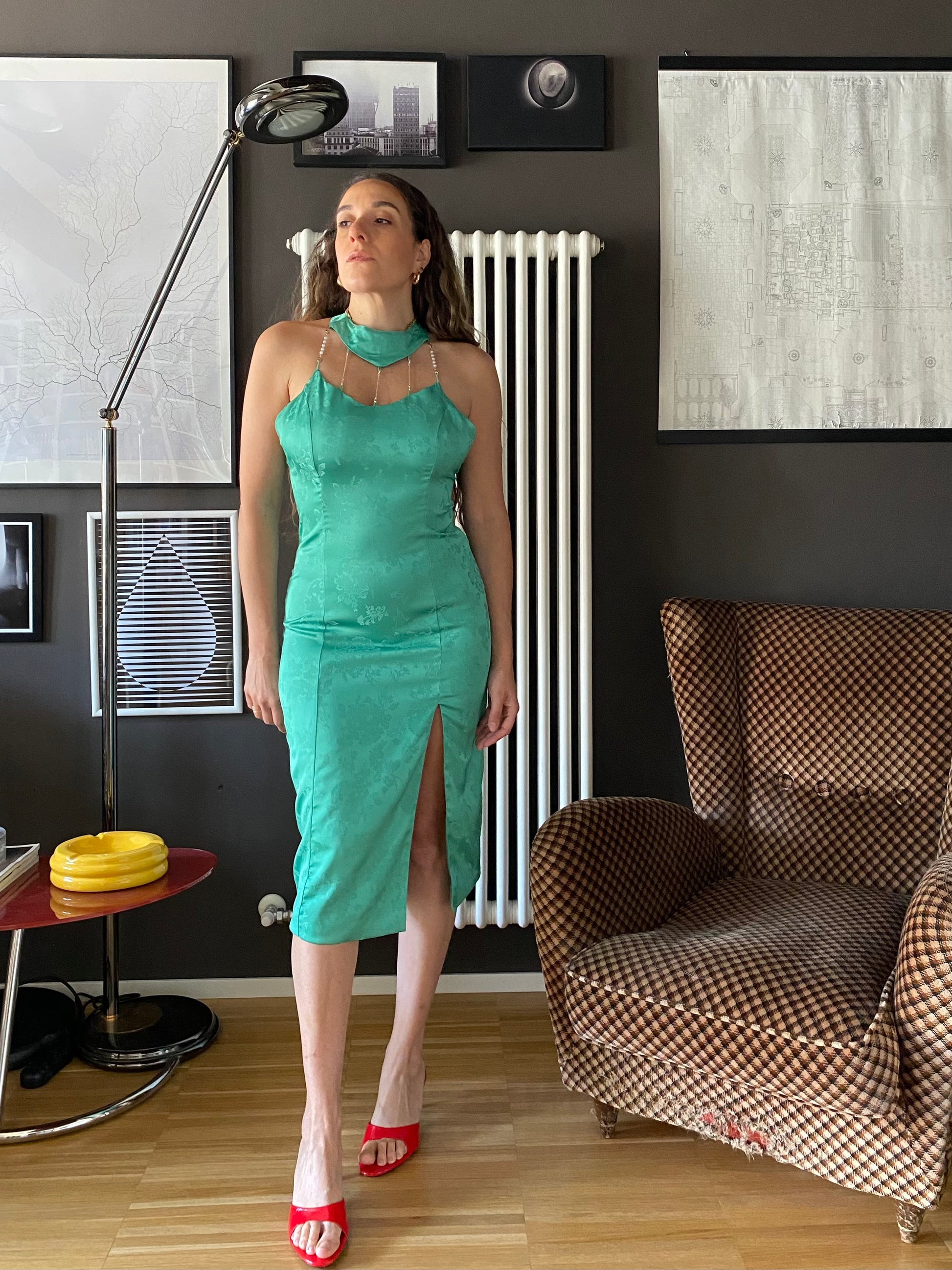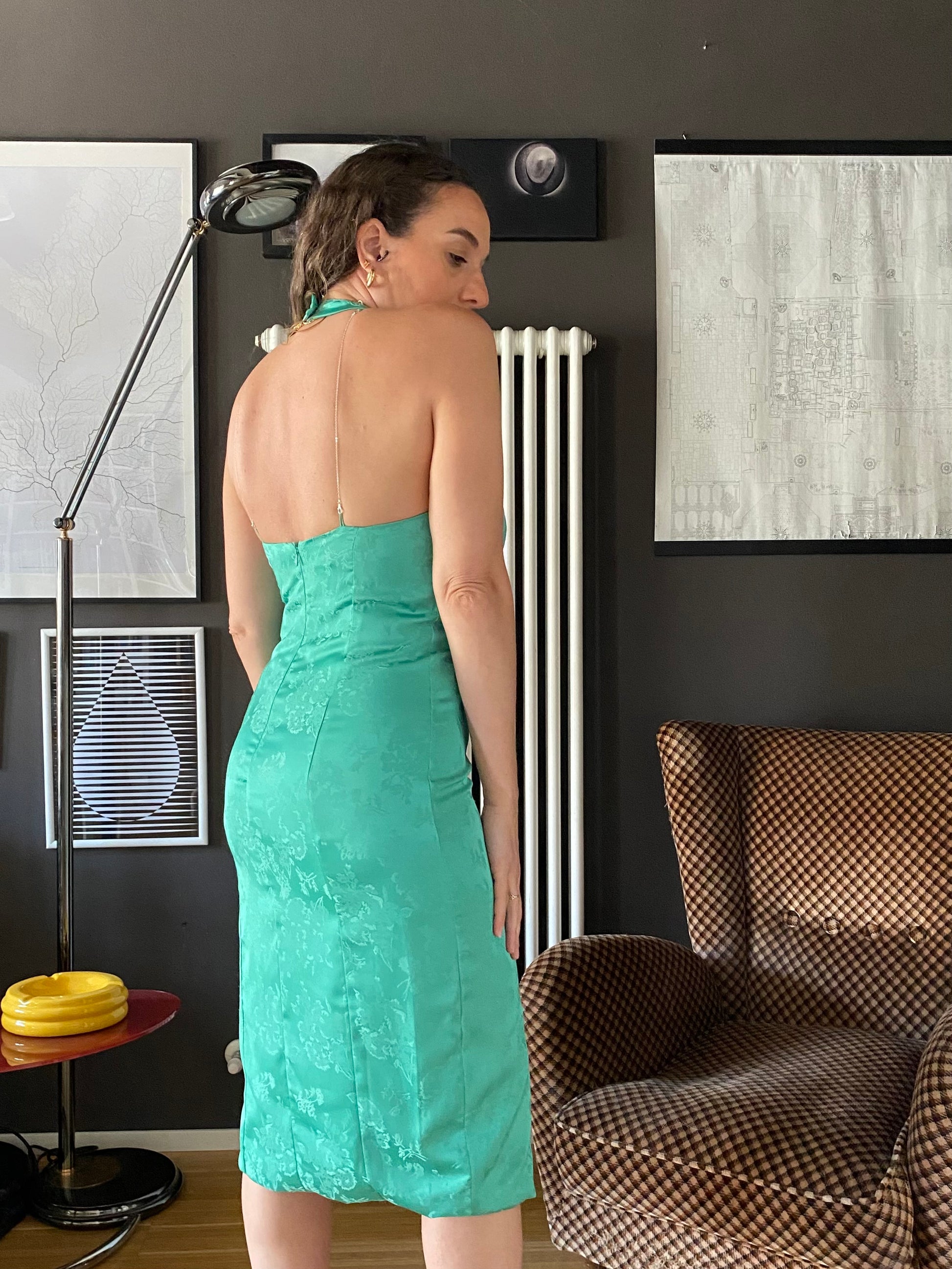 Davvero particolare col il colletto tondo collegato allo scollo a U del vestito da una fila di catenine argentate che fungono anche da spalline.