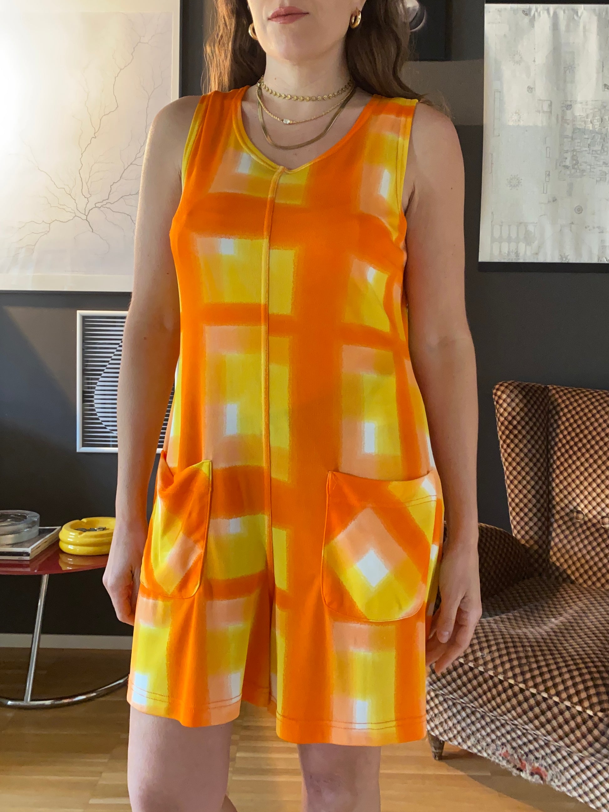 Jumpsuite corta anni 70 con fit svatato. Scollo a U, giromanica.