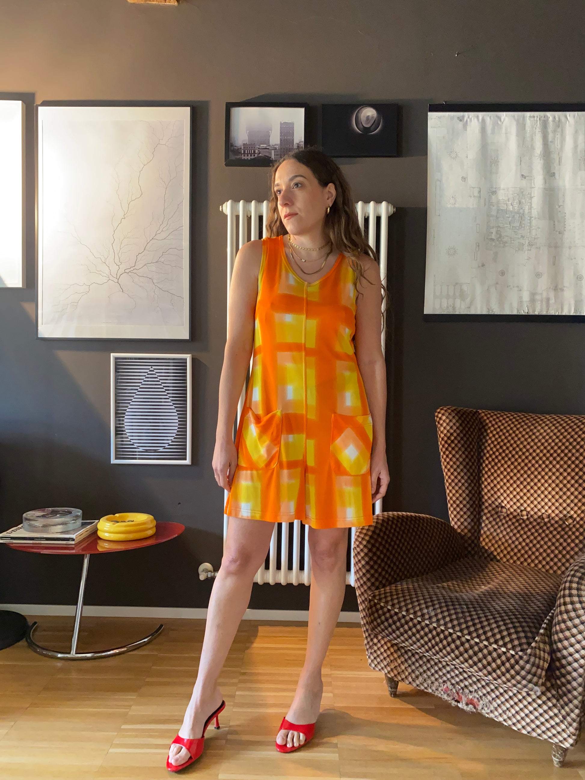Fantasia a quadri dai toni dell'arancio sfumato via via più chiaro fino a raggiungere il bianco.