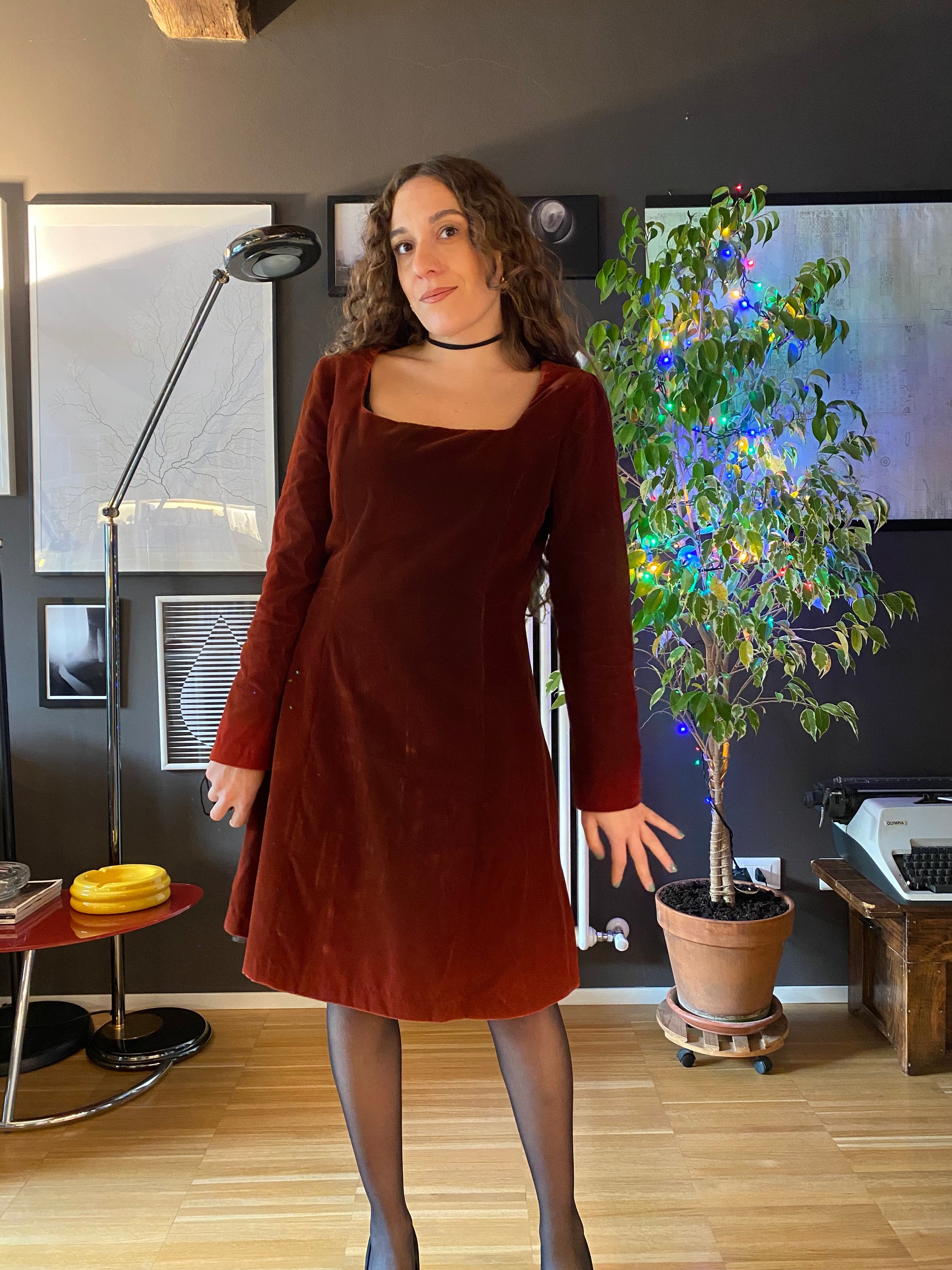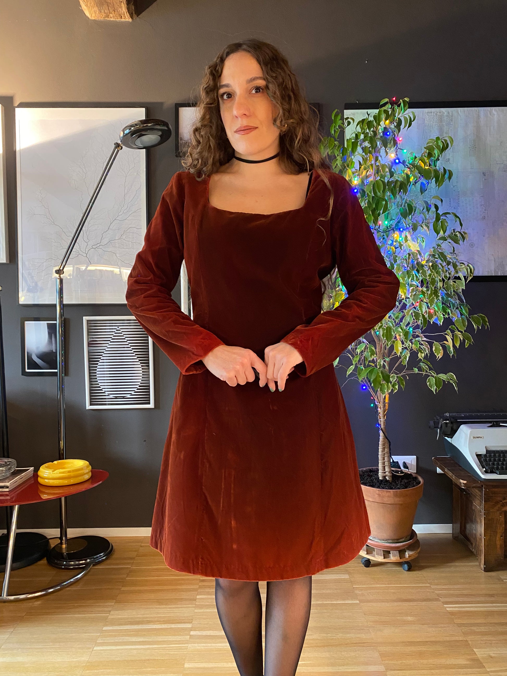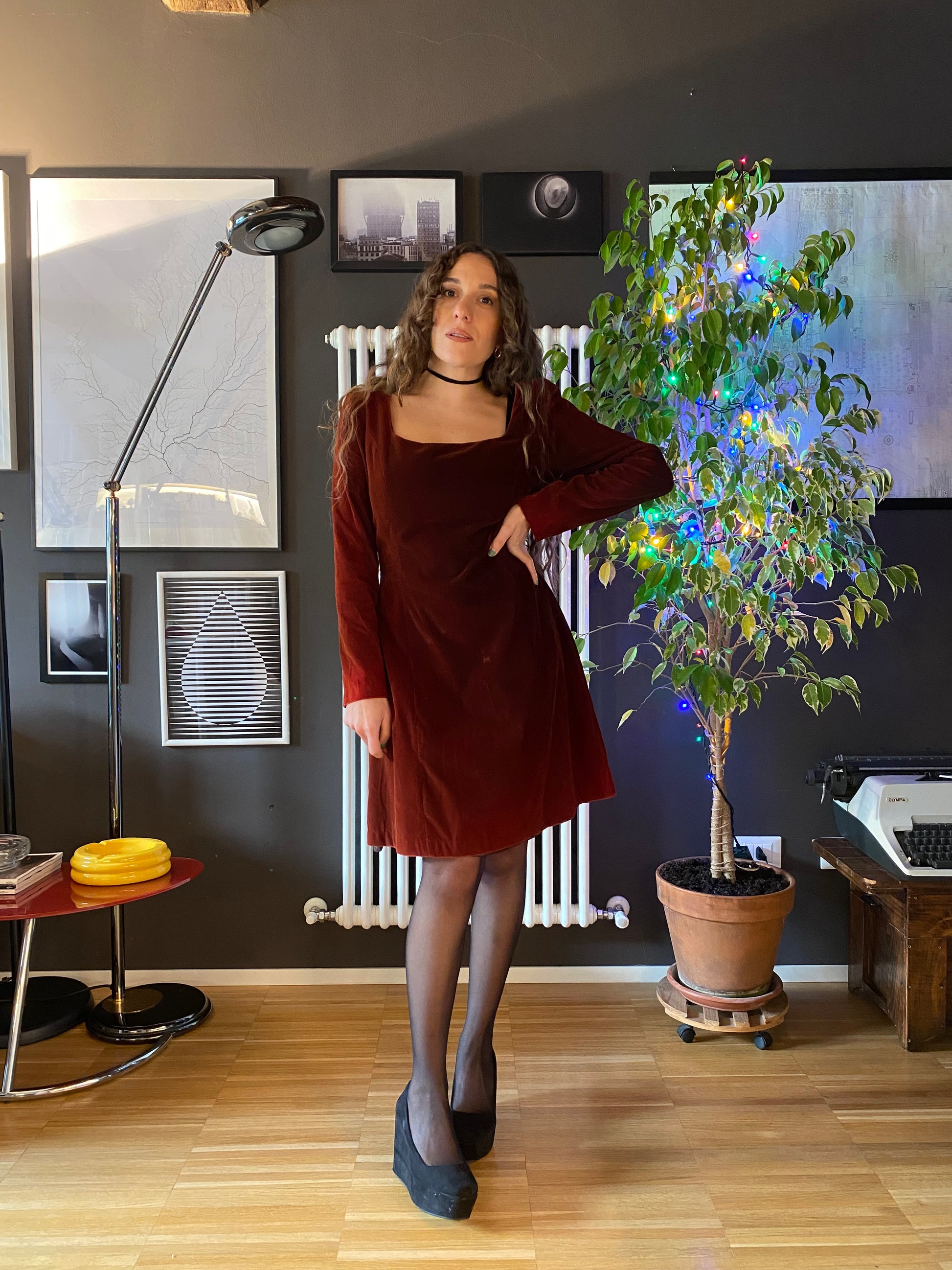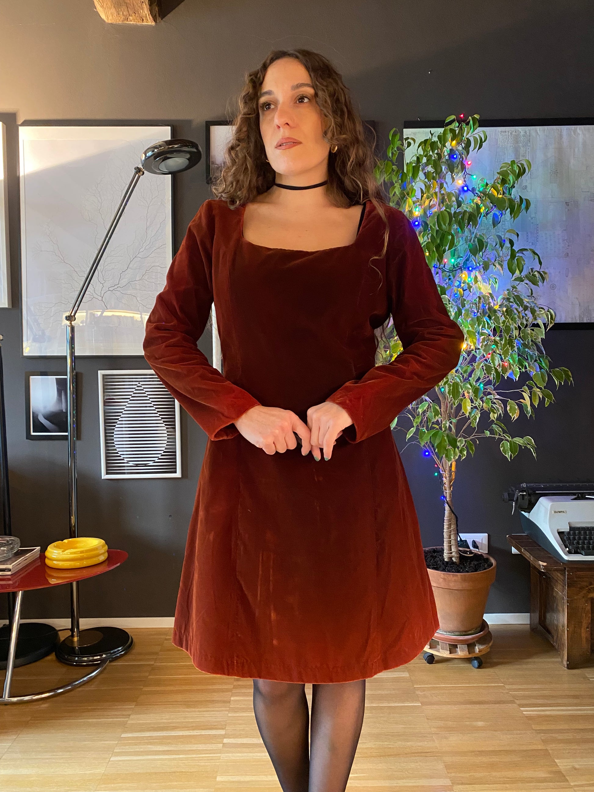Meraviglioso abito in velluto anni ’90, colore rosso bruciato/borgogna, con scollo squadrato e maniche lunghe. Linea leggermente svasata che valorizza la figura senza stringere.