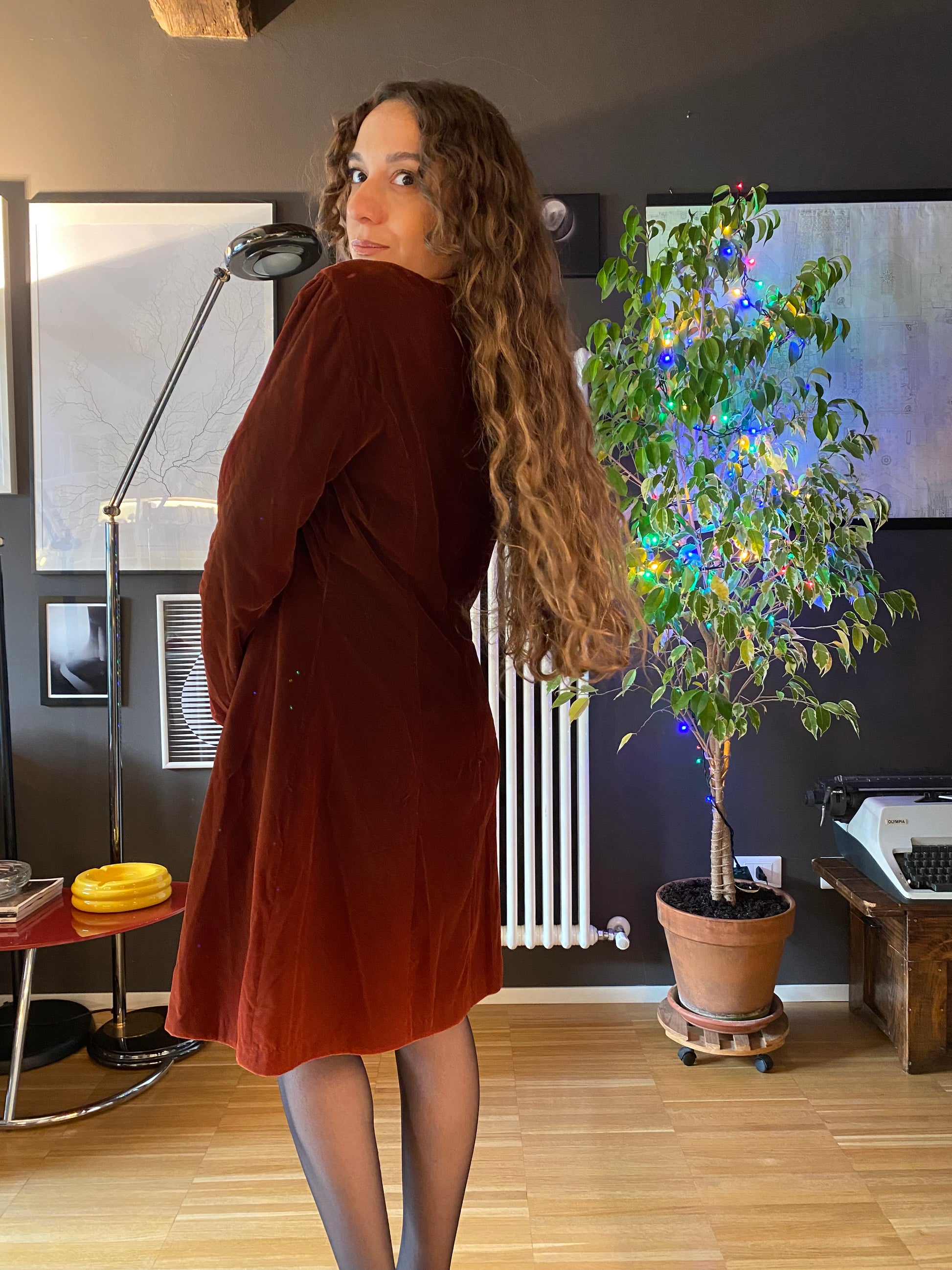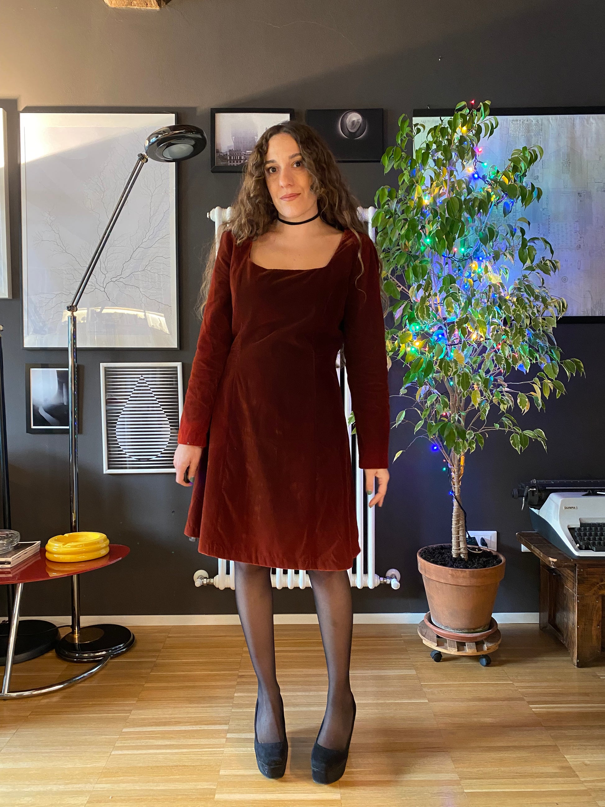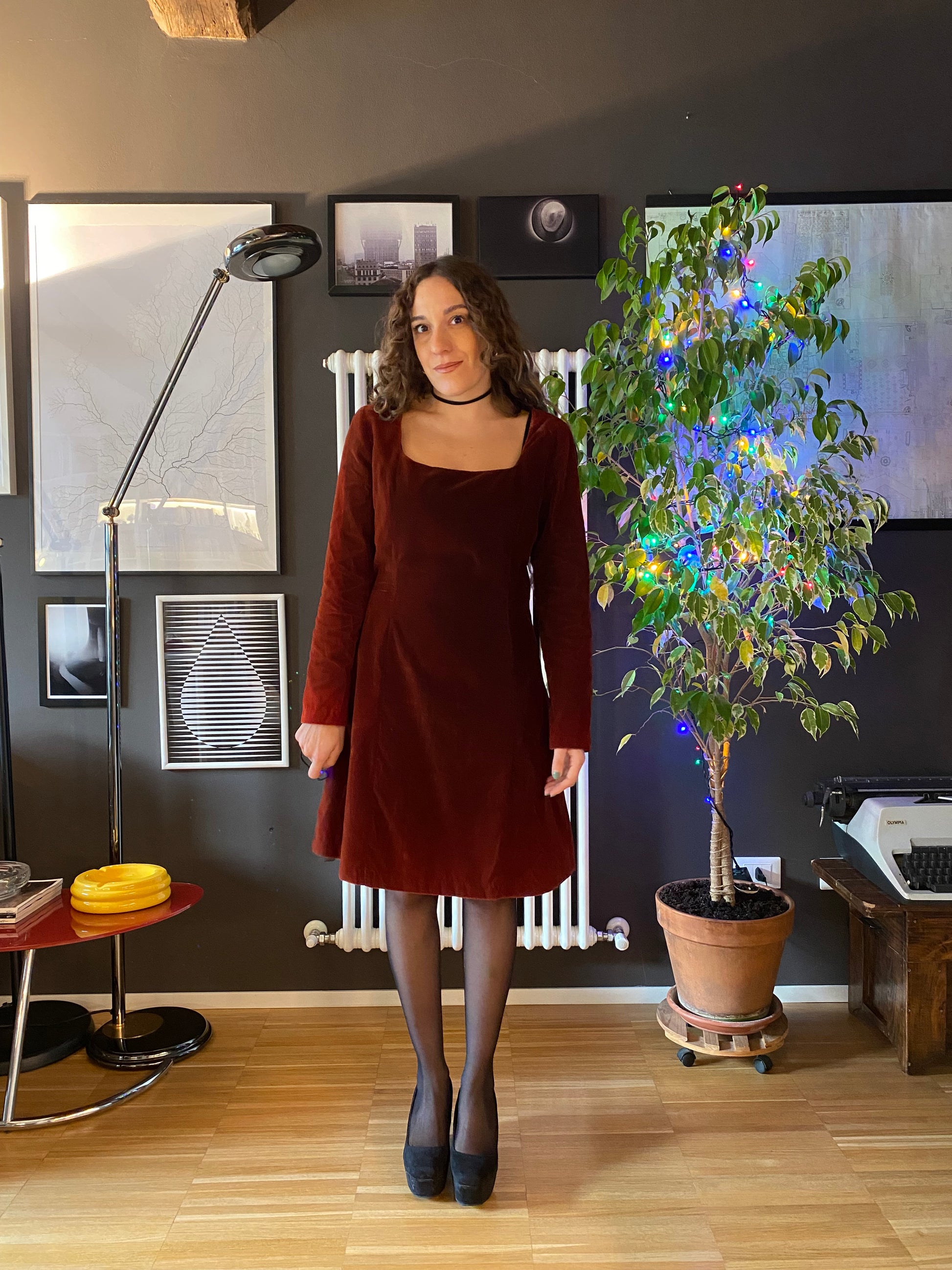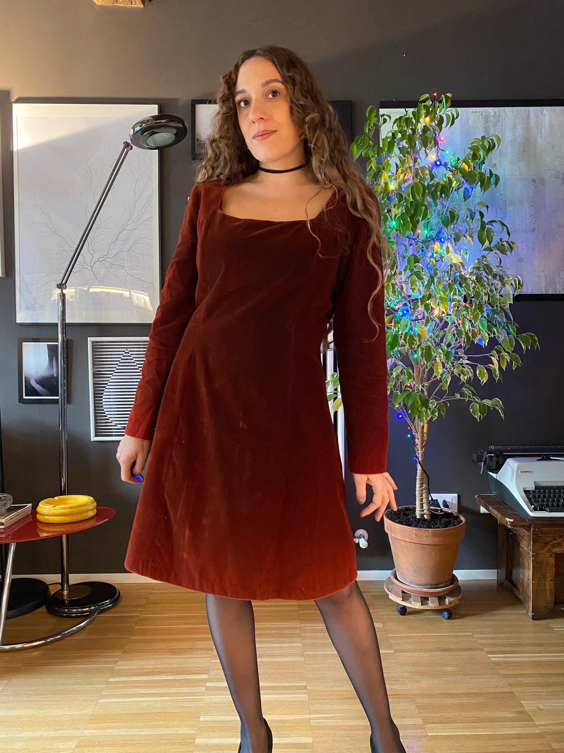 Meraviglioso abito in velluto anni ’90, colore rosso bruciato/borgogna, con scollo squadrato e maniche lunghe. Linea leggermente svasata che valorizza la figura senza stringere.