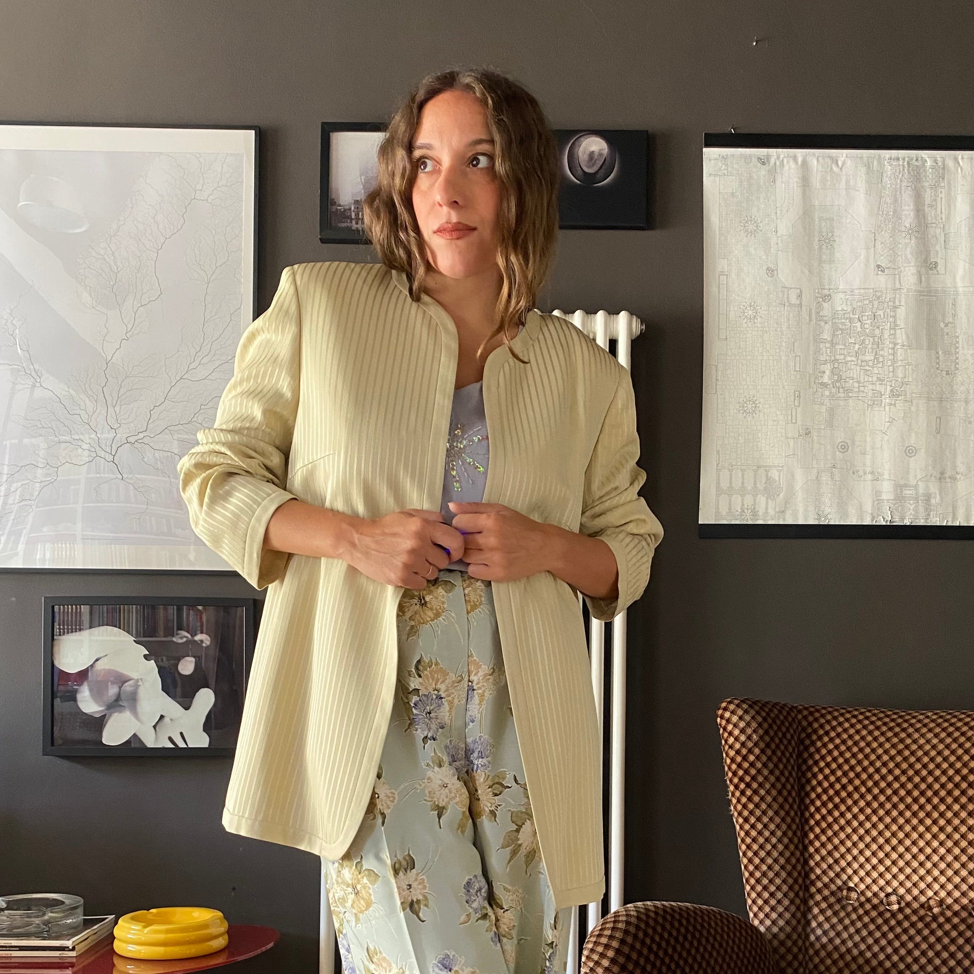 Super blazer anni 80 made in Italy, senza bottoni e con scollo tondo.