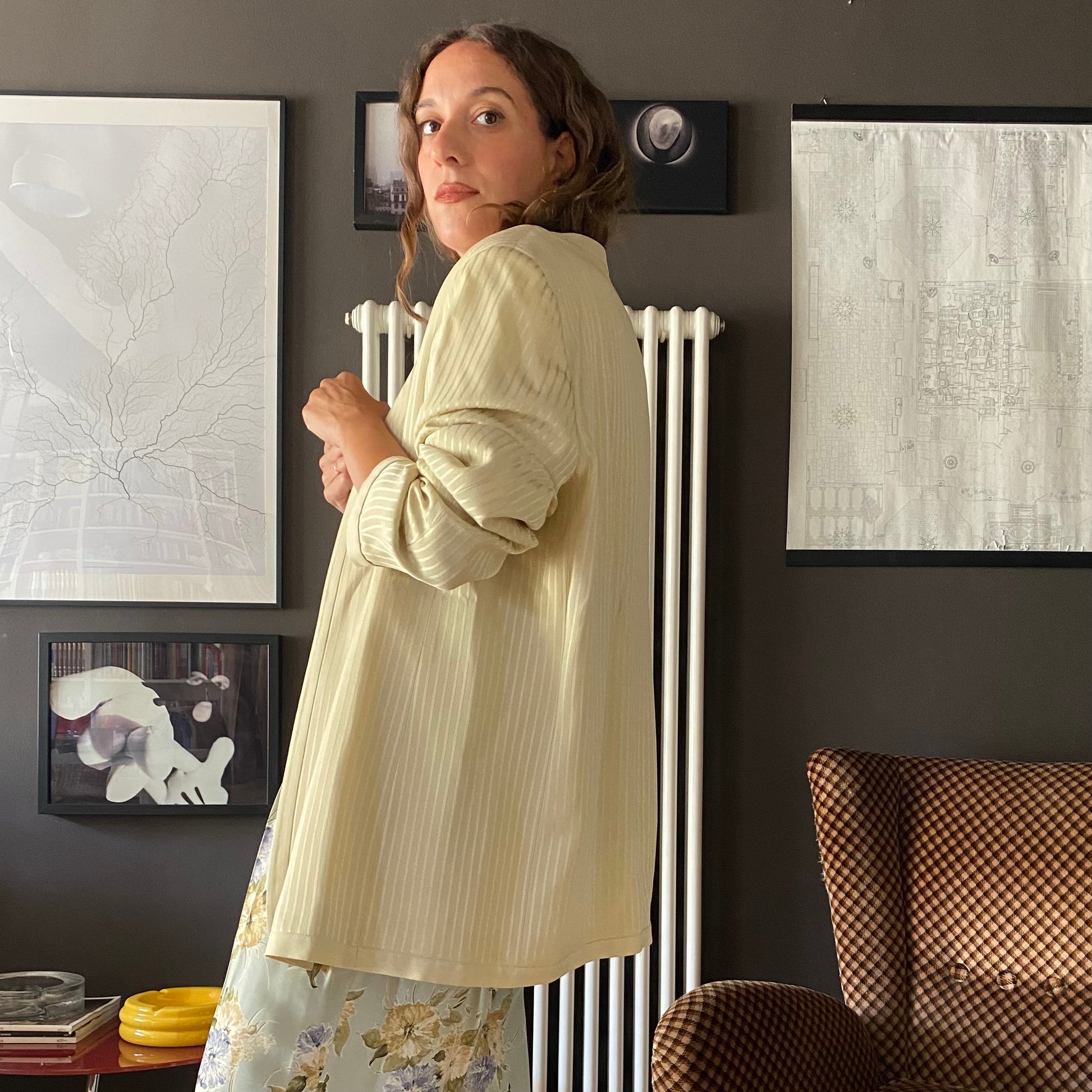 In tessuto lucido, fantasia gessata tono su tono color beige. Spalle imbottite, non si possono togliere le spalline a meno di non interbenire sulla fodera.