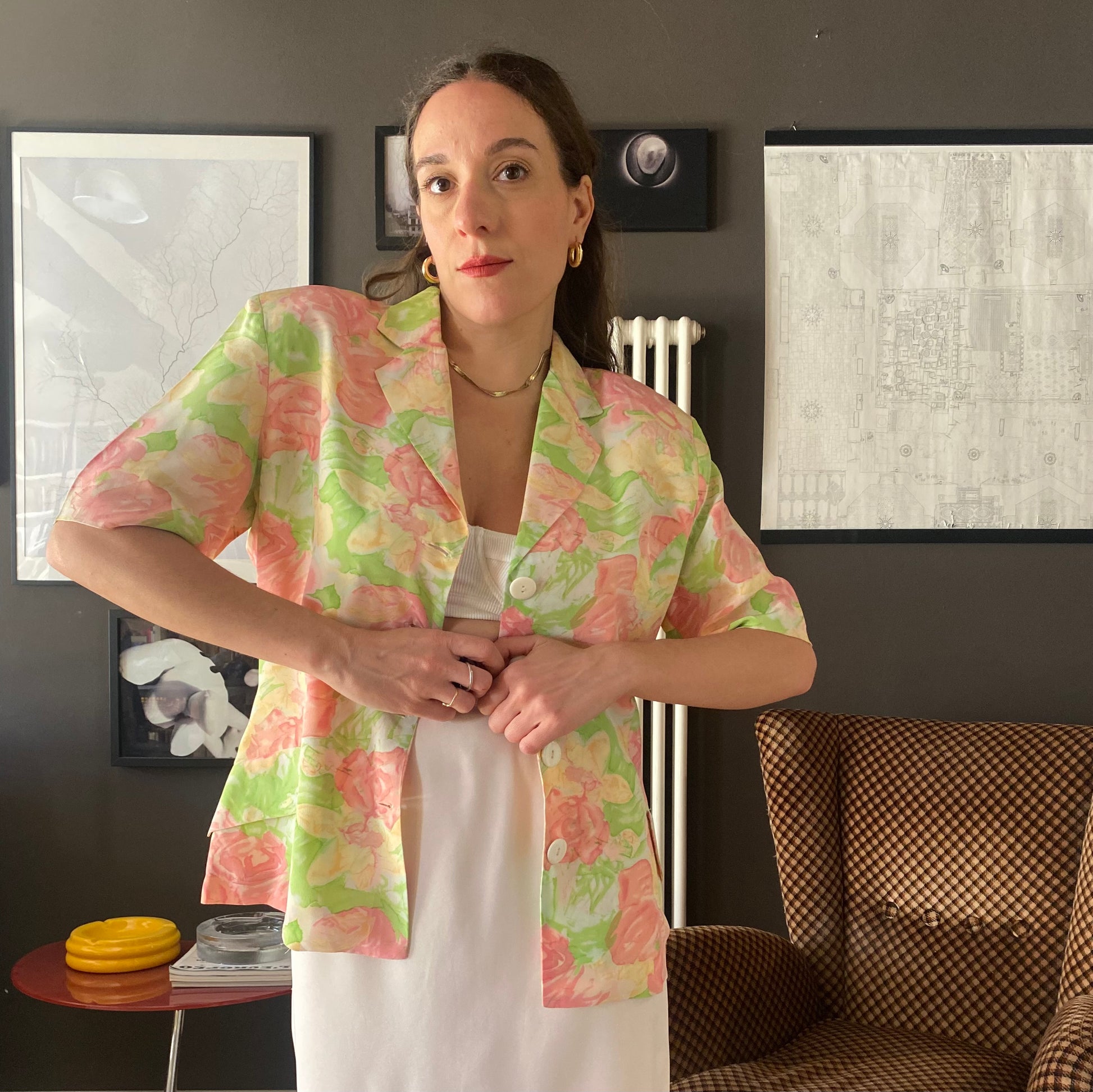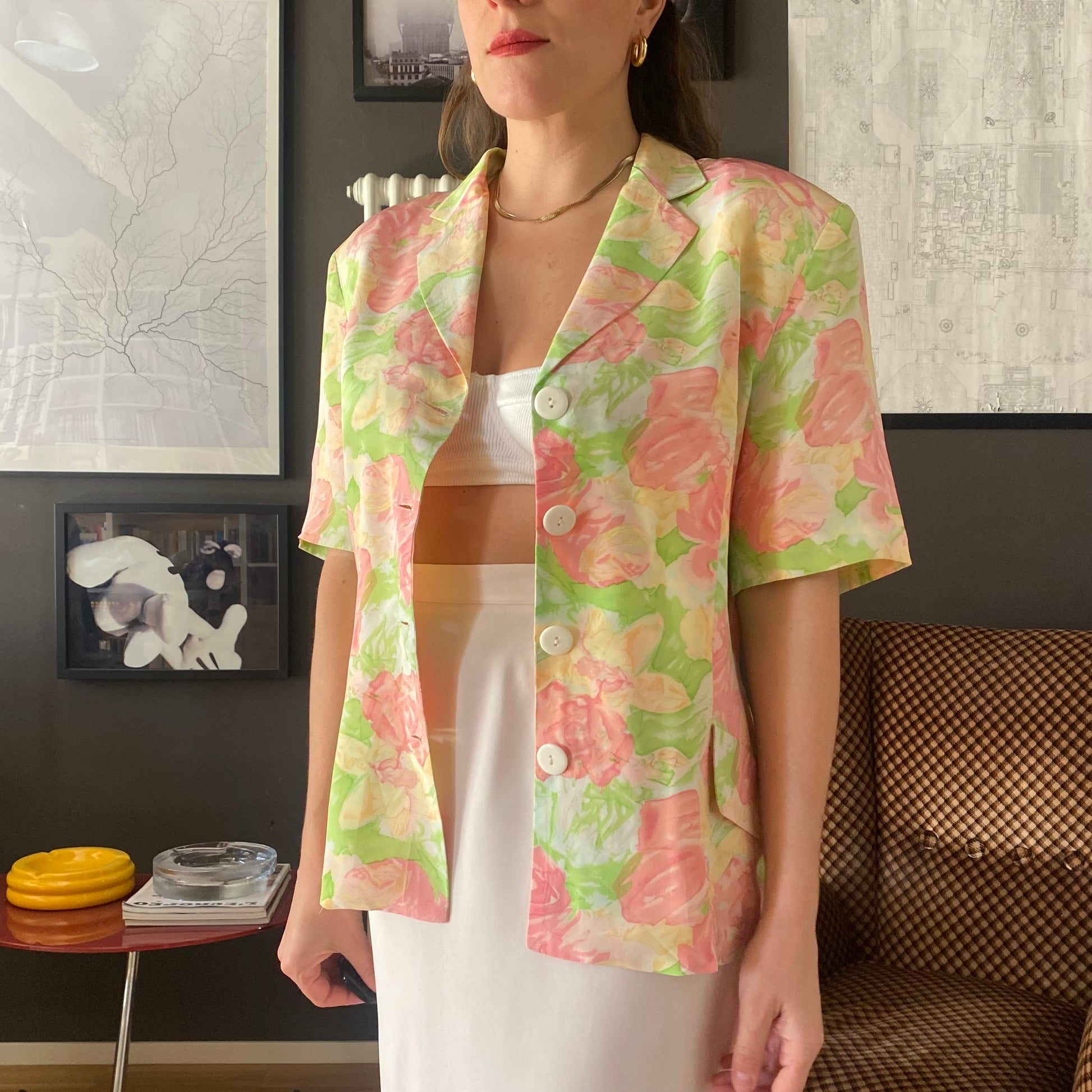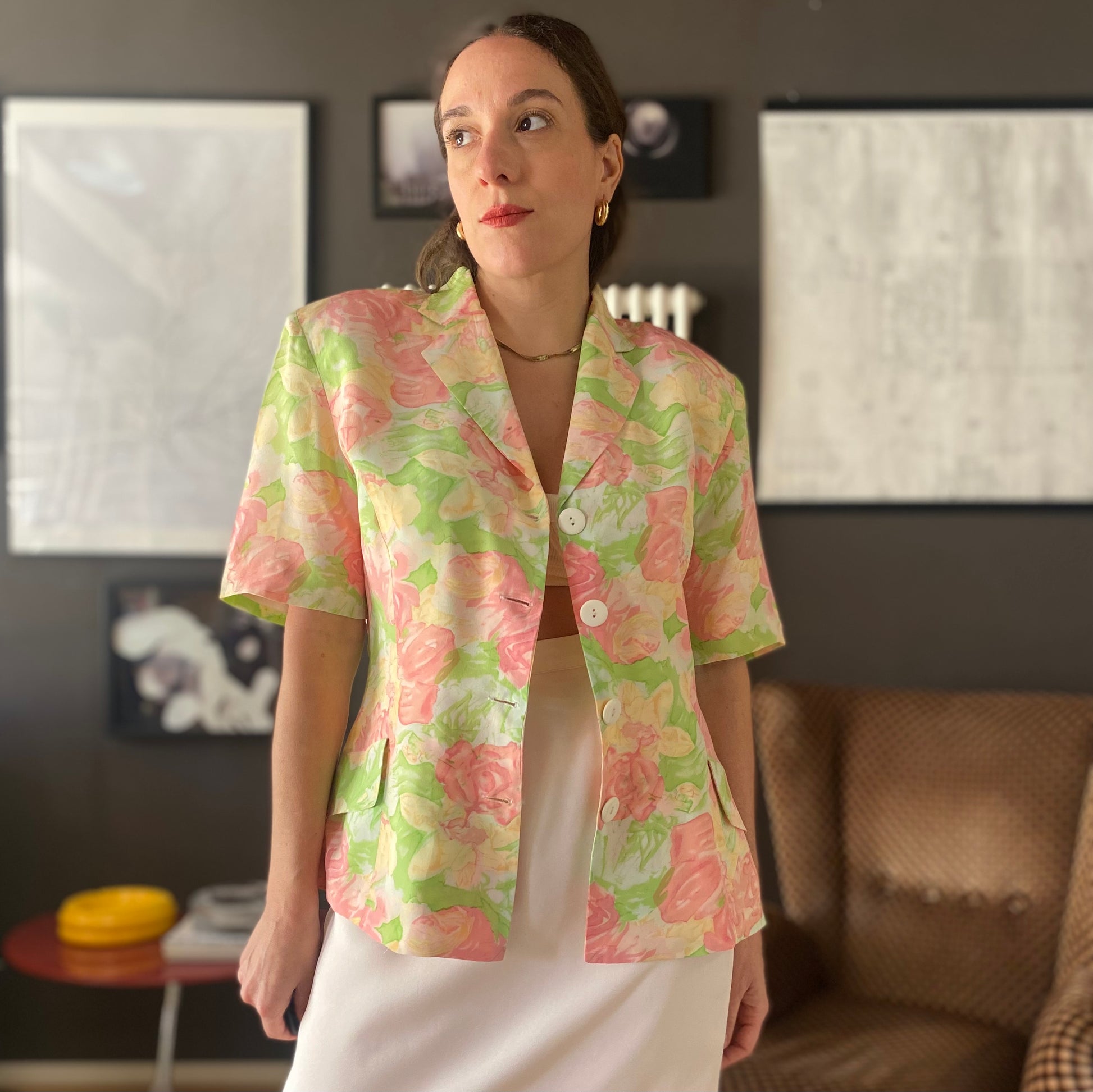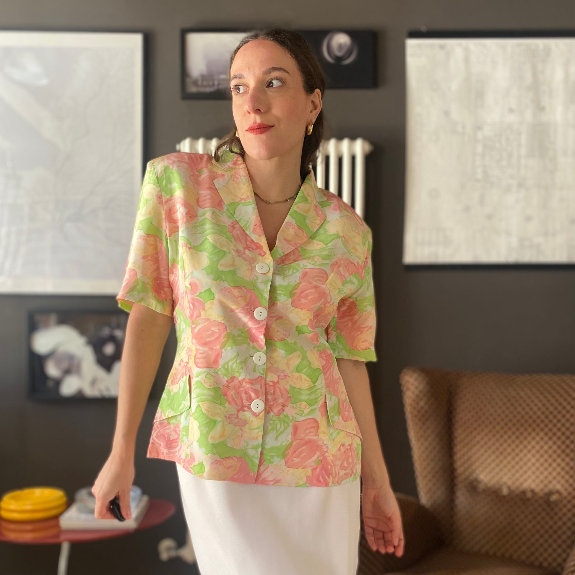 Giacca in seta a maniche corte dai toni pastello del rosa e del verde. Chiusura con quattro bottoni, finte tasche e spalline che possono essere rimosse.