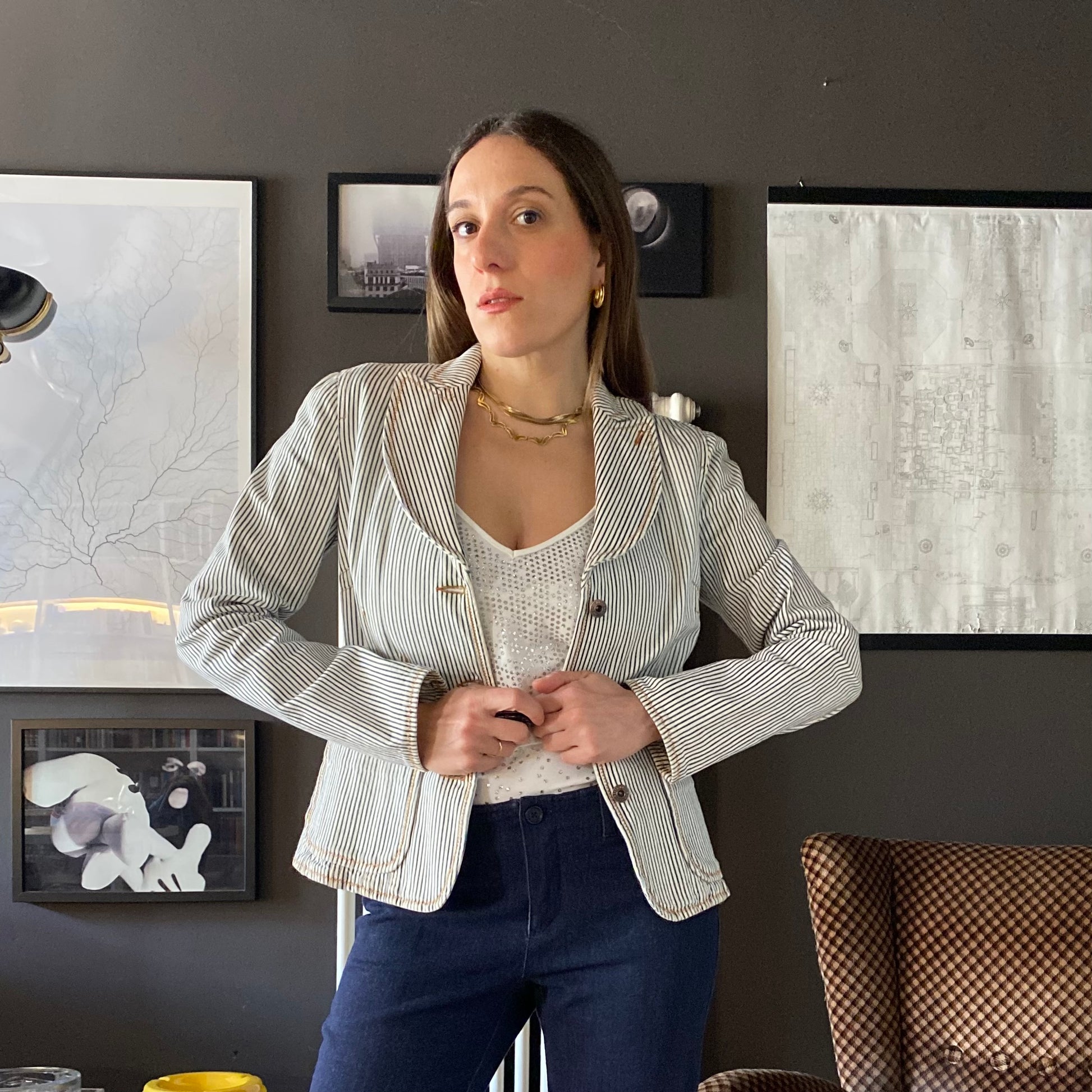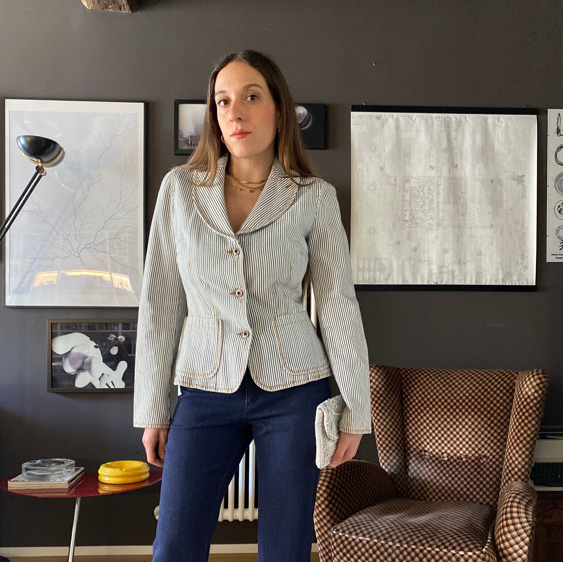 Denim blazer Moschino gessato blu su fondo bianco, super slim anni 2000.