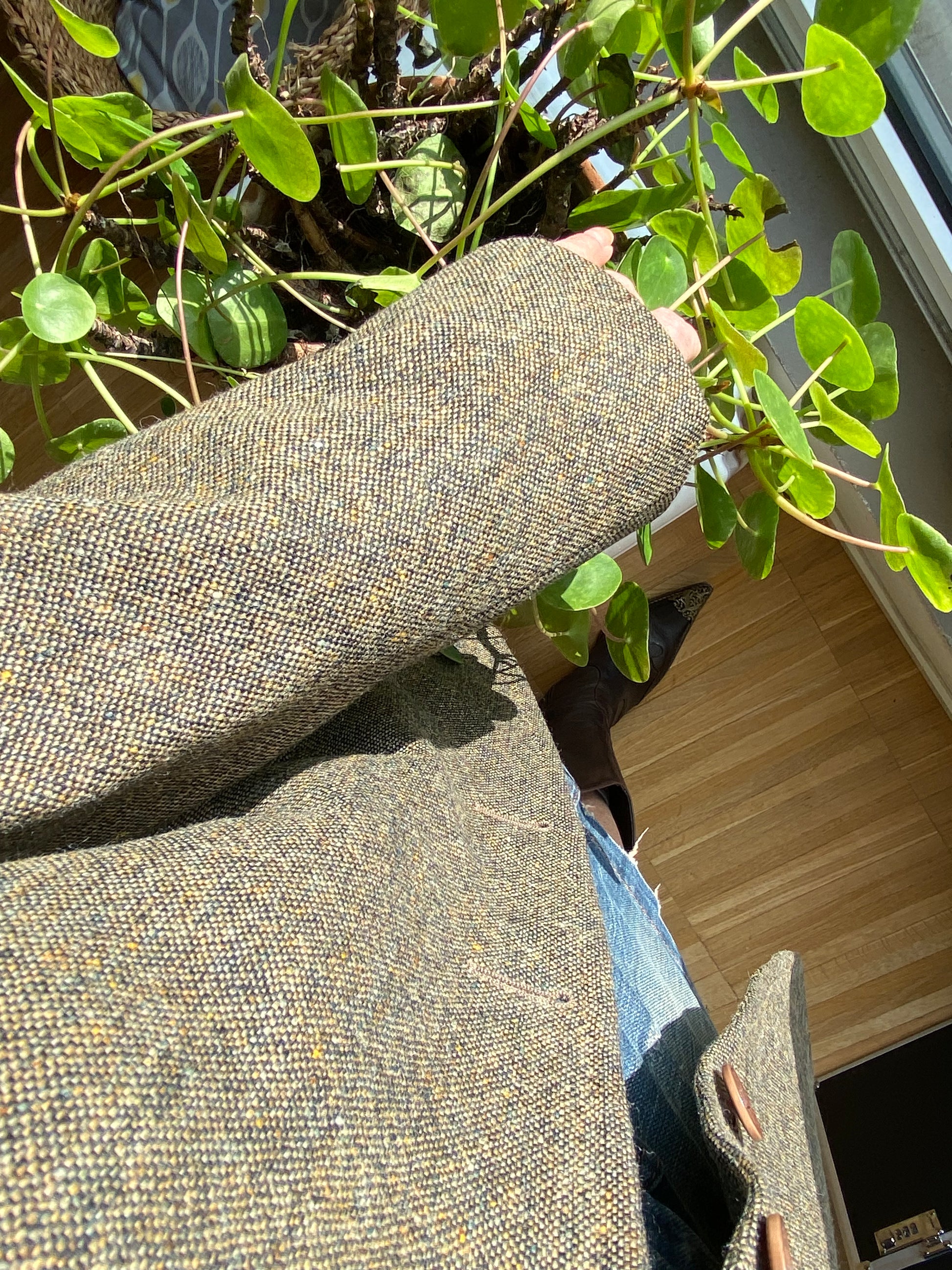 Toni del tortora, fantasia melange con tocchi color arancio, beige e verde scuro.