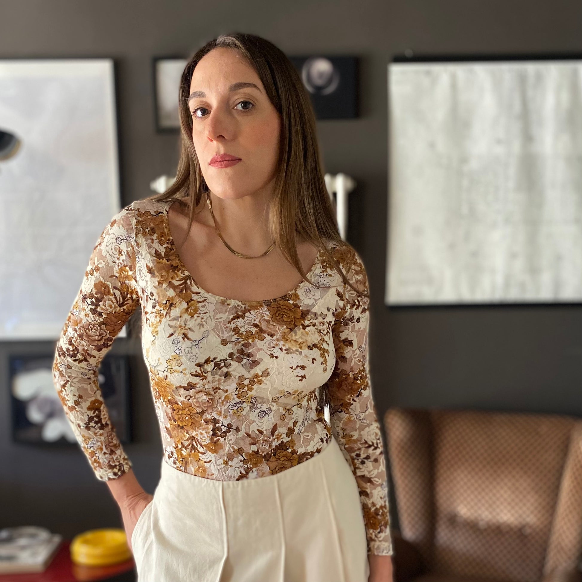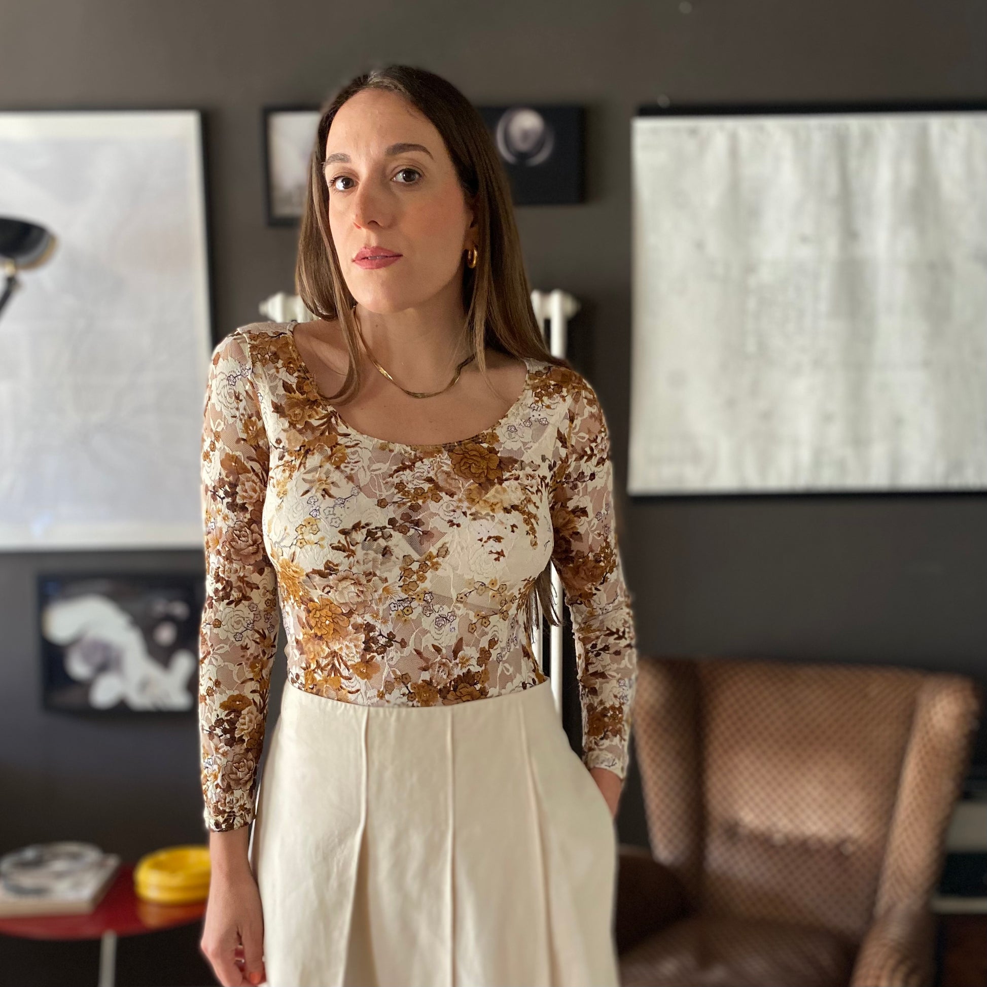 Body vintage elasticizzato in tessuto traforato tipo pizzo con disegni a fiori e foglie dai toni del bianco e dei marroni.