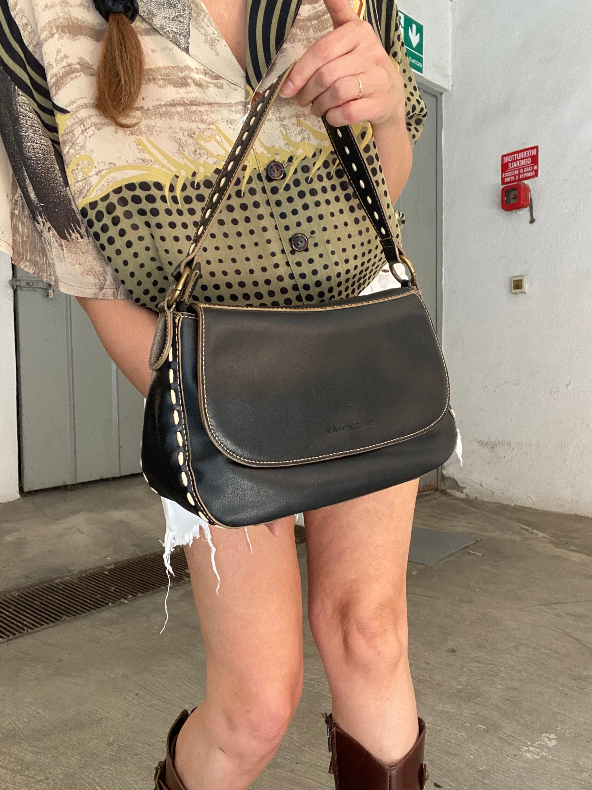 Borsa "satchel" a spalla da donna in simil pelle con impunture beige e chiusura con magnete oro e cerniera.