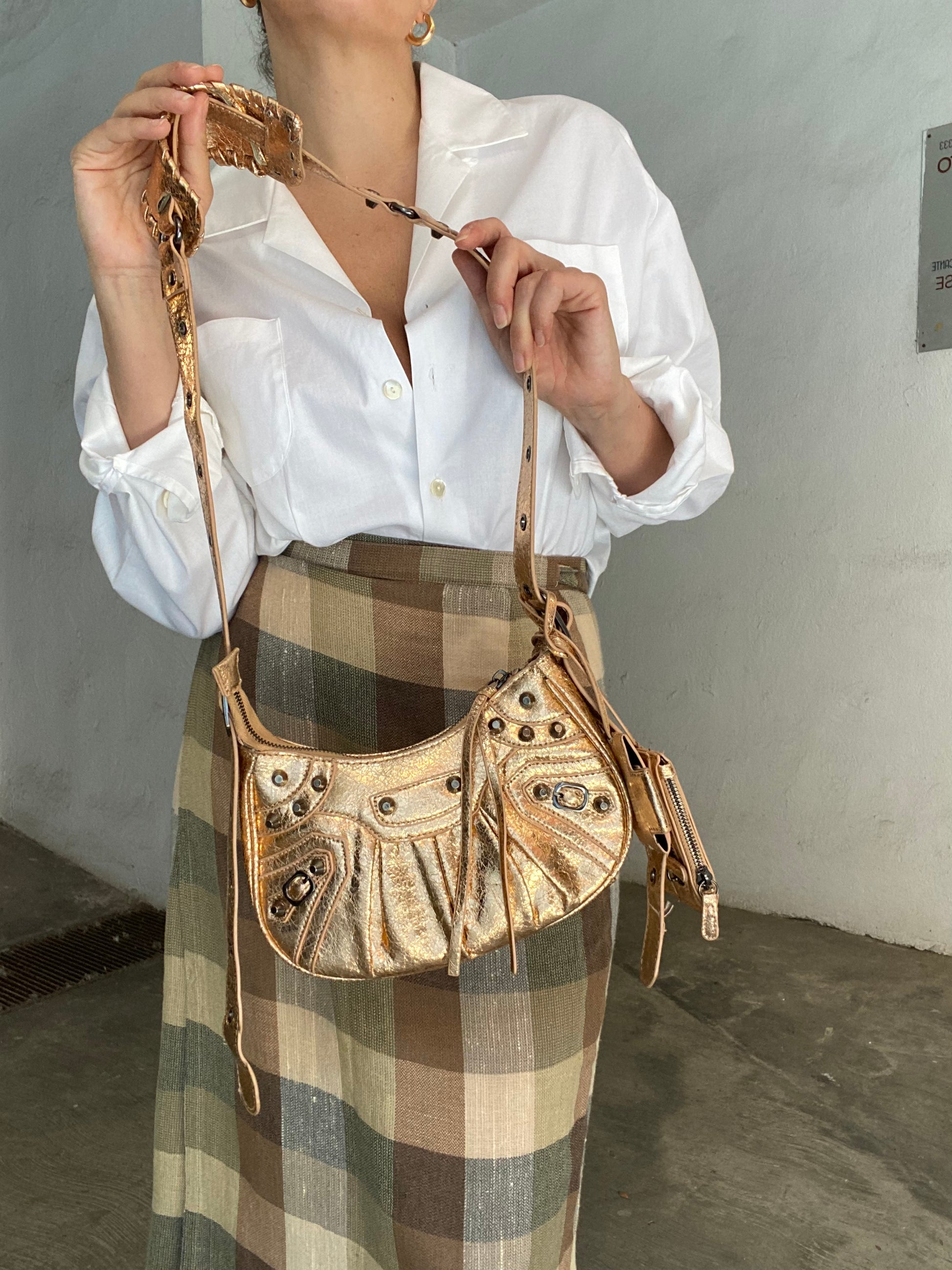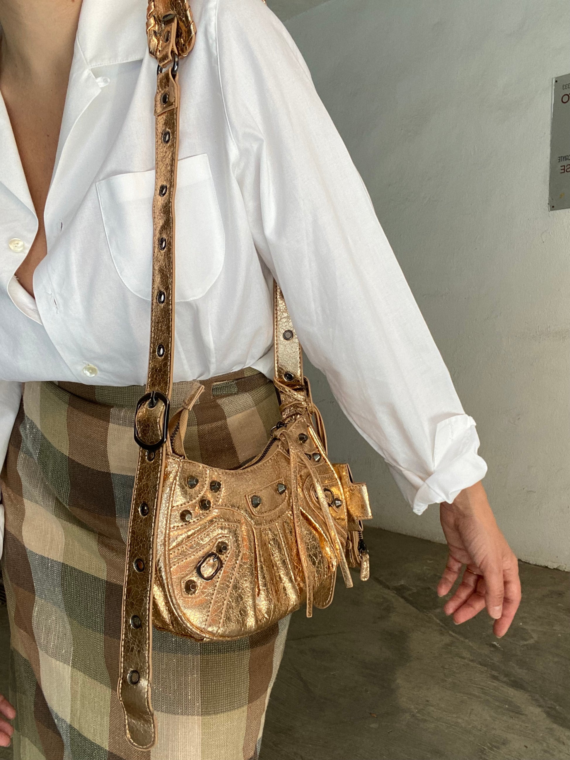 Borsa in ecopelle effetto vernice color oro cpn borchie e ciondoli.