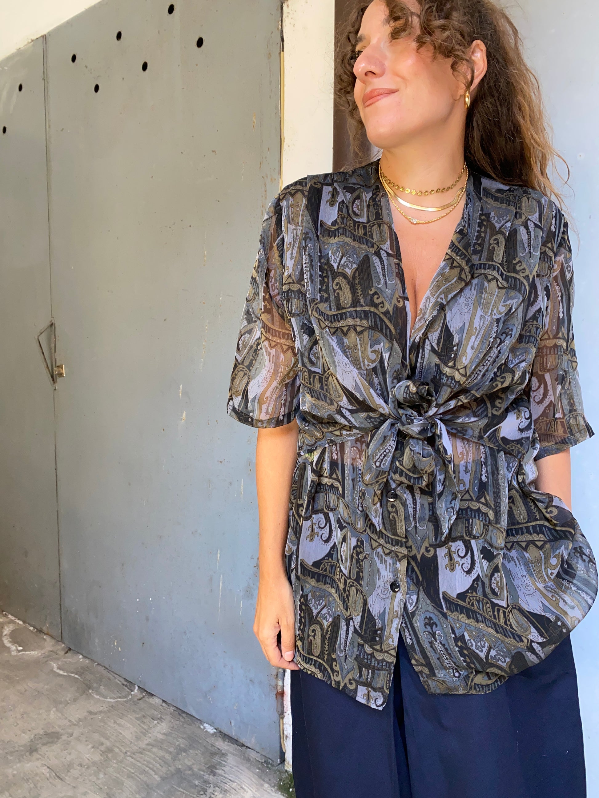 In tessuto leggero e semi-trasparente con stampa geometrico-paisley nei toni del grigio, nero e marrone.