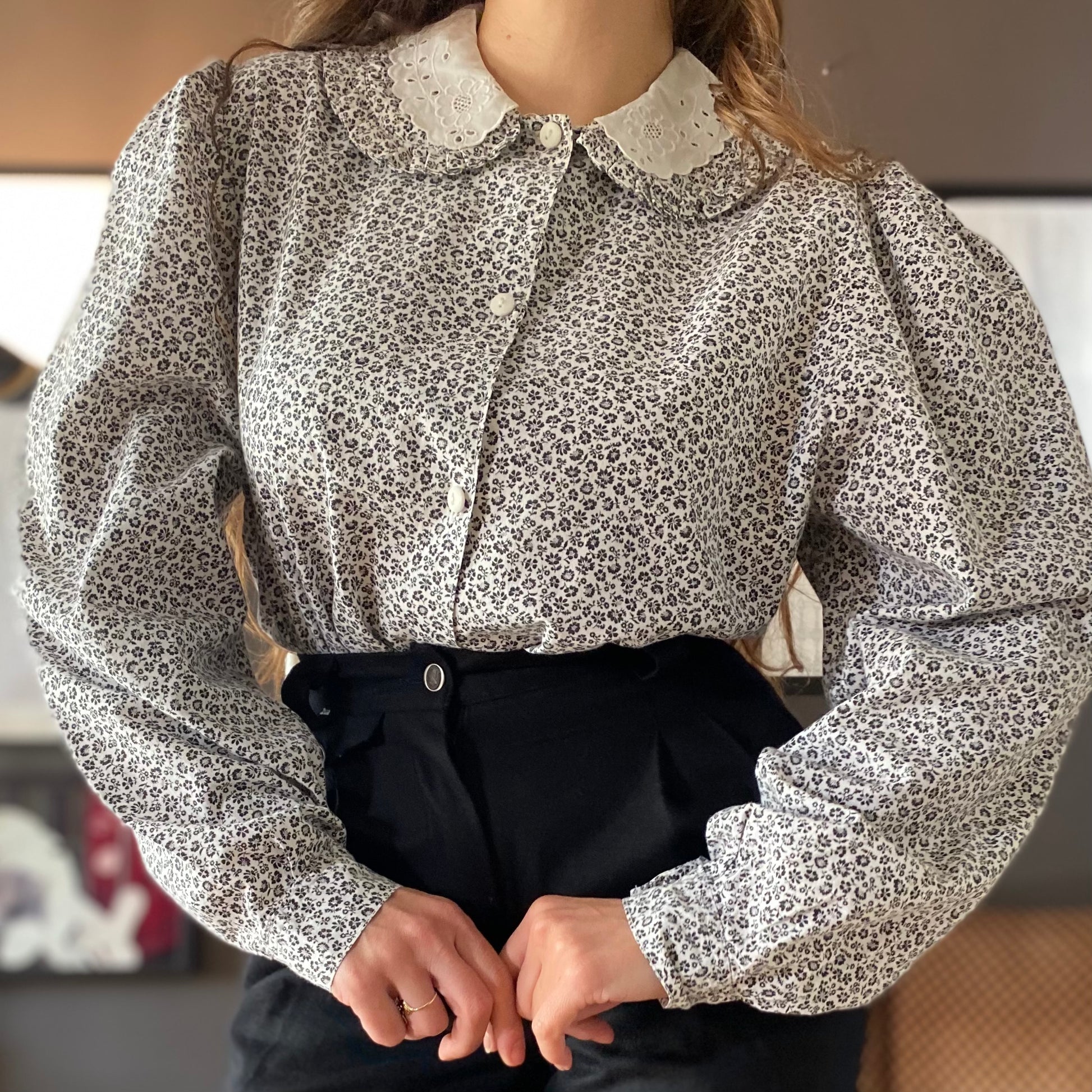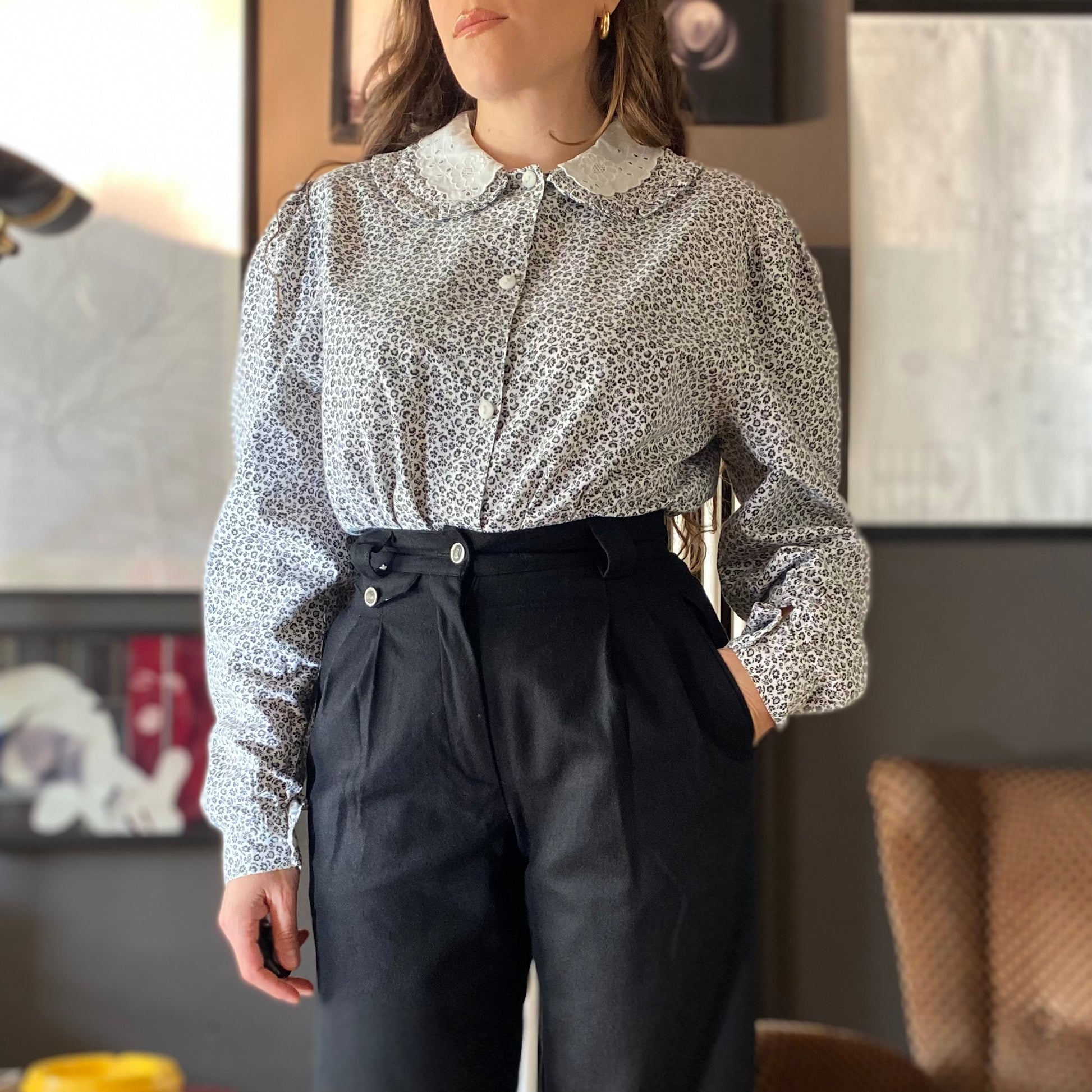 Dolcissima camicia in cotone black and white con fantasia a microfiorellini neri. Dobbio colletto arricciato, quello sotto della stessa fantasia della camicia, quello superiore bianco in merletto ricamato.