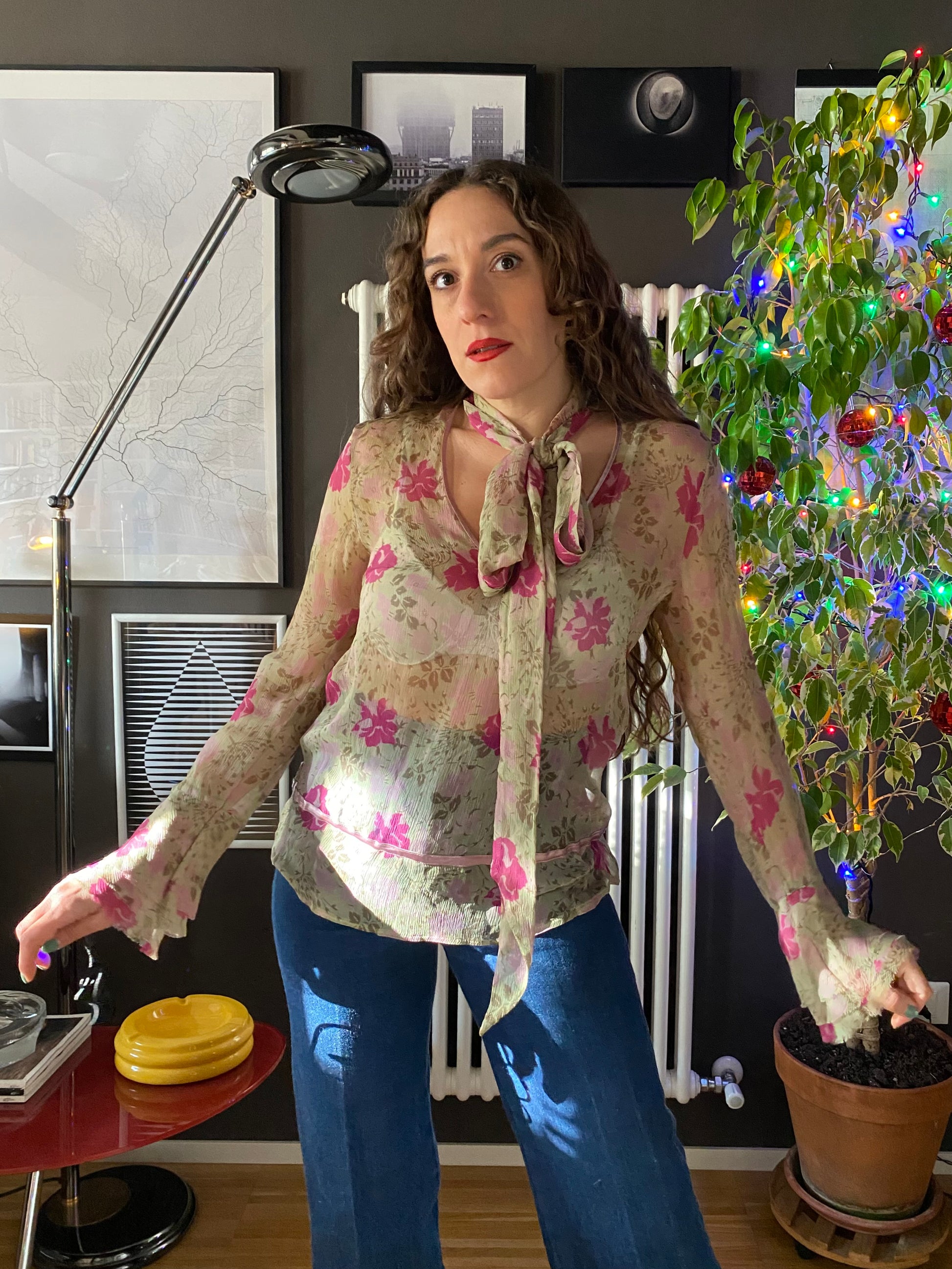 Leggerissima blusa/camicia in seta con scollo a V con sciarpina incorporata in tessuto crespo e trasparente, morbidissimo.