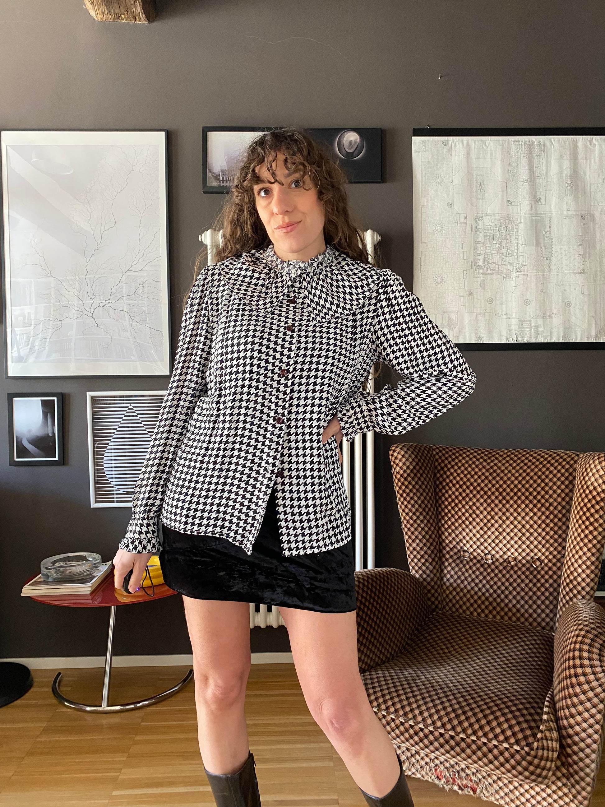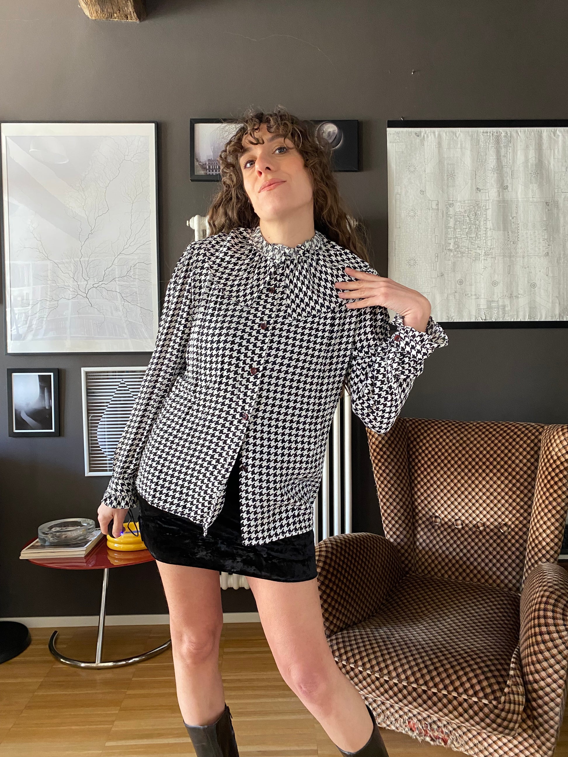 Camicia dalla linea morbida con maniche lunghe leggermente arricciate e collo maxi, che richiama un’eleganza d’altri tempi. La fantasia pied-de-poule in bianco e nero dona carattere al capo, rendendolo intramontabile e facilissimo da abbinare.