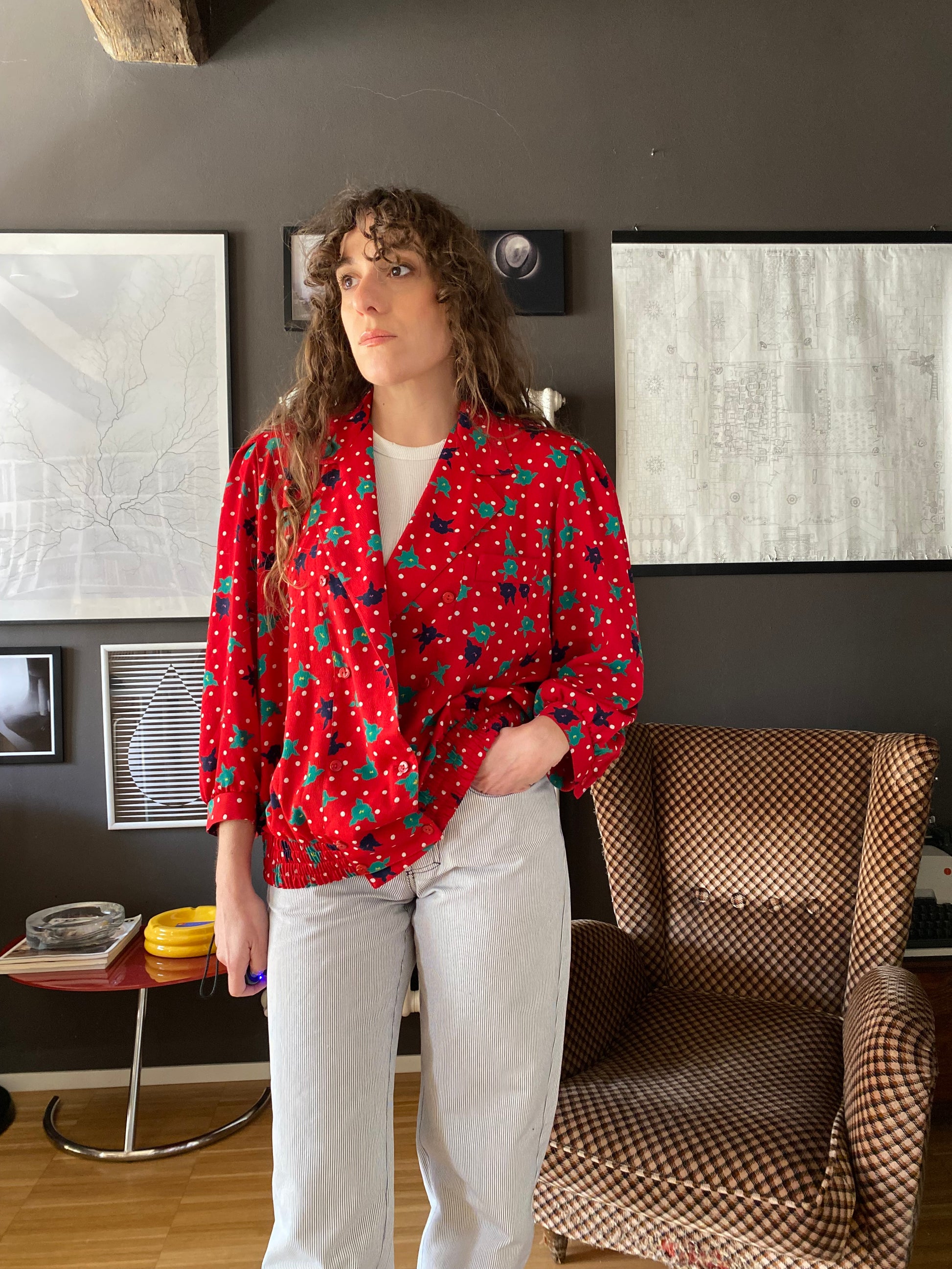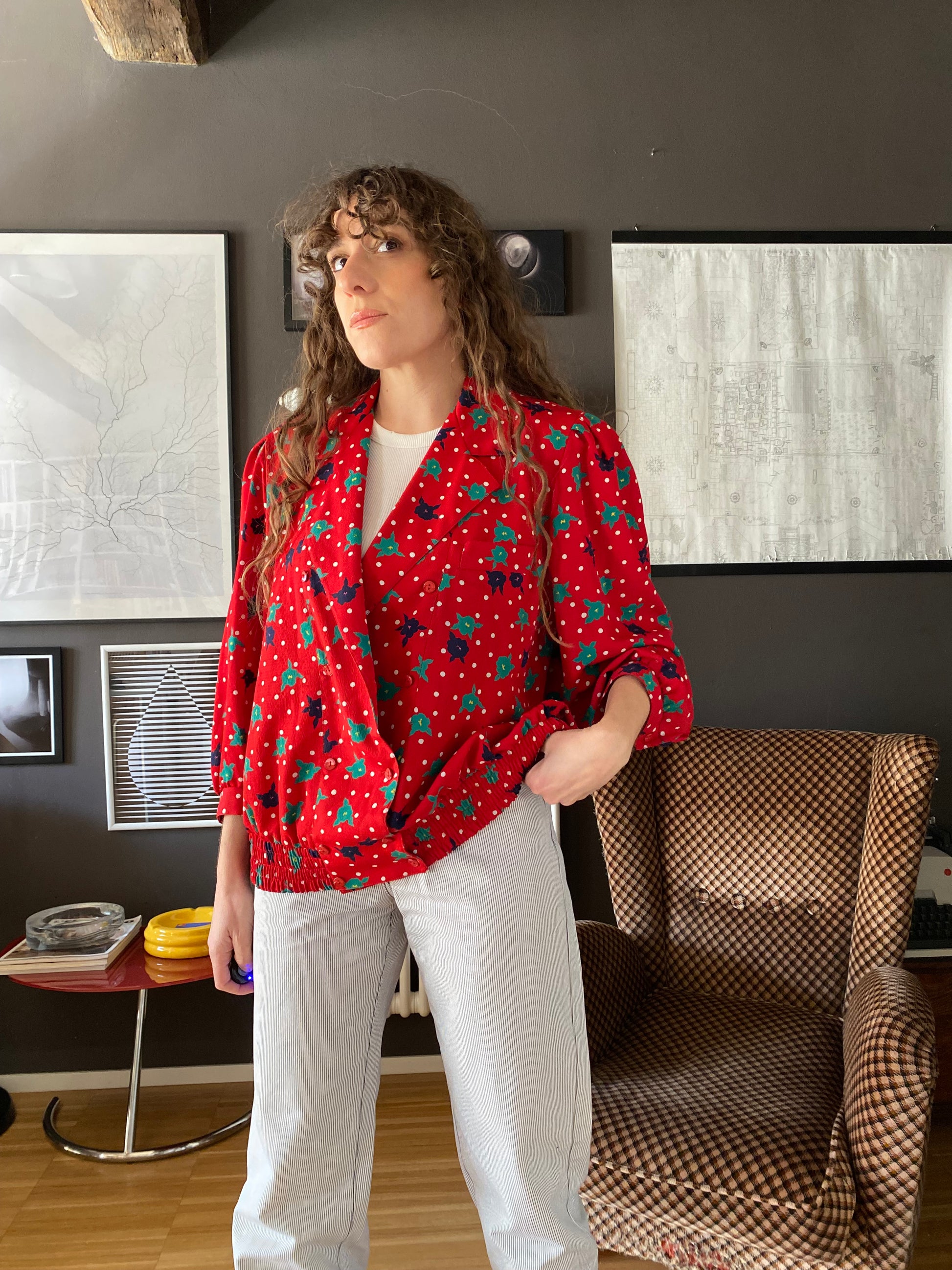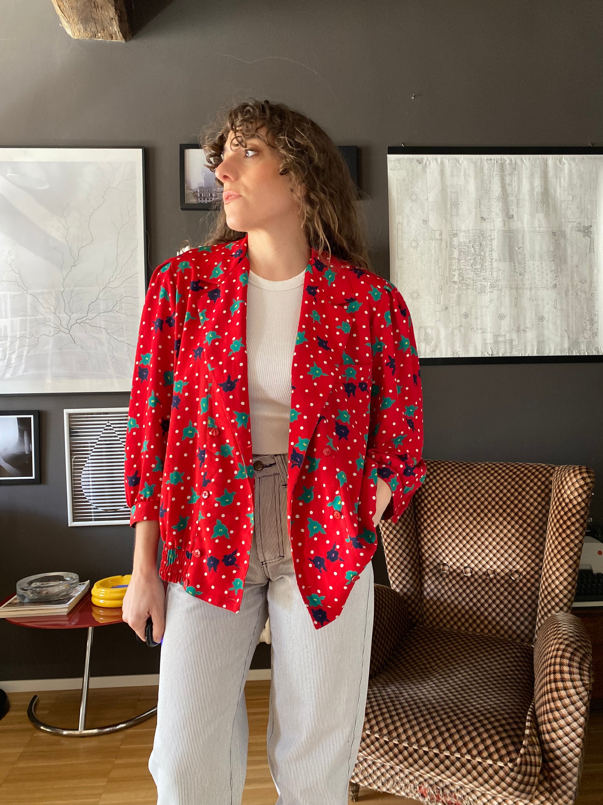 Camicia vintage dalla linea leggermente oversize con taglio morbido e spalla rilassata, completata da un colletto ampio e chiusura doppio petto. Il vero punto di forza è il tessuto: un rosso acceso animato da micro pois bianchi e fiori stilizzati nei toni del verde e del blu, con un chiaro richiamo rétro anni ’80/’90.