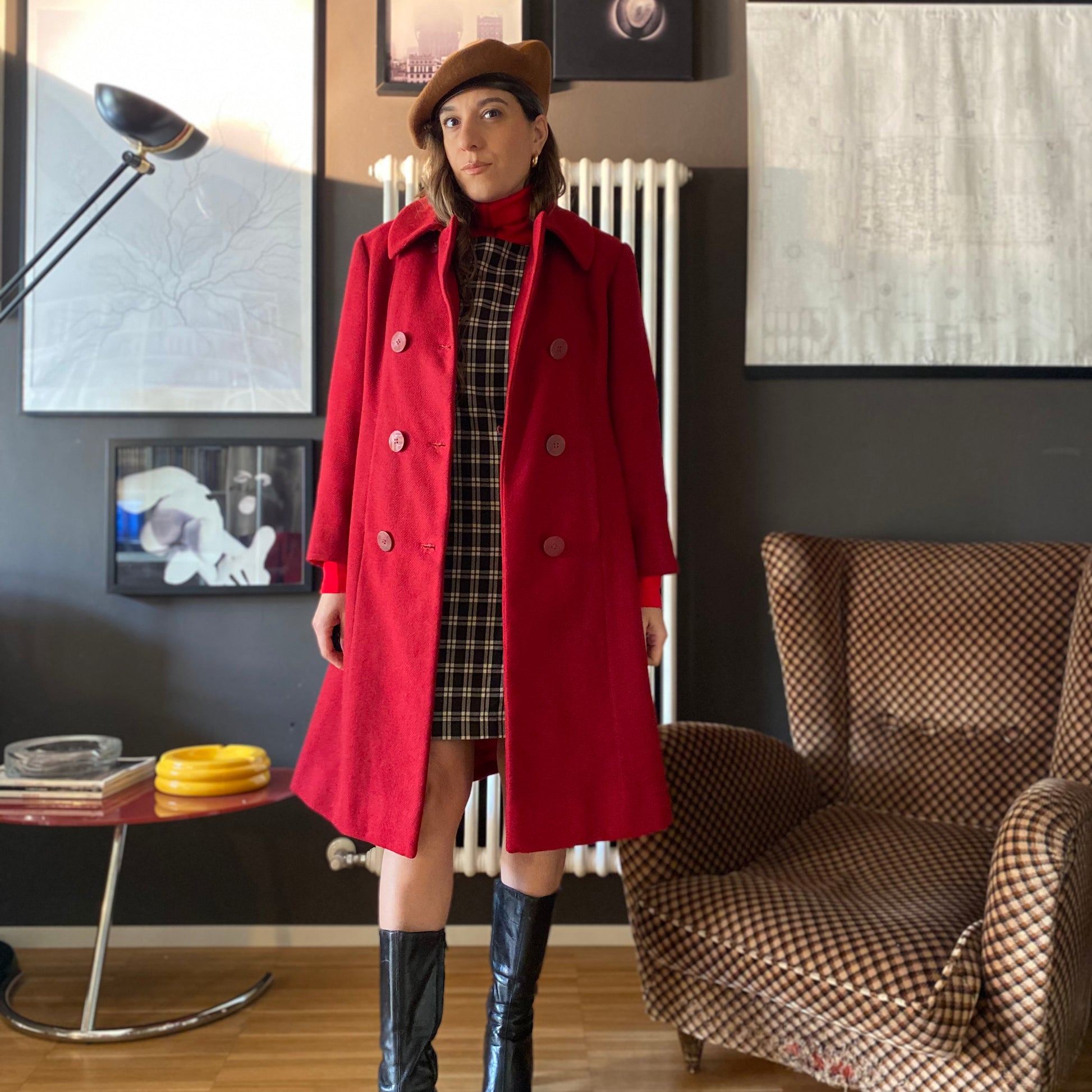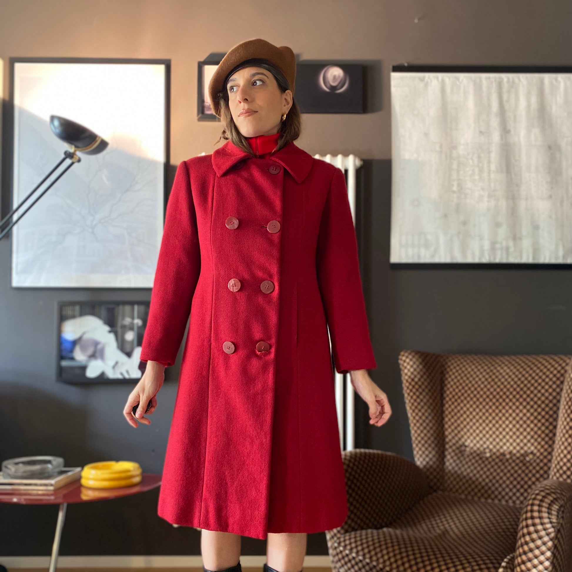 Bellissimo cappottino sartoriale, anni 60 in bel tessuto borgogna con lavorazione diagonale.