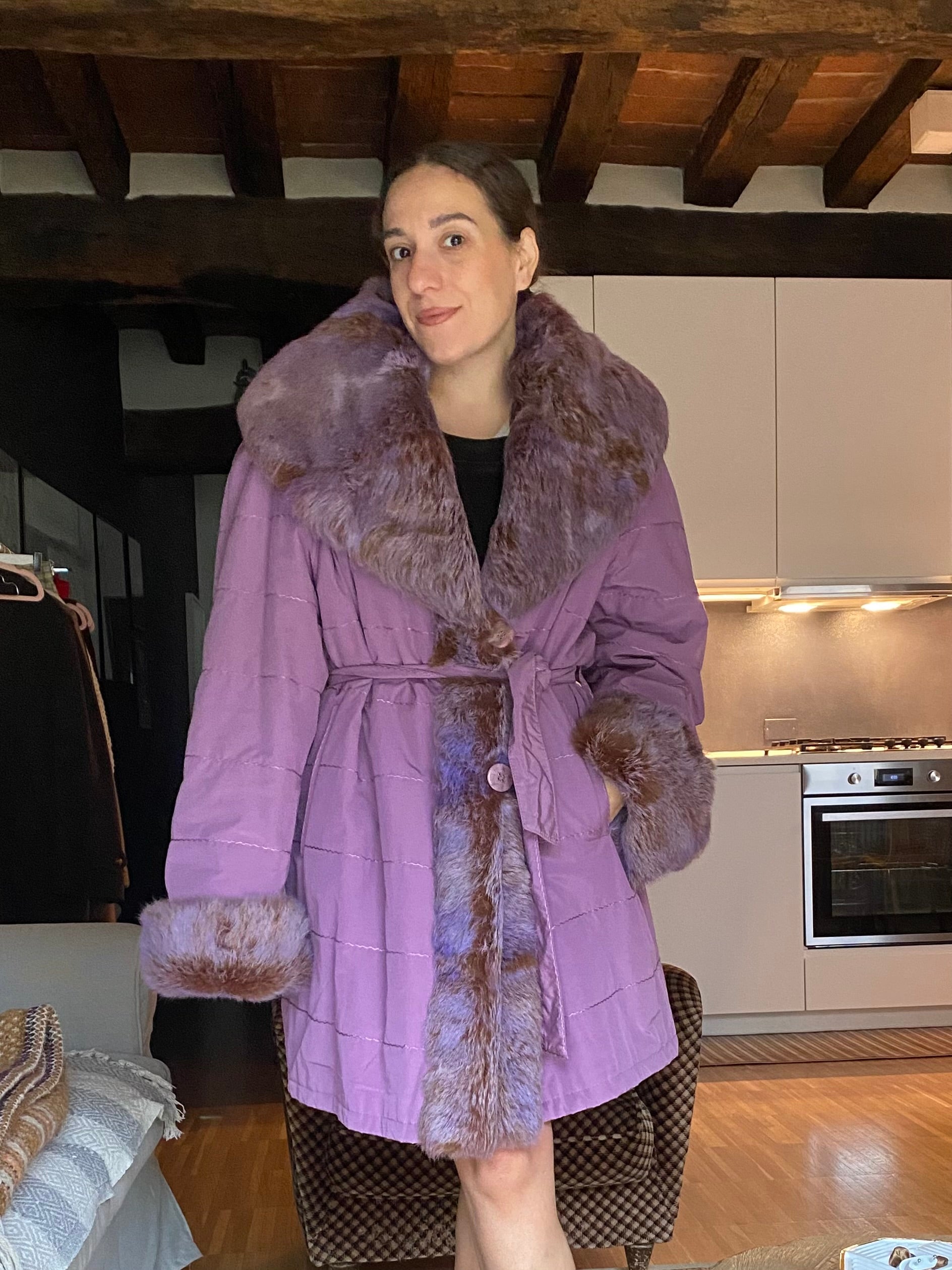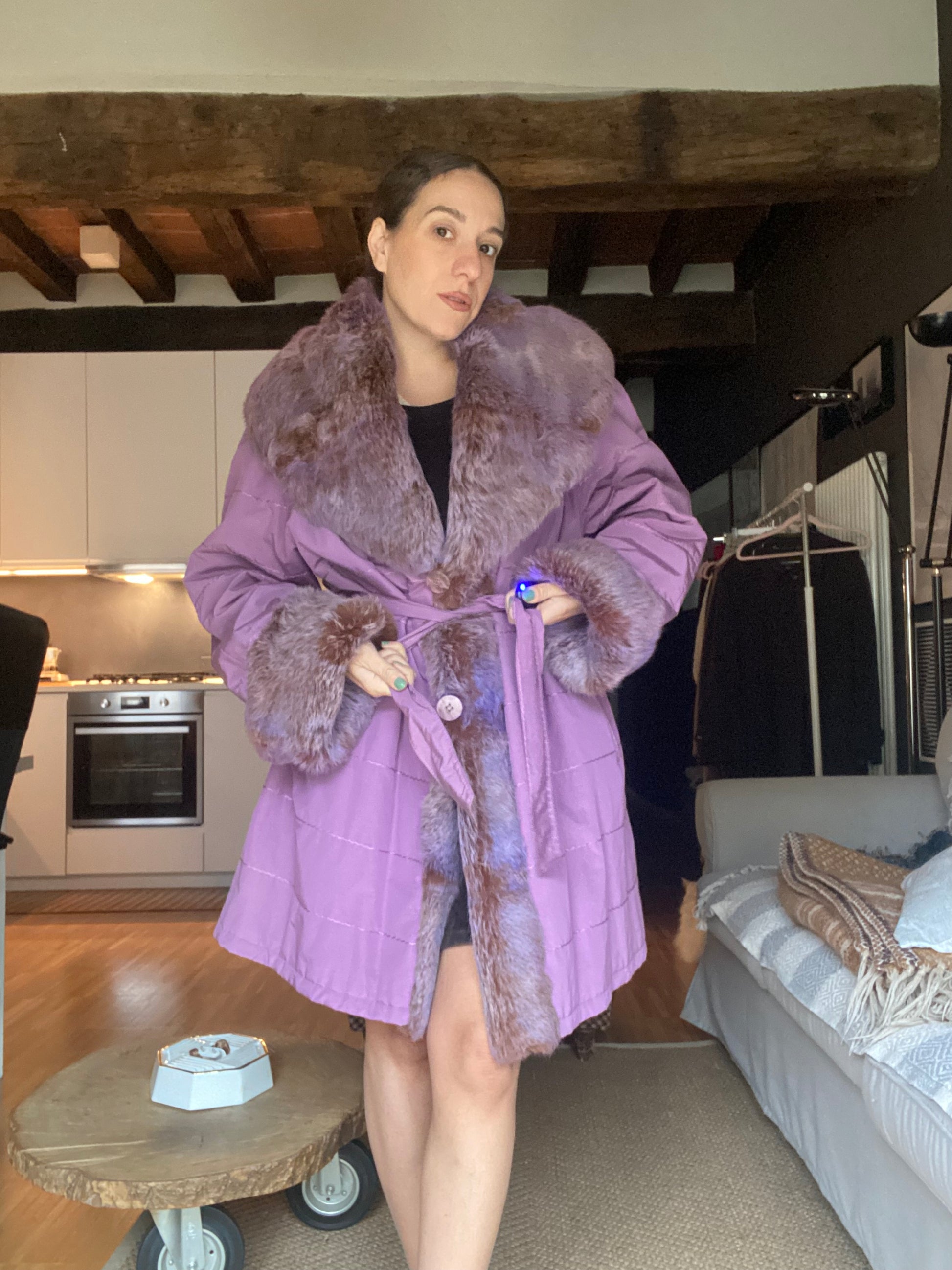 Splendido cappotto anni ’70–’80 in un meraviglioso tono lilla, con maxi collo e polsini in pelliccia tono su tono.