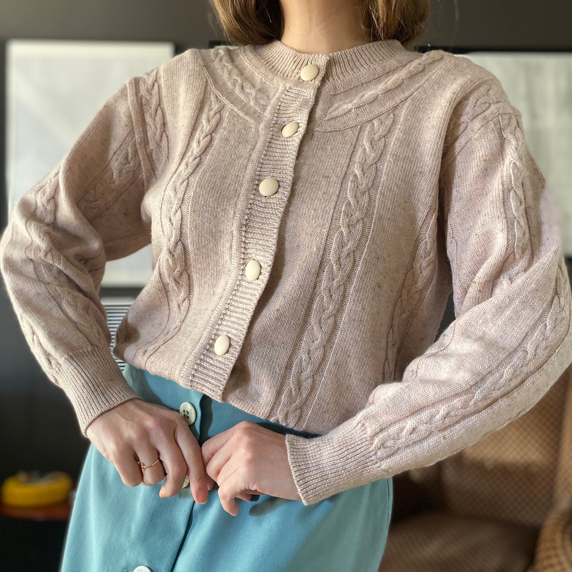 Morbidissimo cardigan rosa con scollo tondo e lavorazione a trecce alternate a grandi coste che seguono anche la linea del collo.