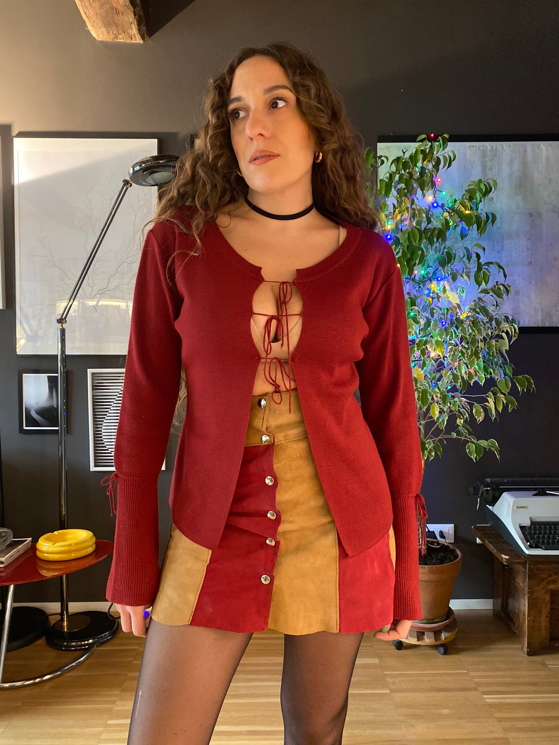 Cardigan anni 2000 con scollo tondo e chiusura con laccetti sottili per regolarne l’apertura.