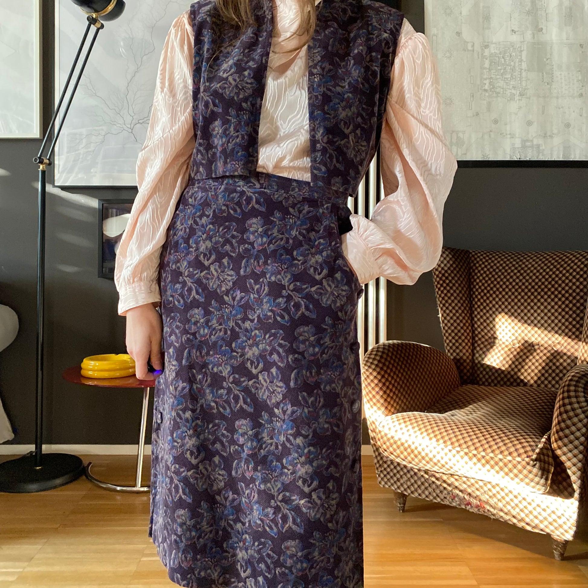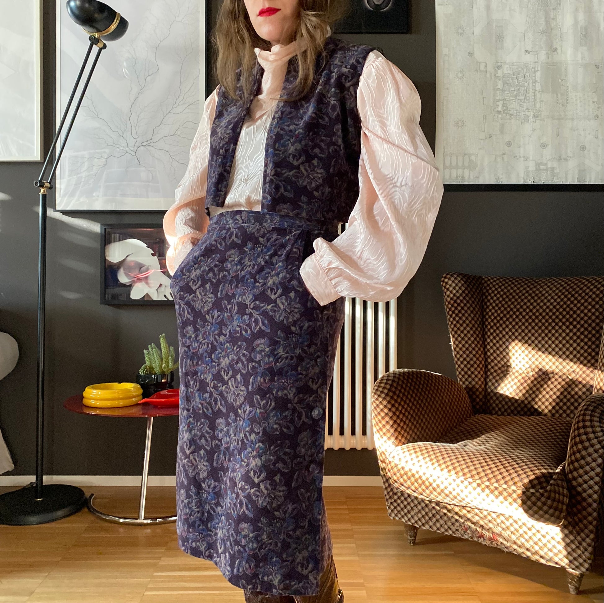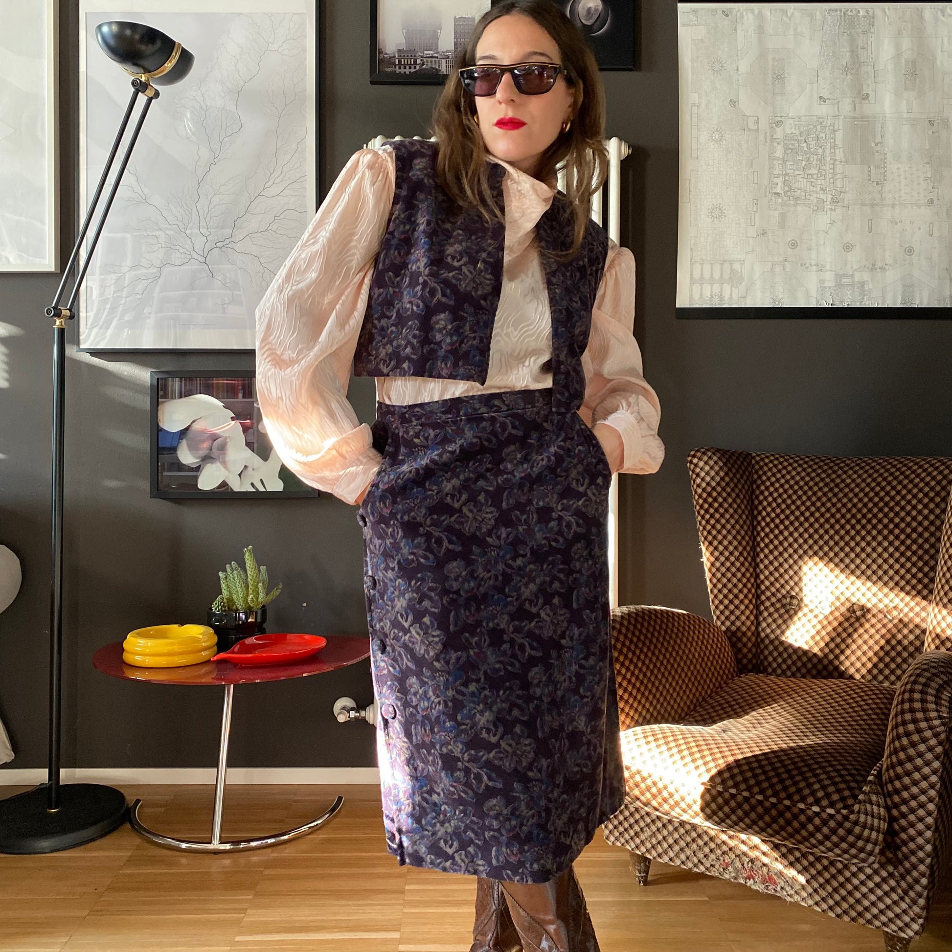 Meraviglioso completo sartoriale anni 80 viola con fantasia a fiori composto da gilet corto e gonna a vita alta con dettagli laterali con chiusura a bottoni.