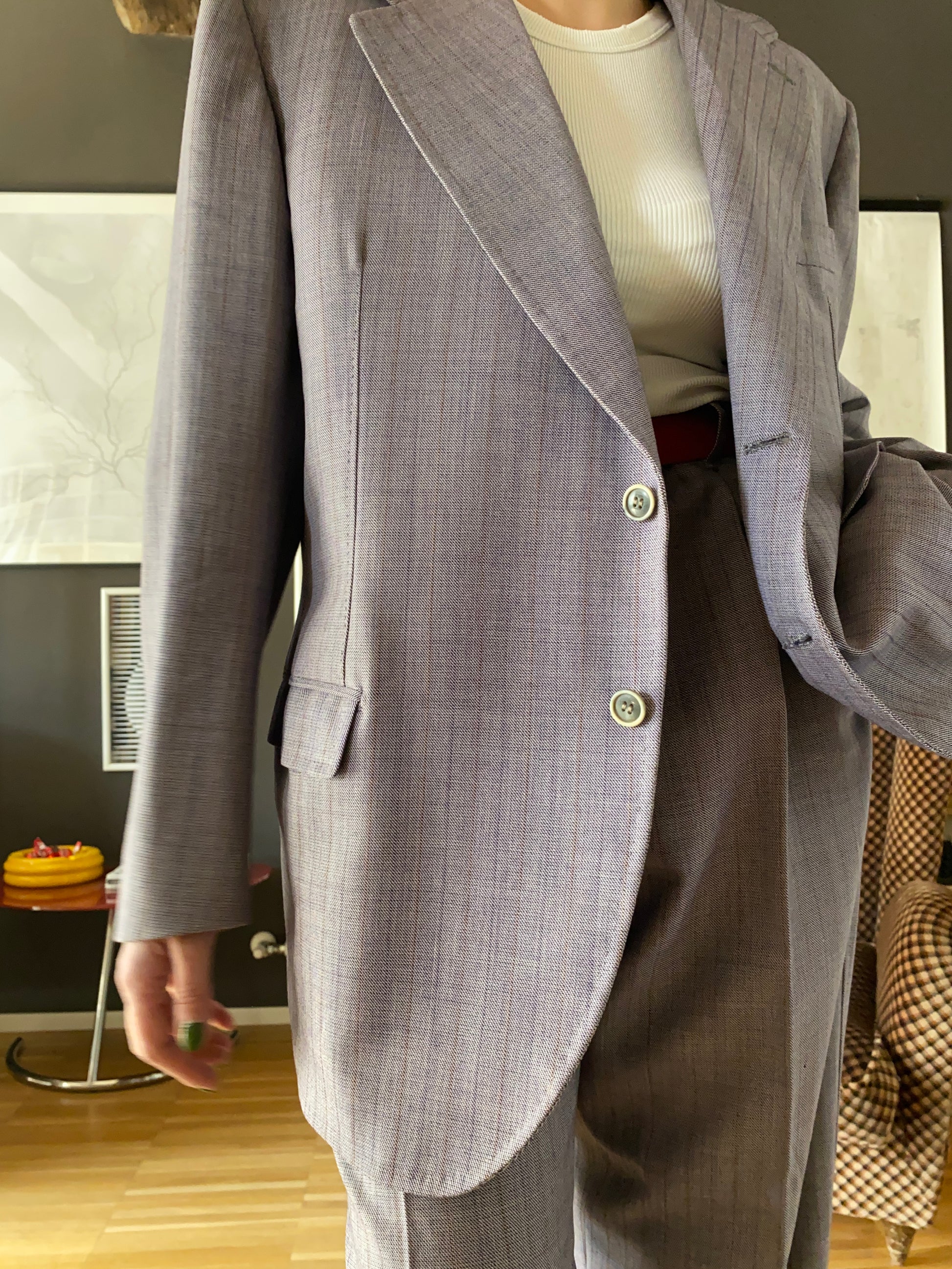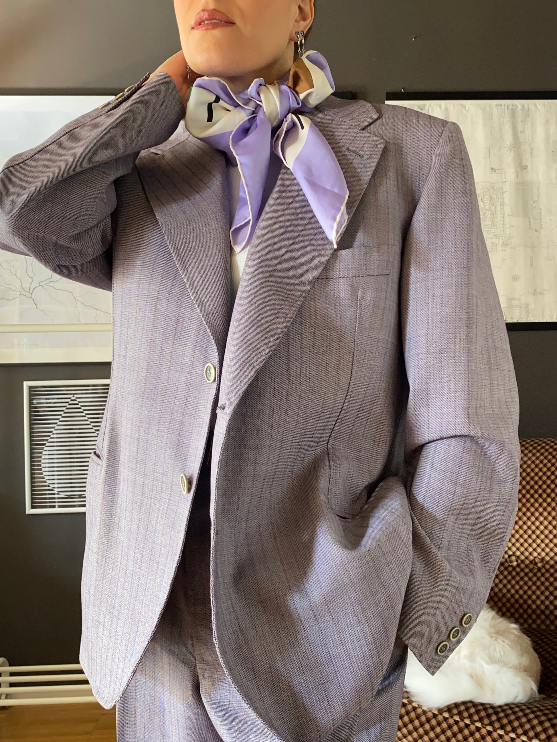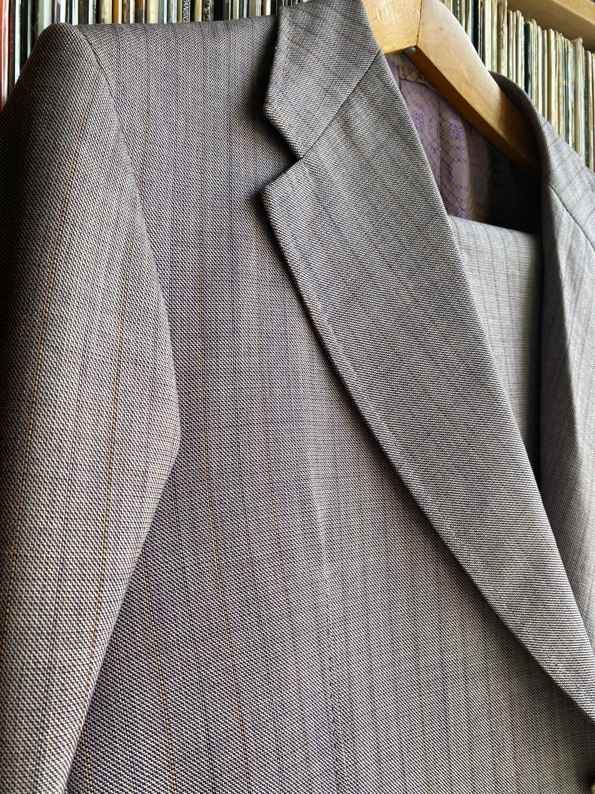 Completo sartoliale maschile composto da giacca e pantalone in colore lilla/grigio con leggera gessatura viola e arancio.