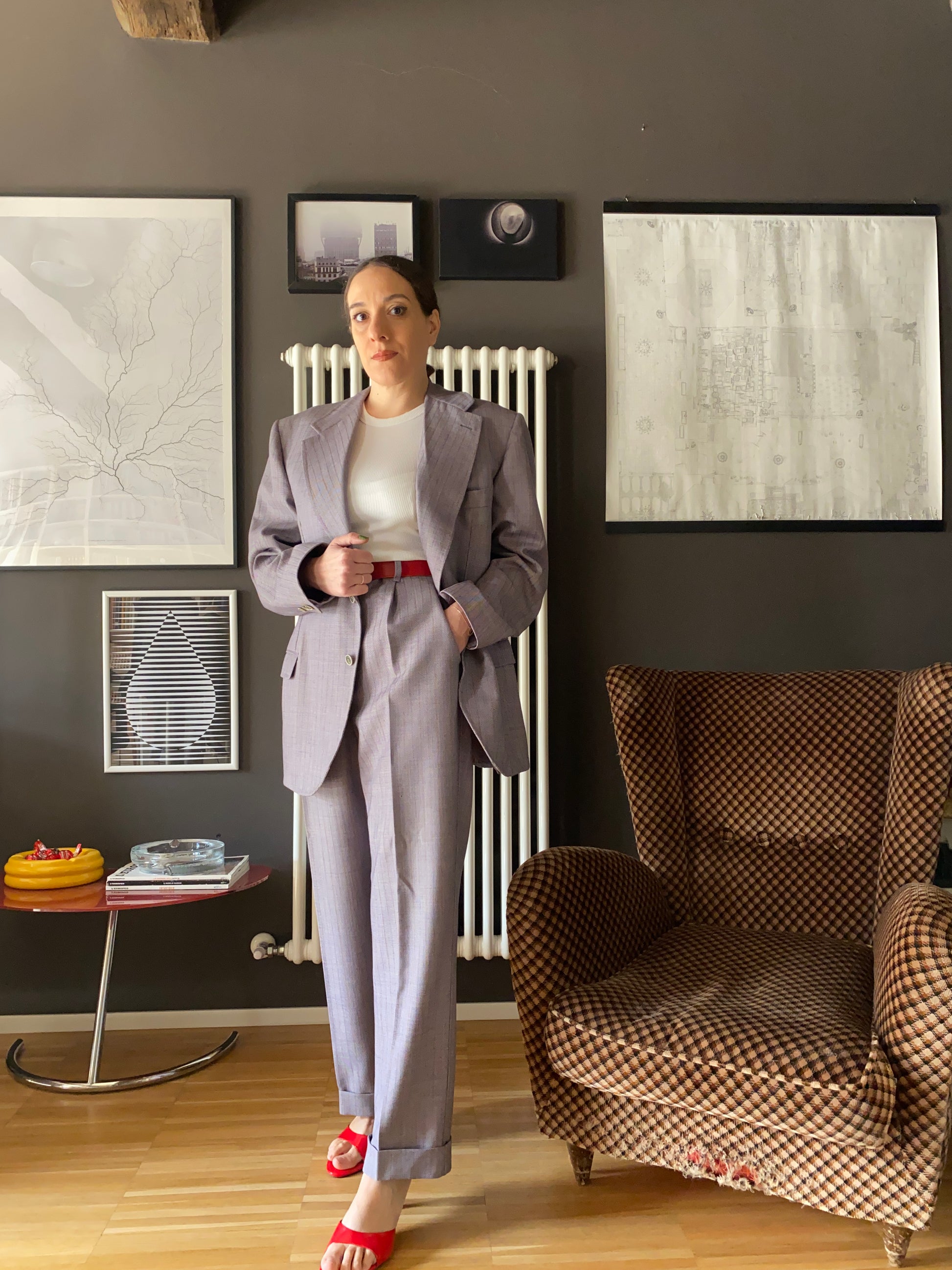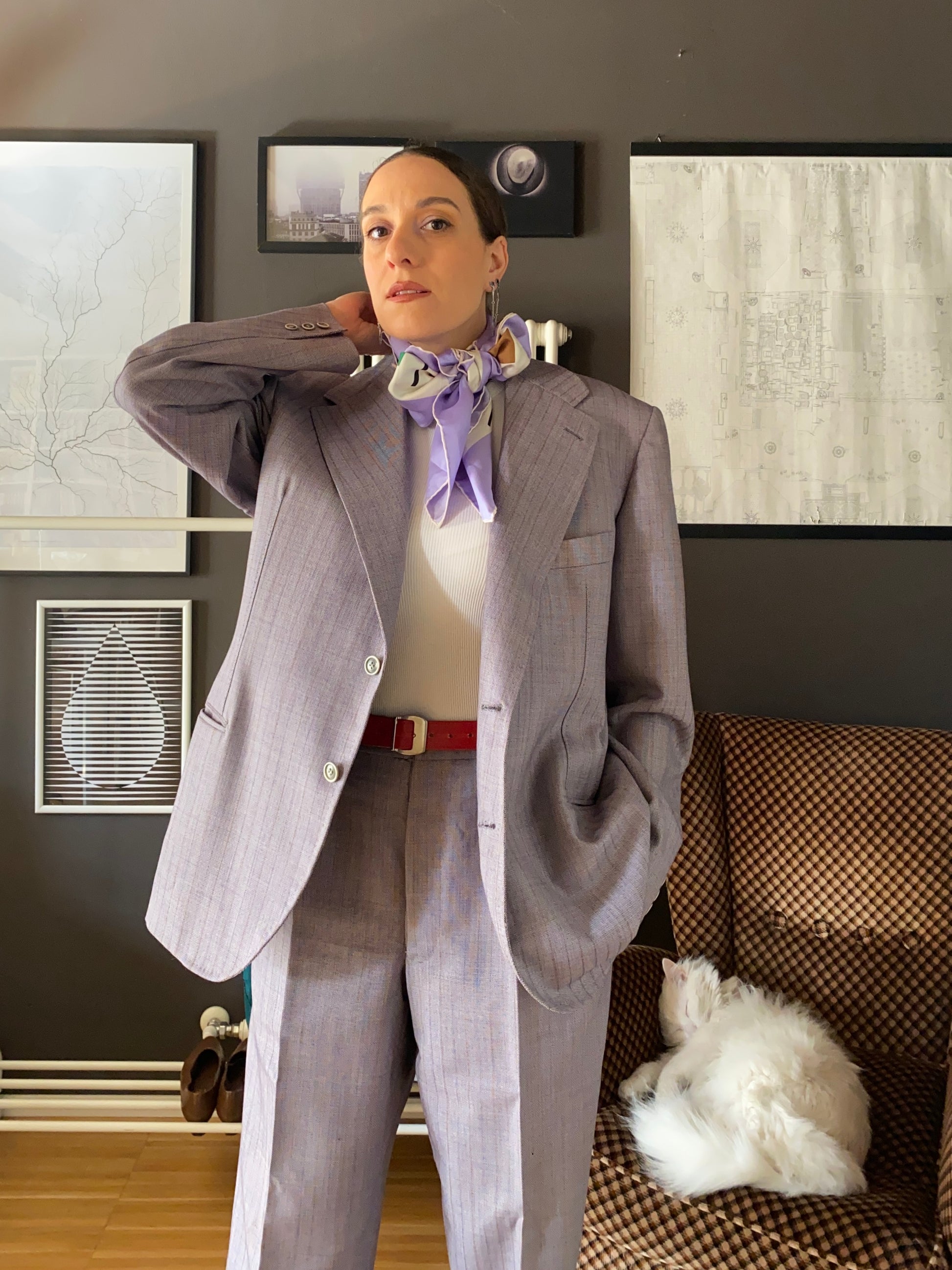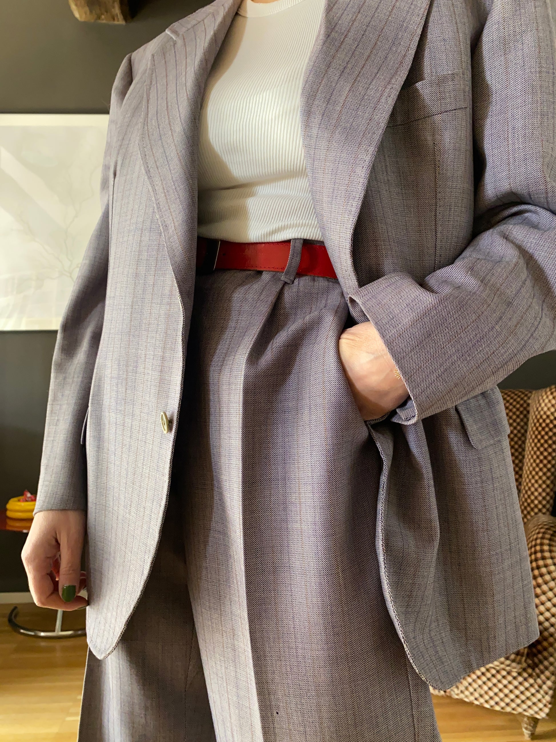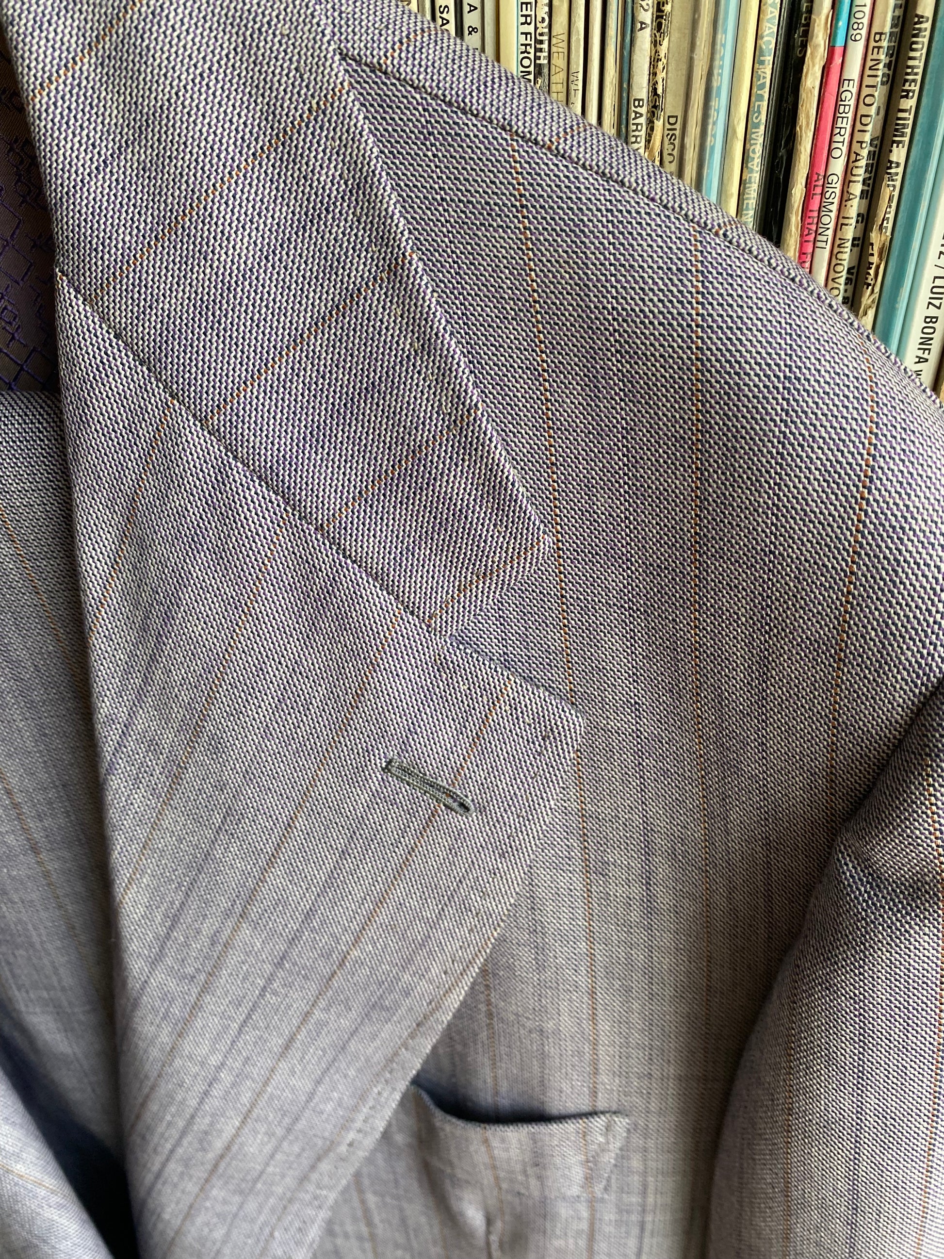 Completo sartoliale maschile composto da giacca e pantalone in colore lilla/grigio con leggera gessatura viola e arancio.