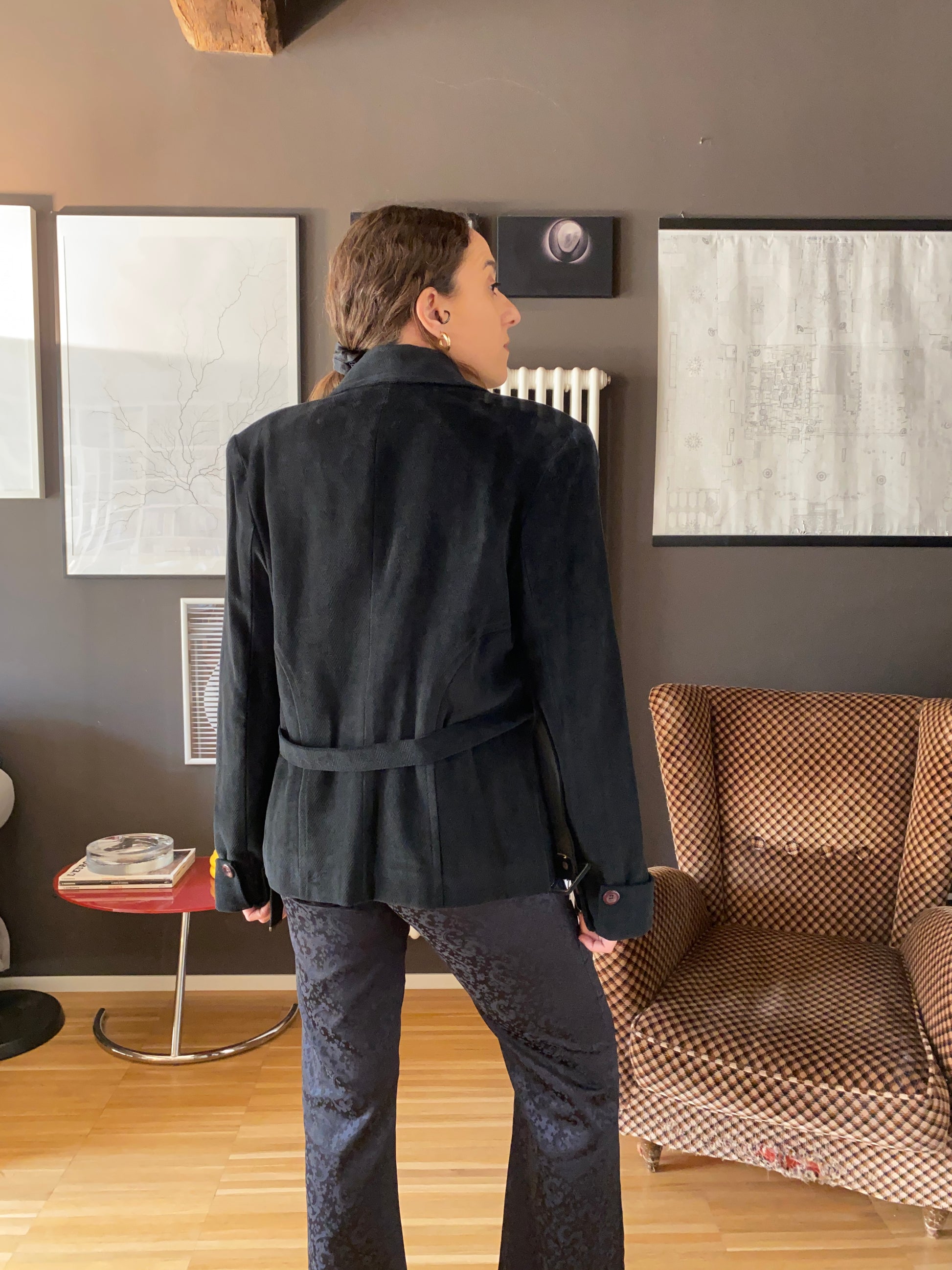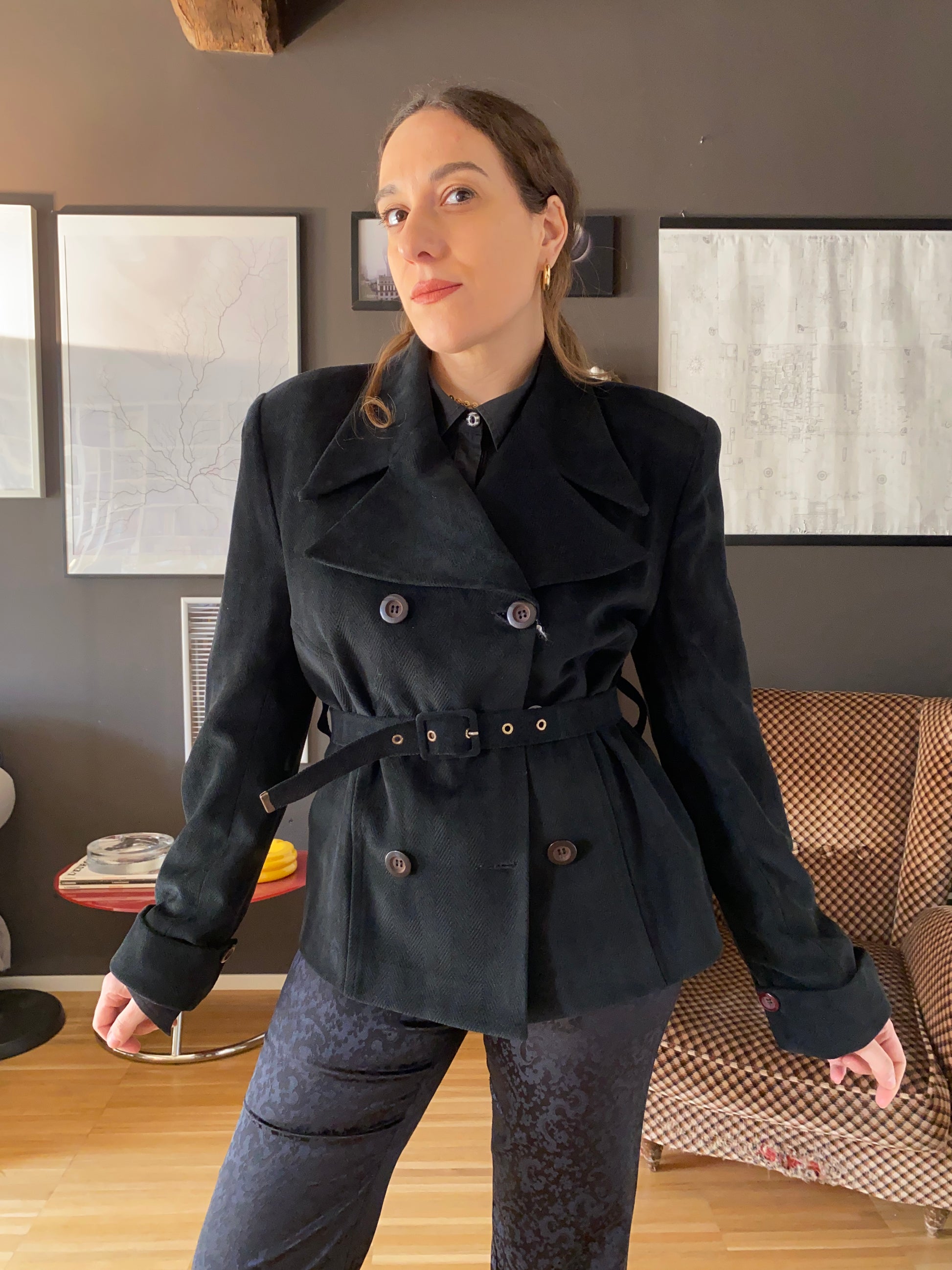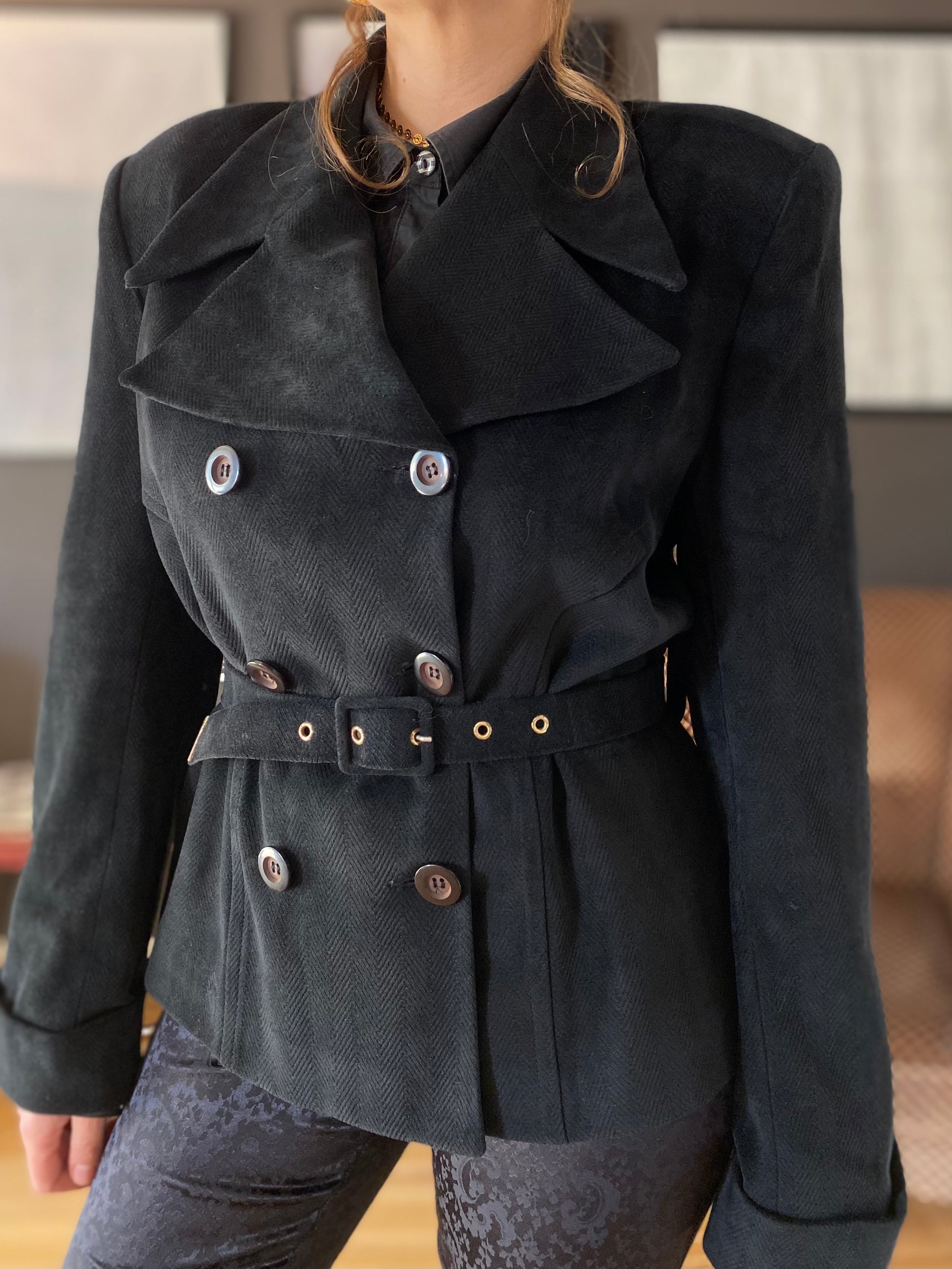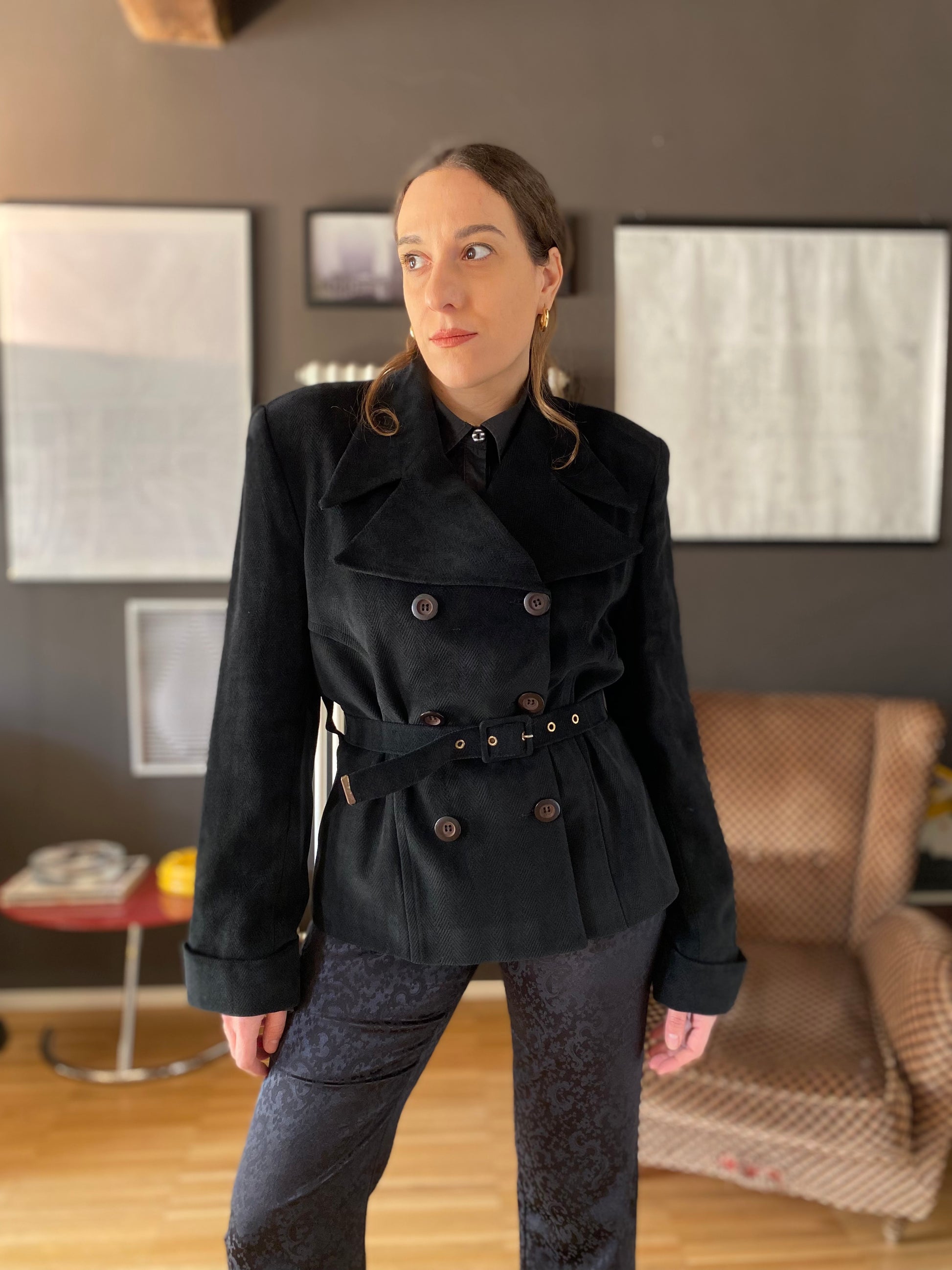 Chiusura doppiopetto con tre bottoni e tessuto spigato tono su tono. Con spalline e cinturino in vita; manica risvoltata.