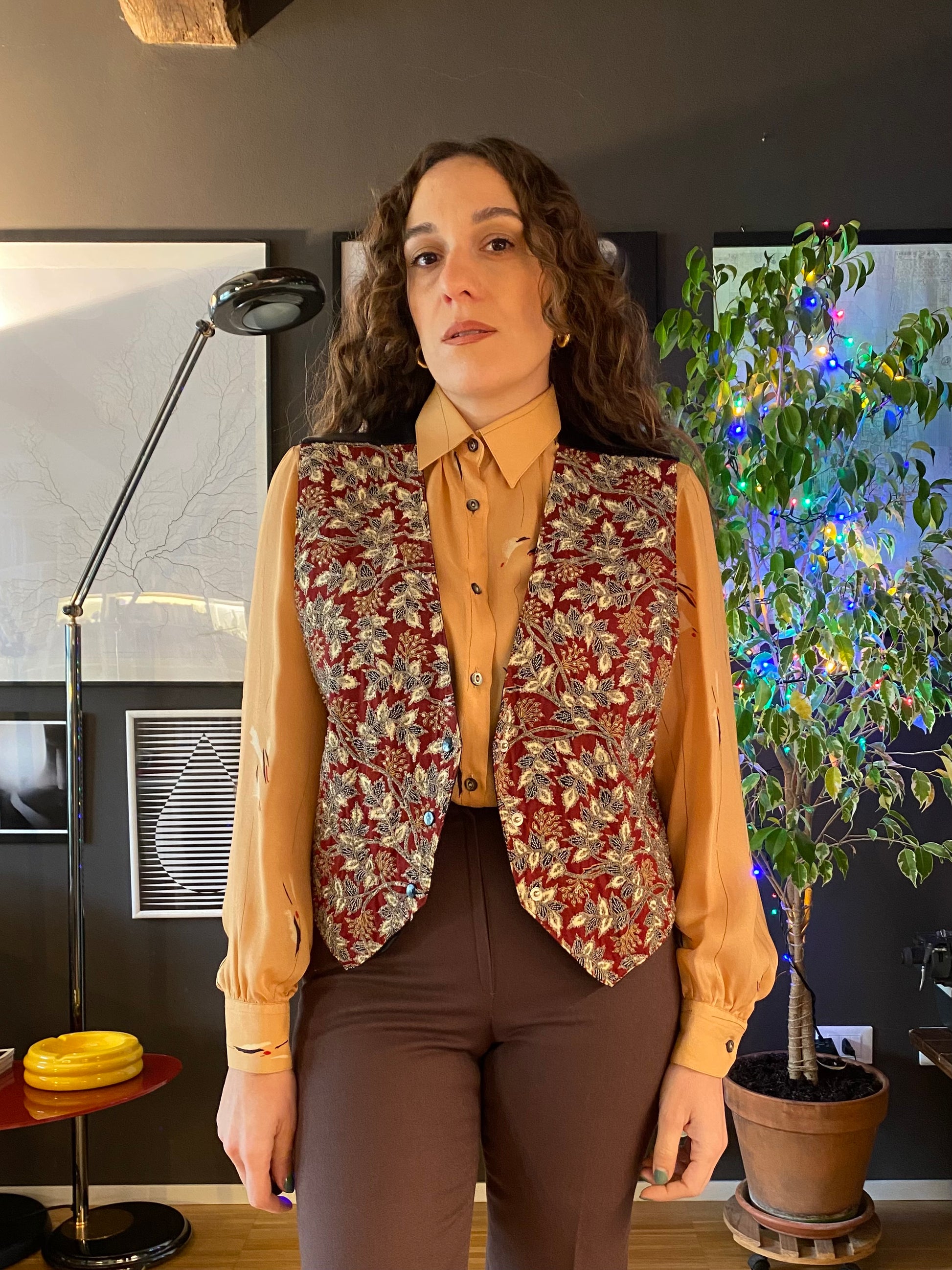 Gilet vintage anni '90, con un design bohémien/hippie e romantici motivi floreali a foglie. Presenta applicazioni di perline su tutta la superficie frontale.