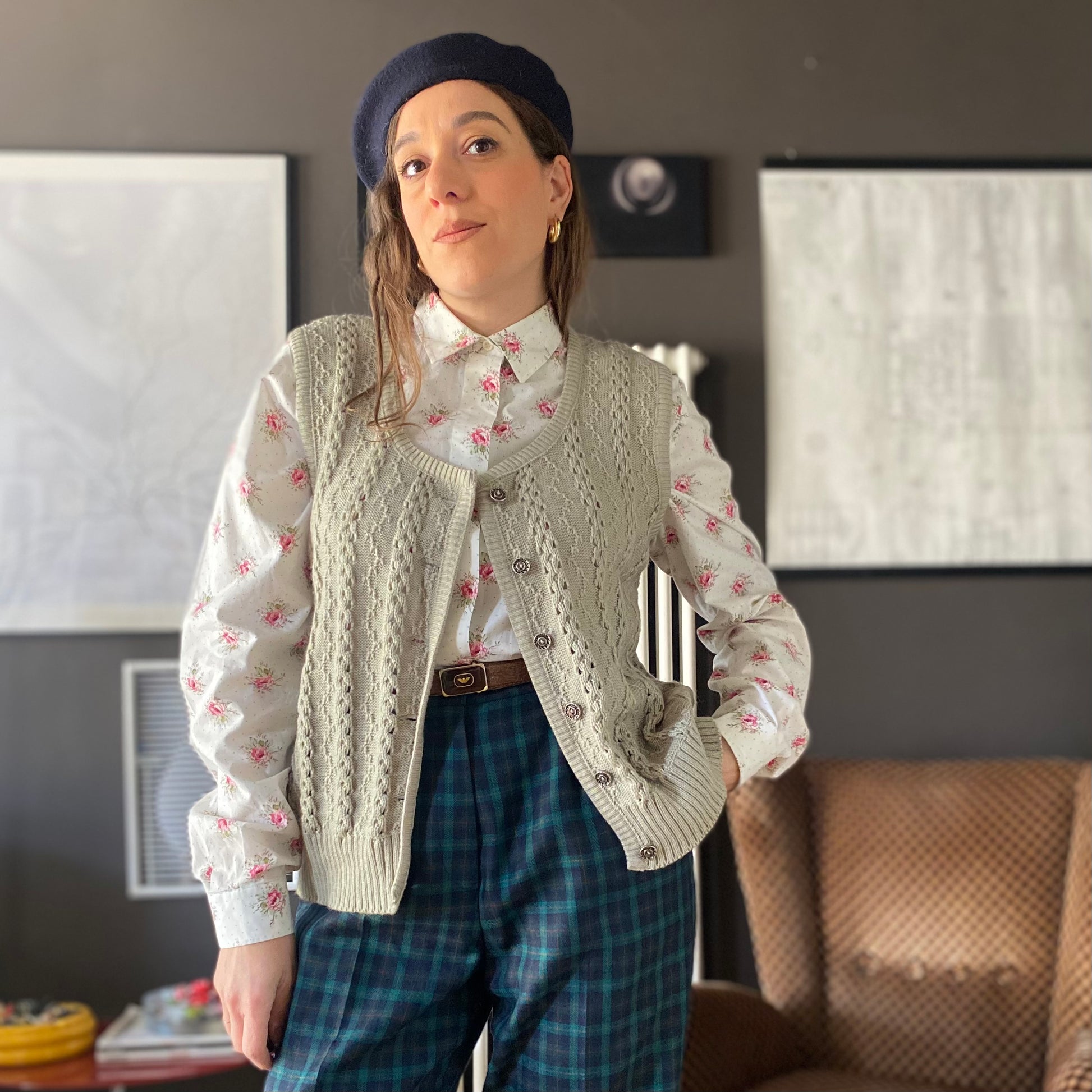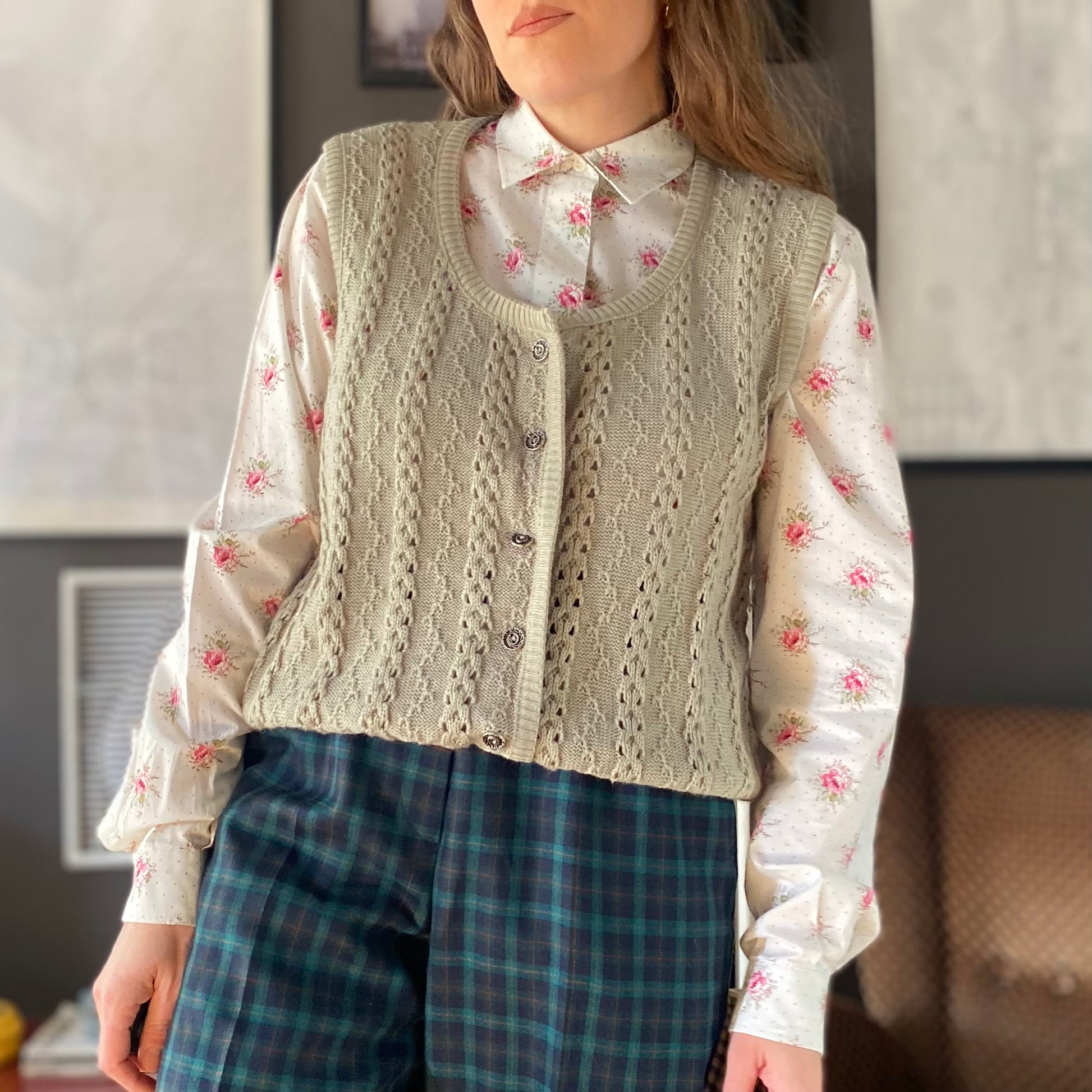 Stupendo gilet tirolese in maglia traforata, di un belllo e delicato verde oliva.