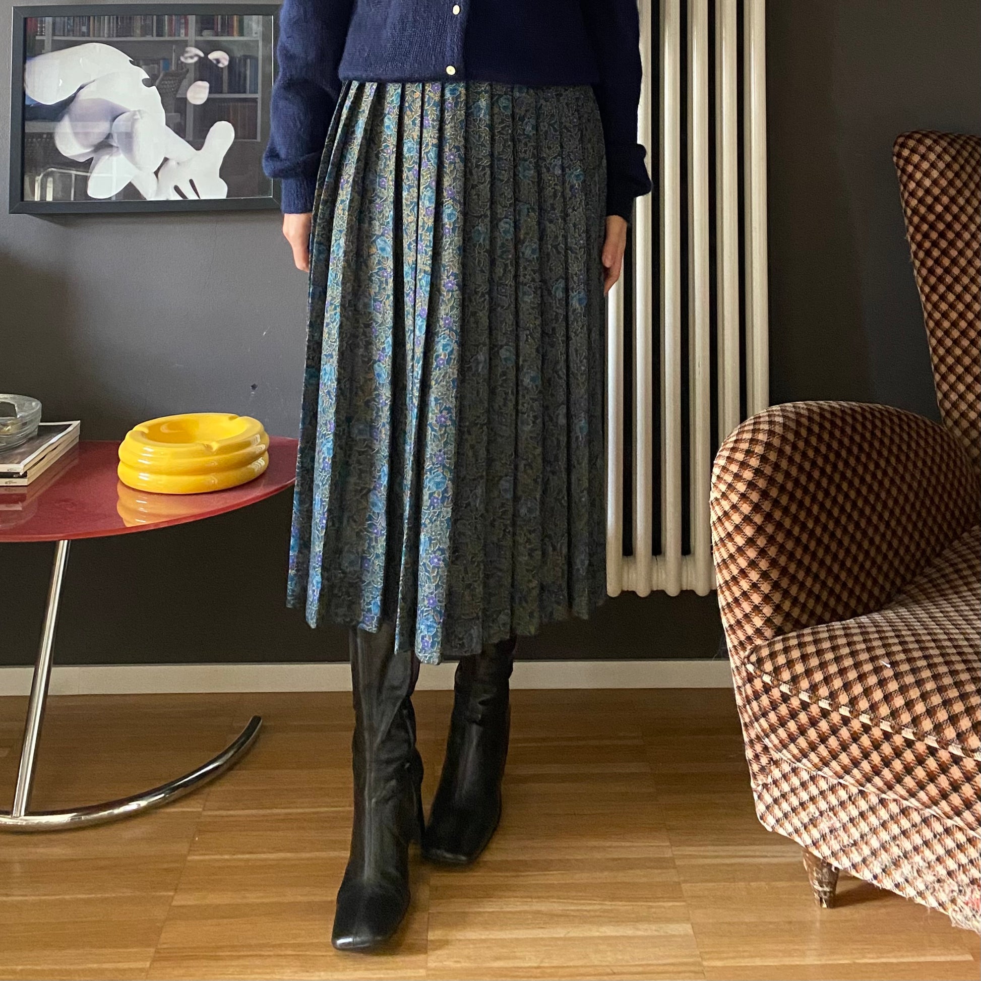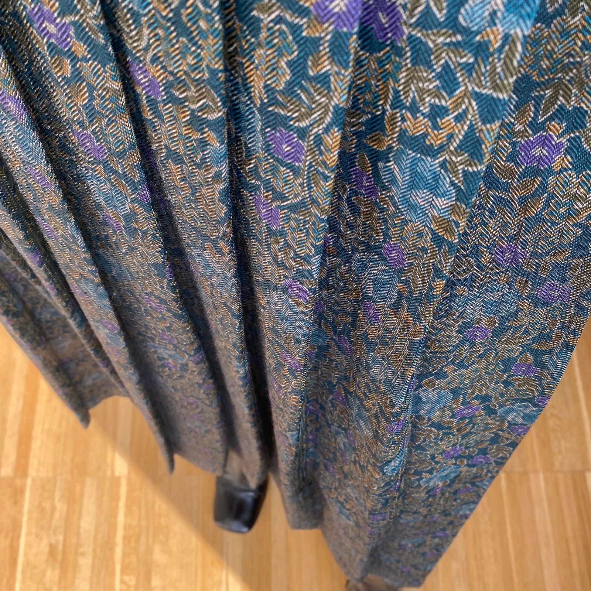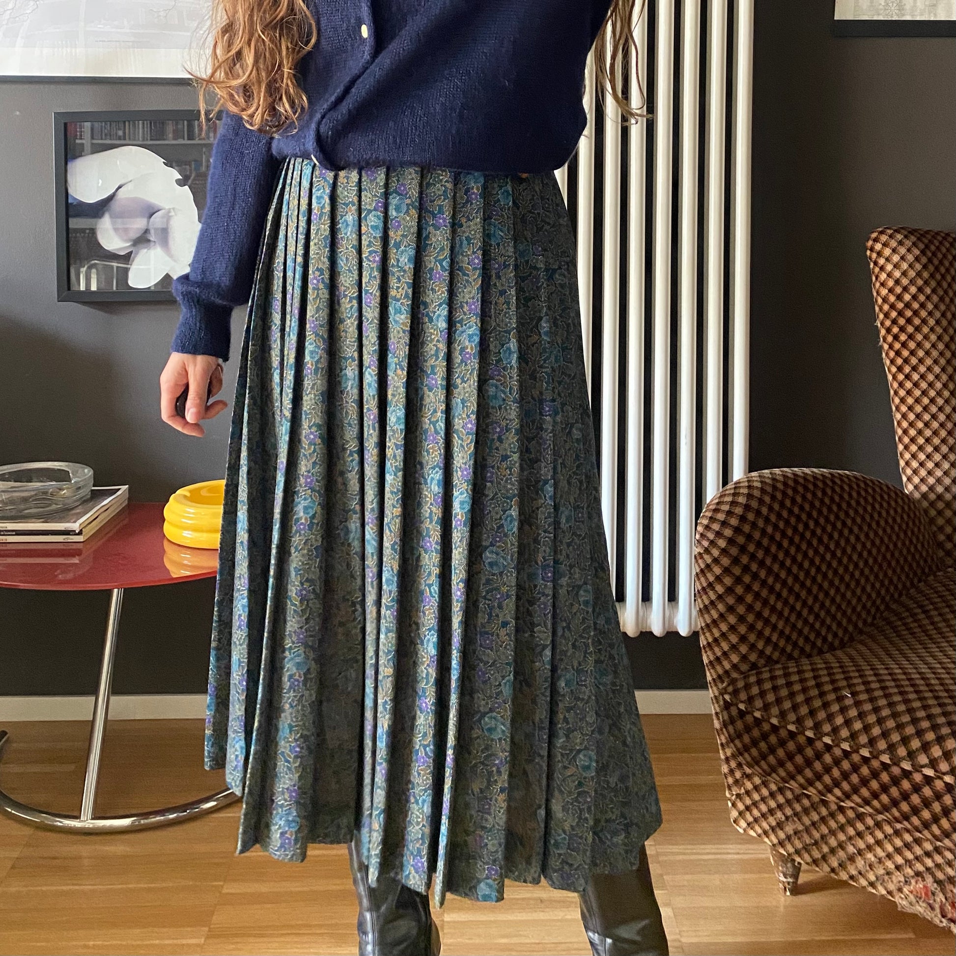 Fantasia cashmere dai toni del blu, del cachi e del viola. Grande classico con chiusura laterale e due bottoni. Vita alta con passanti perfetti per ospitare una piccola cintura.