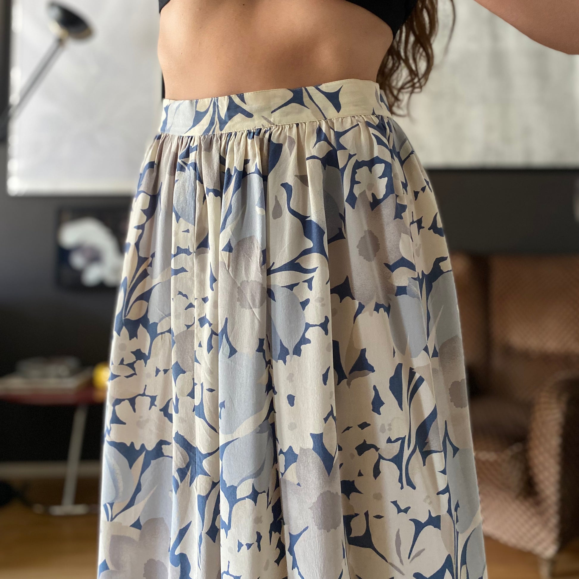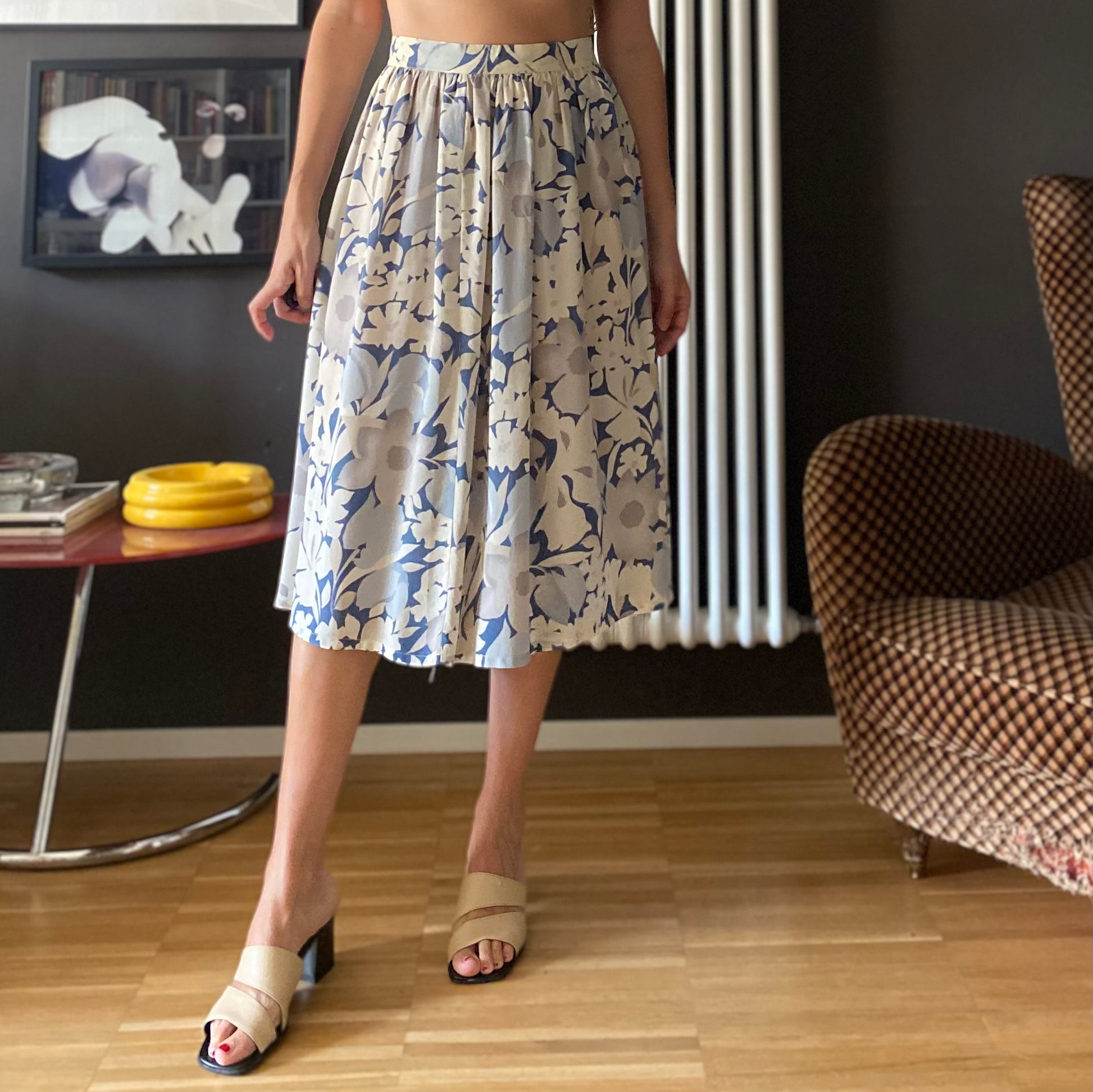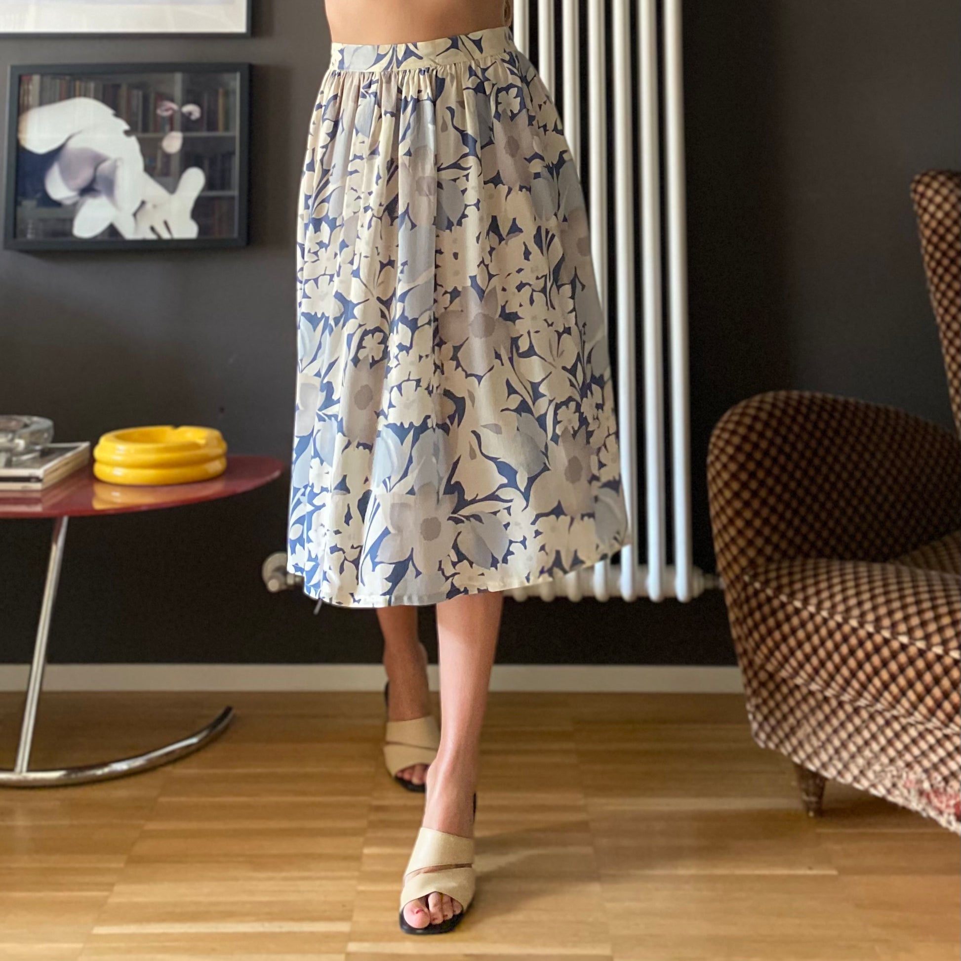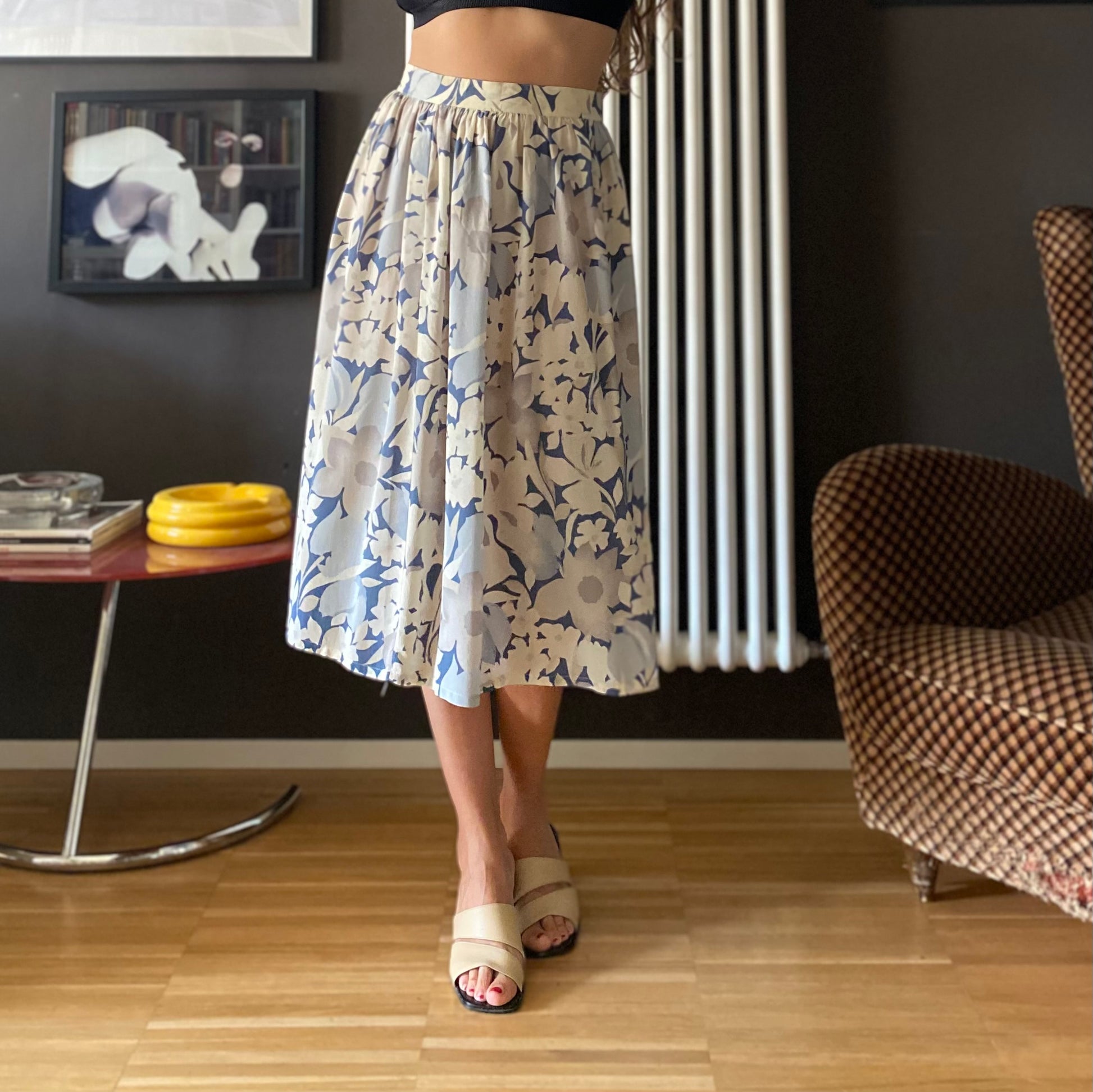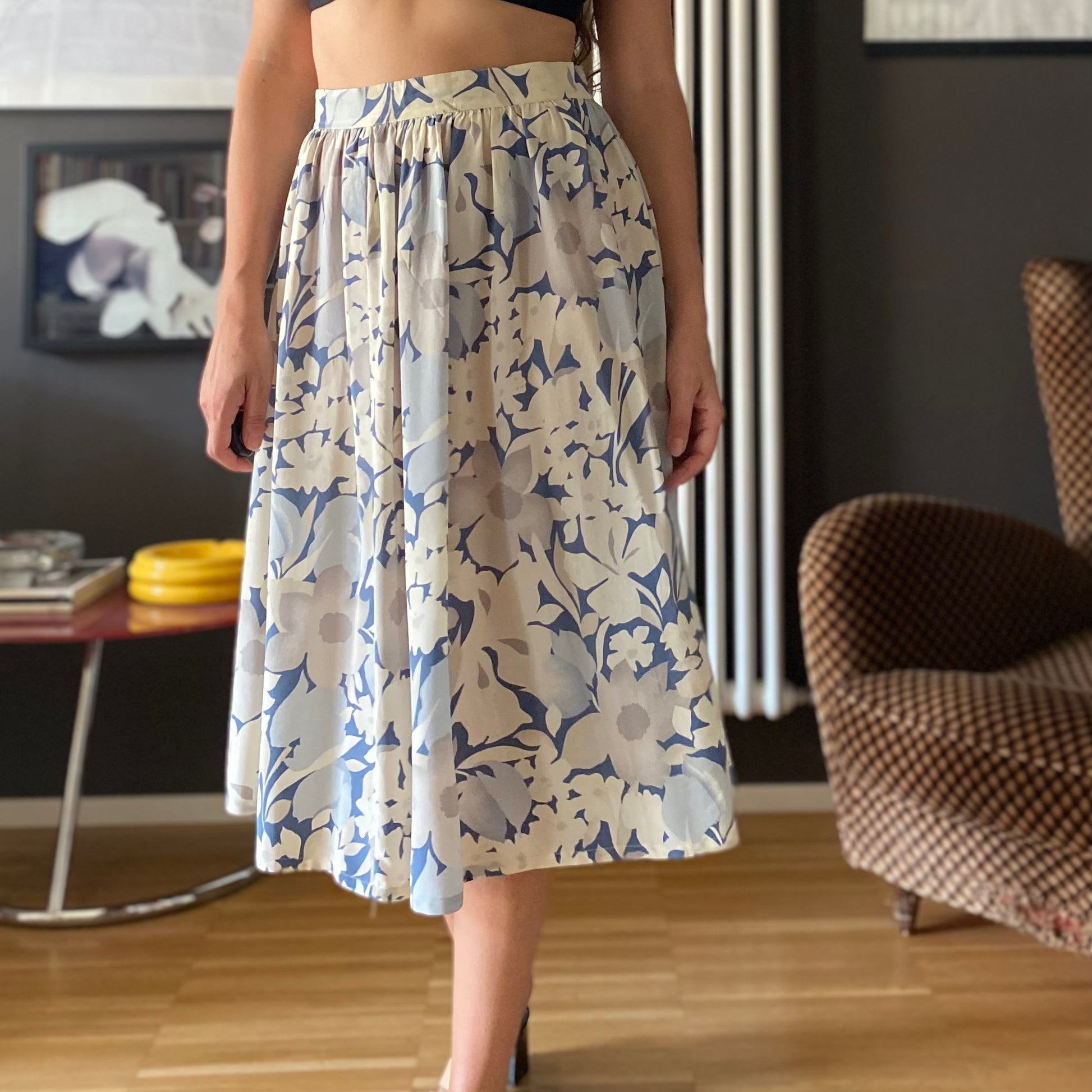 Gonna ampia midi vintage lunghezza sotto il ginocchio a fiori beige e blu.