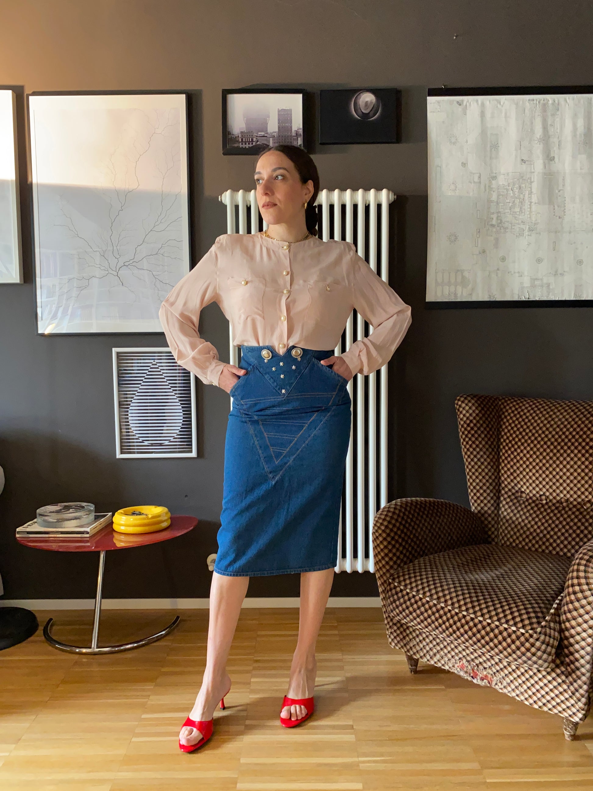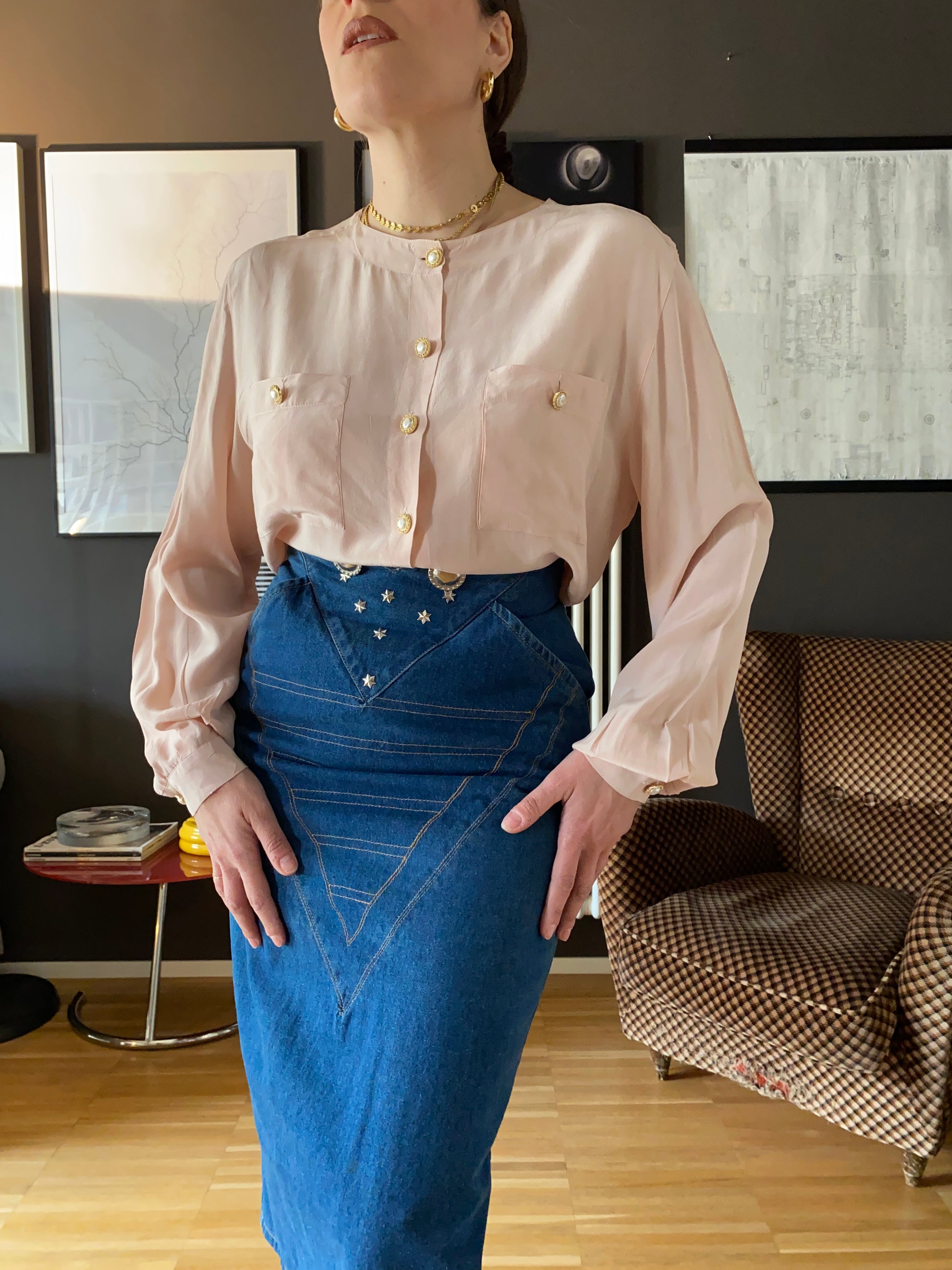 Vita altissima con taglio a V ripreso anche dalle cuciture nella parte superiore con decorazione in metallo con stelline e due grandi soli.