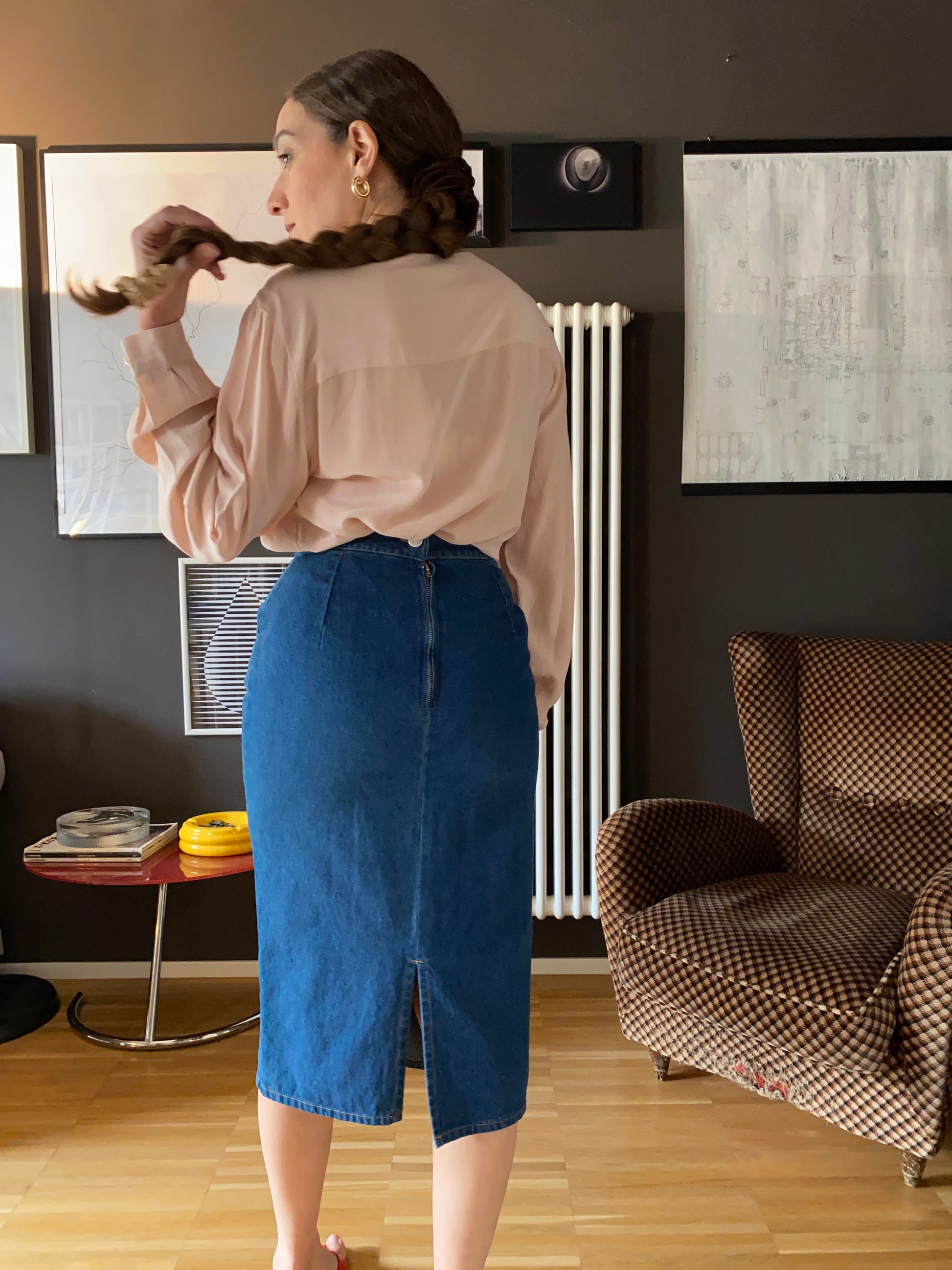 Chiusura posteriore centrale con zip e bottone, profondo spacco.