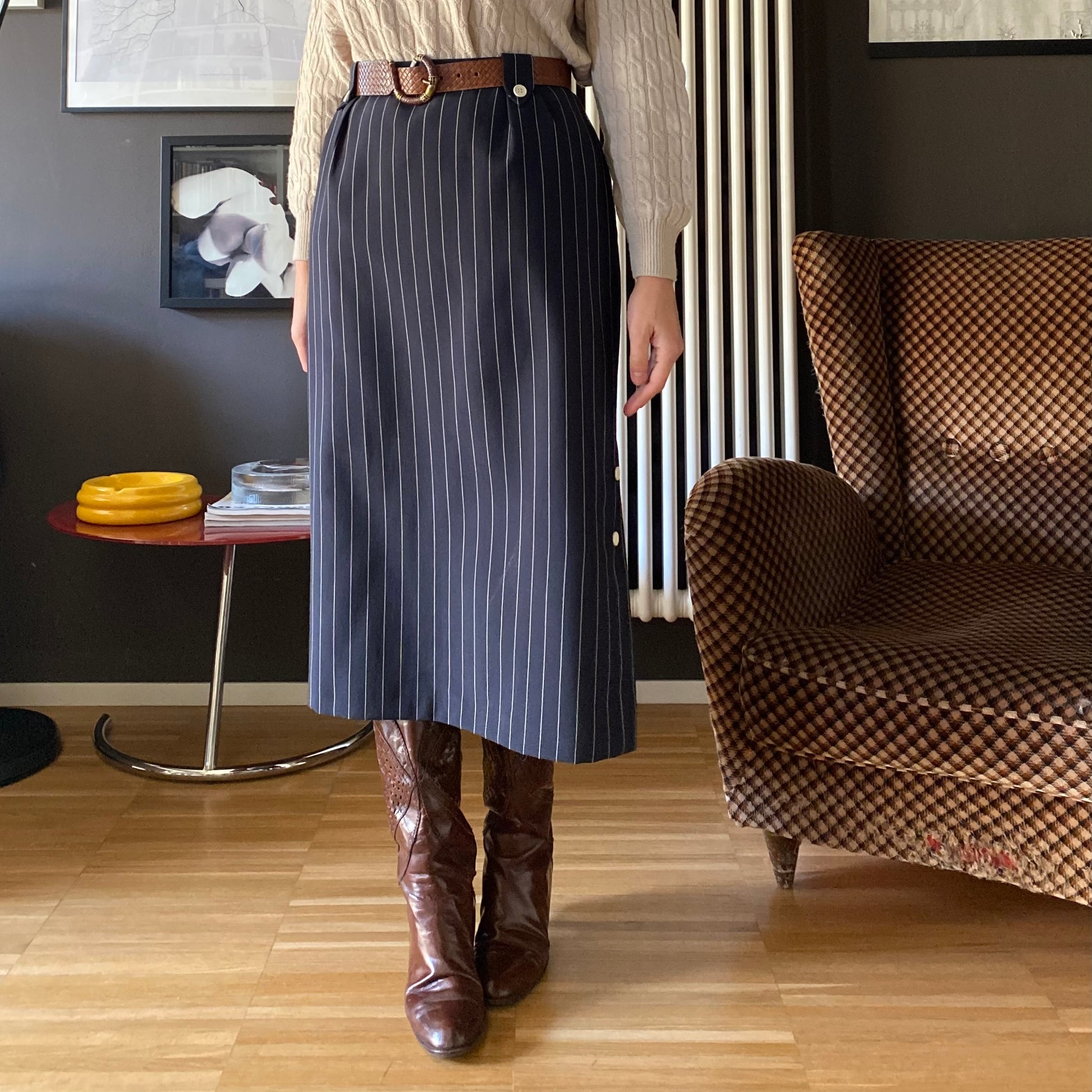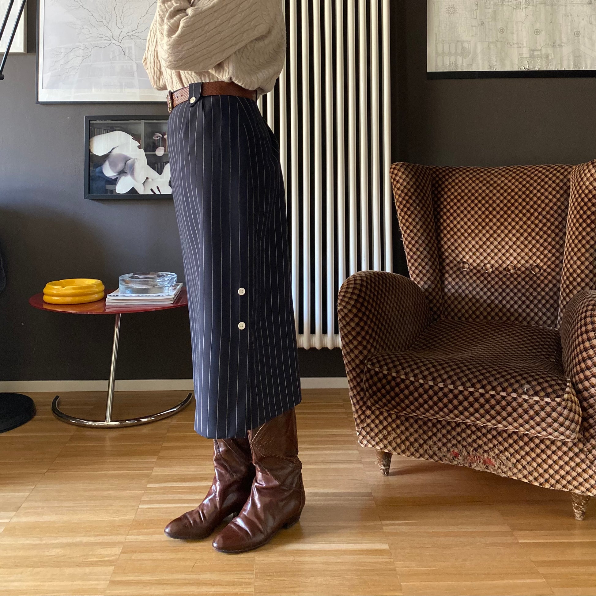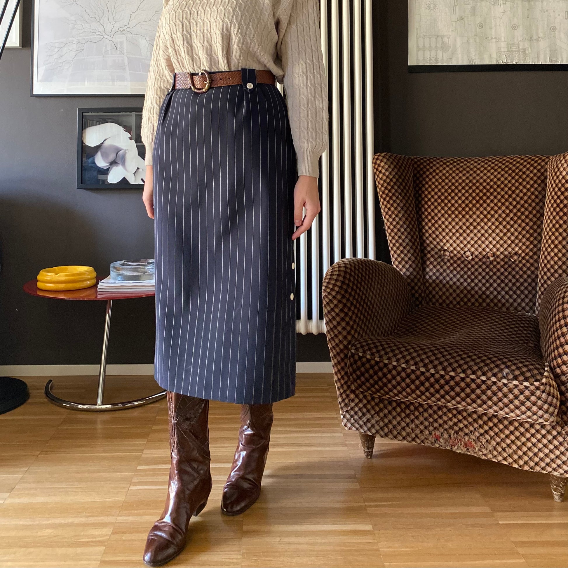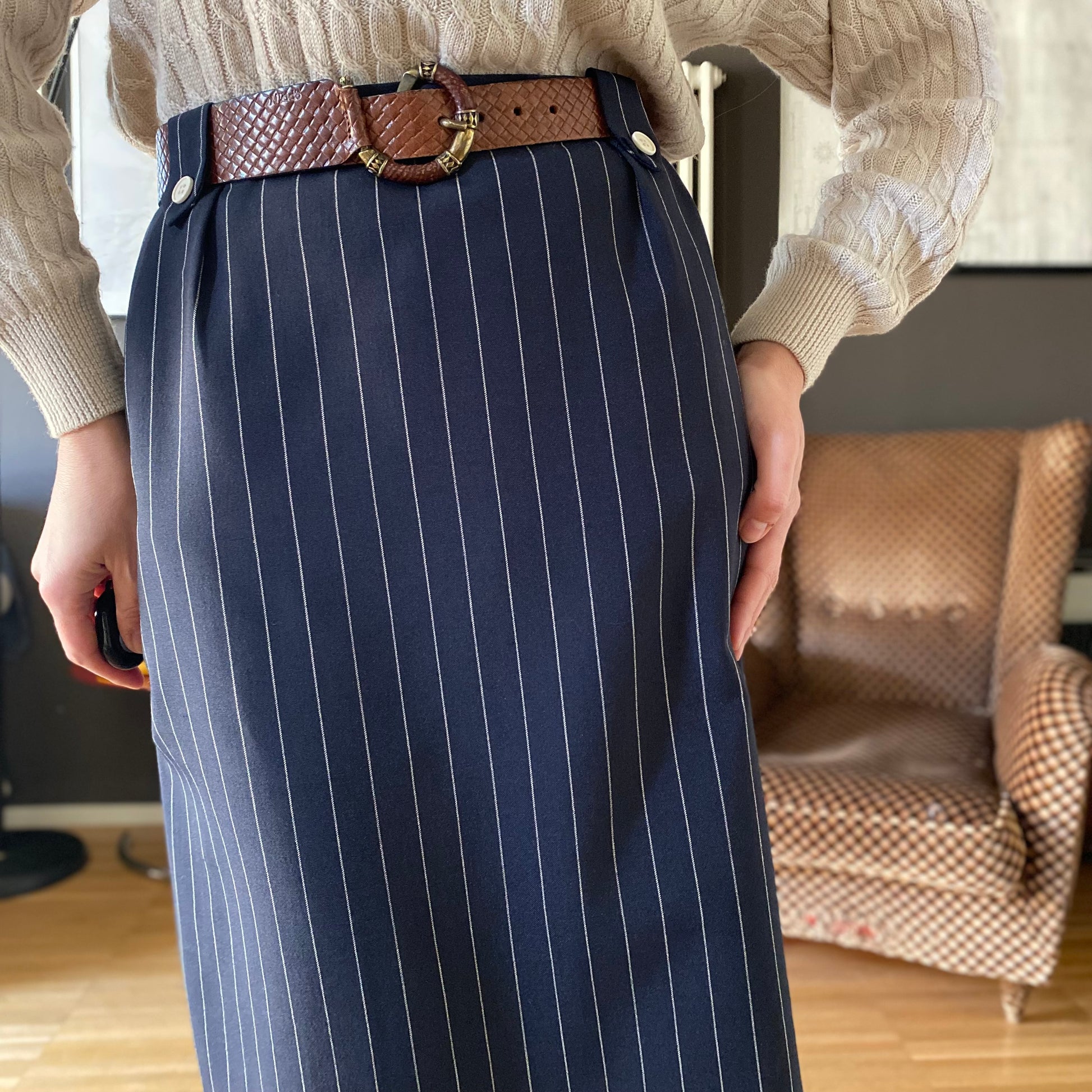 Righe sottilissime beige si intonano ai bottoncini dello stesso colore che troviamo sui passanti della cinta e sulla sommità dello spacco laterale. Tutti i bottoni sono fissi.