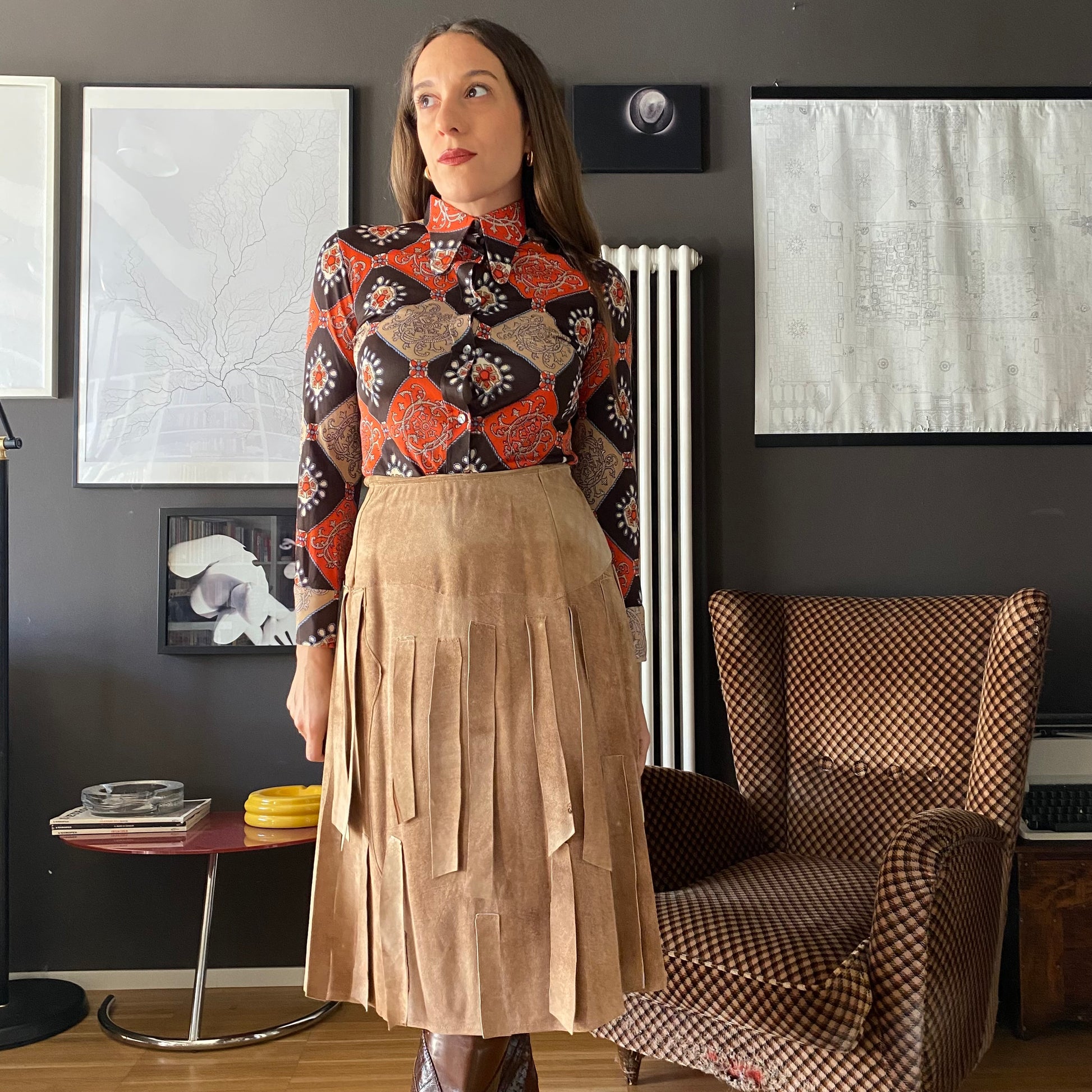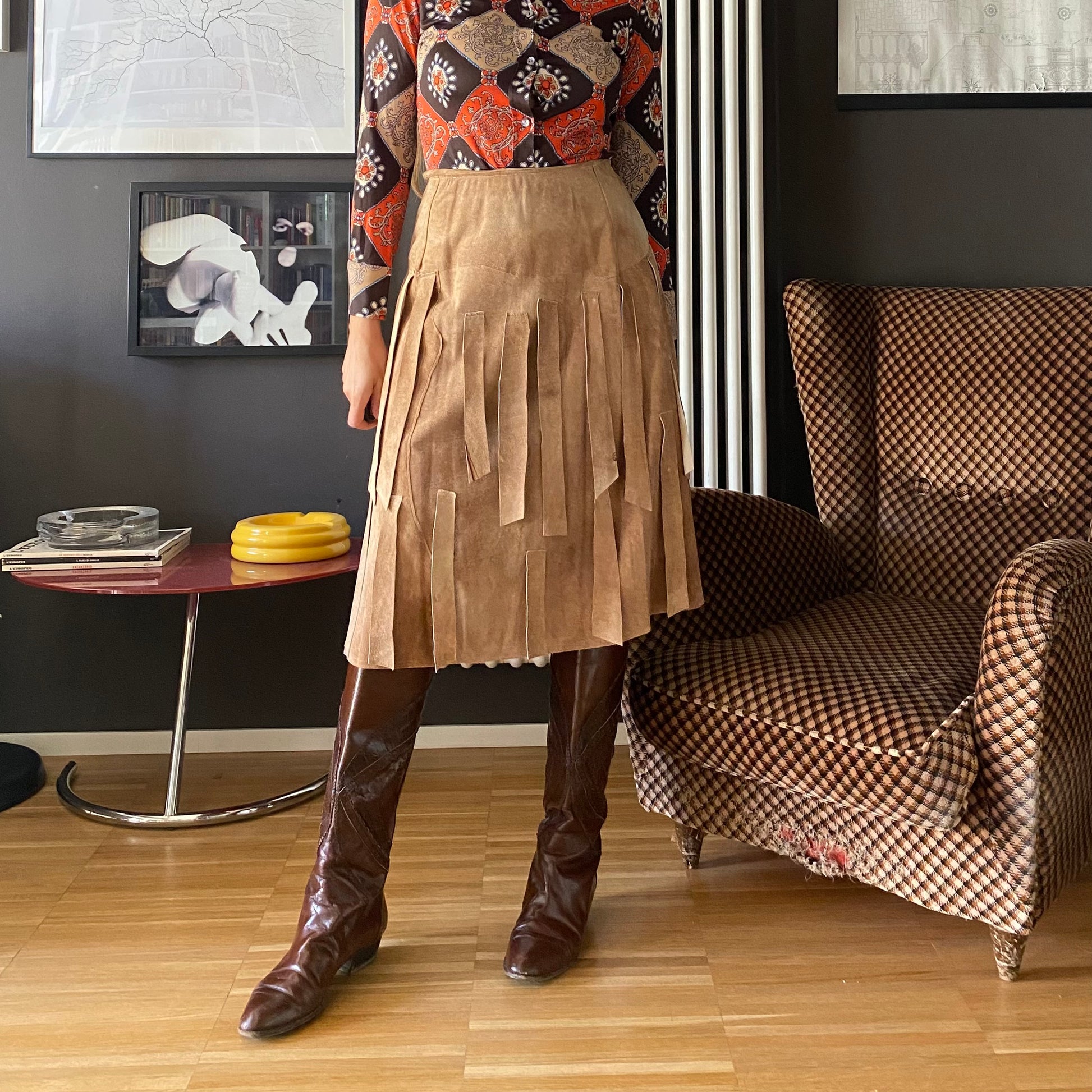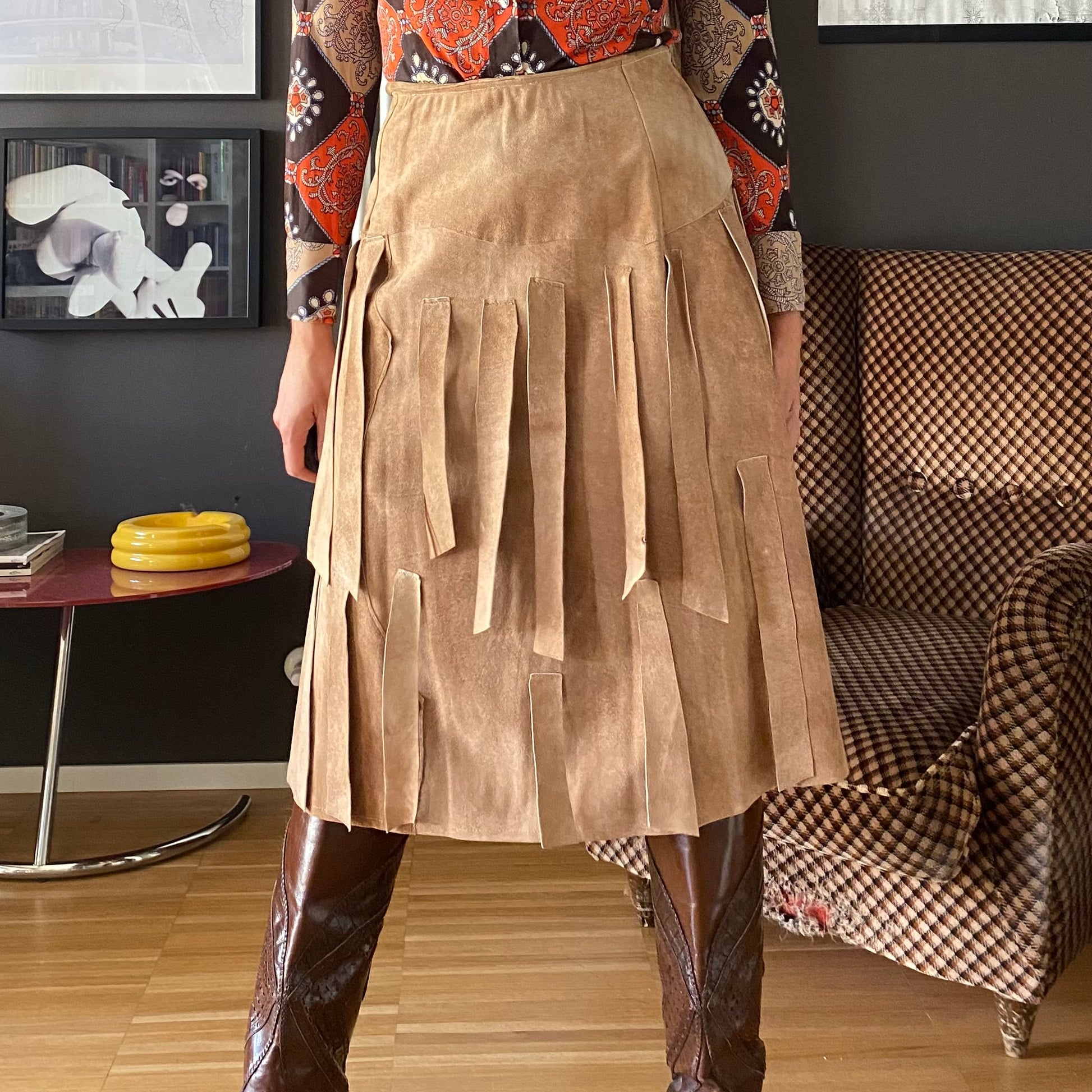 Gonna midi in pelle con frange