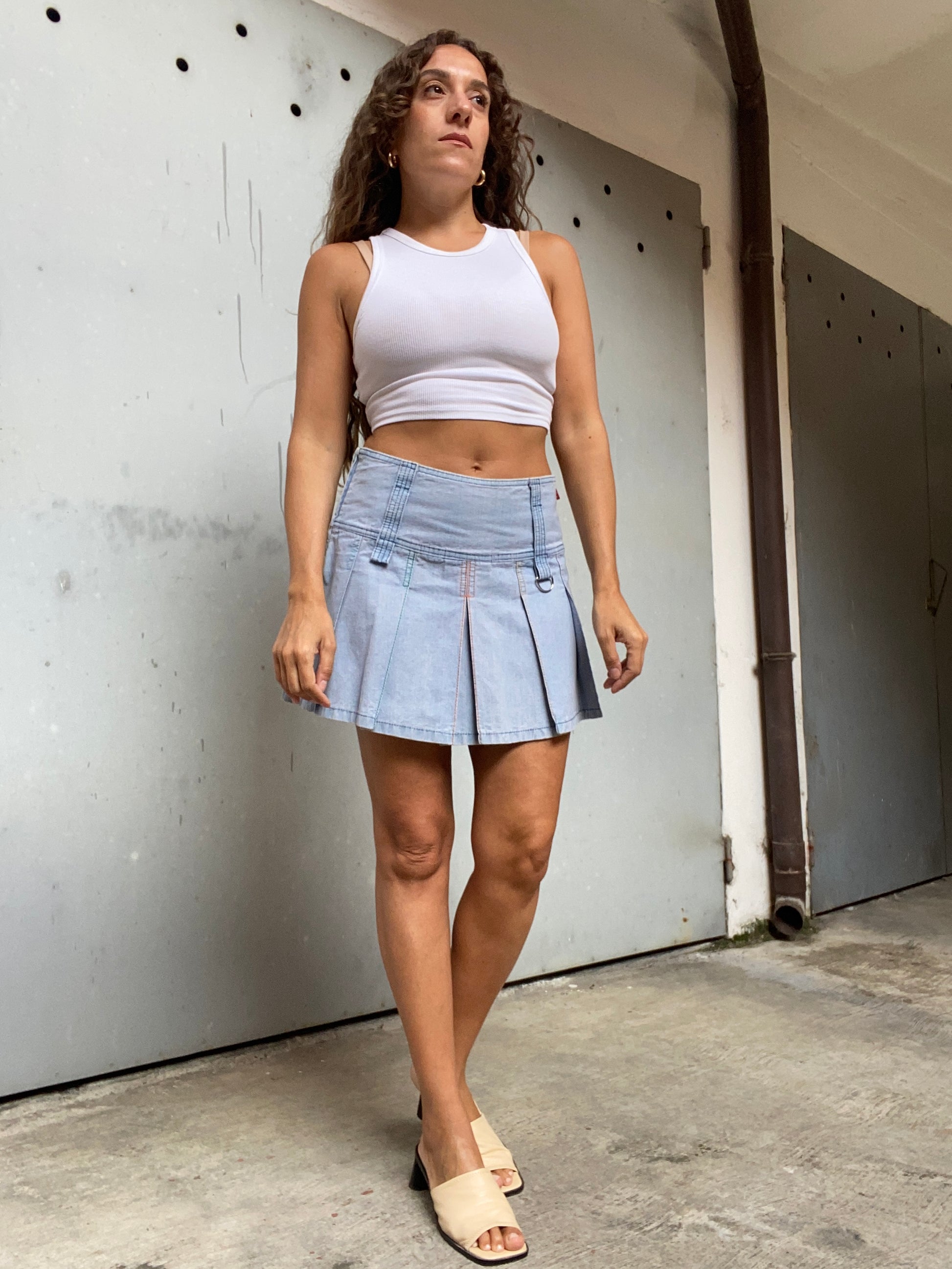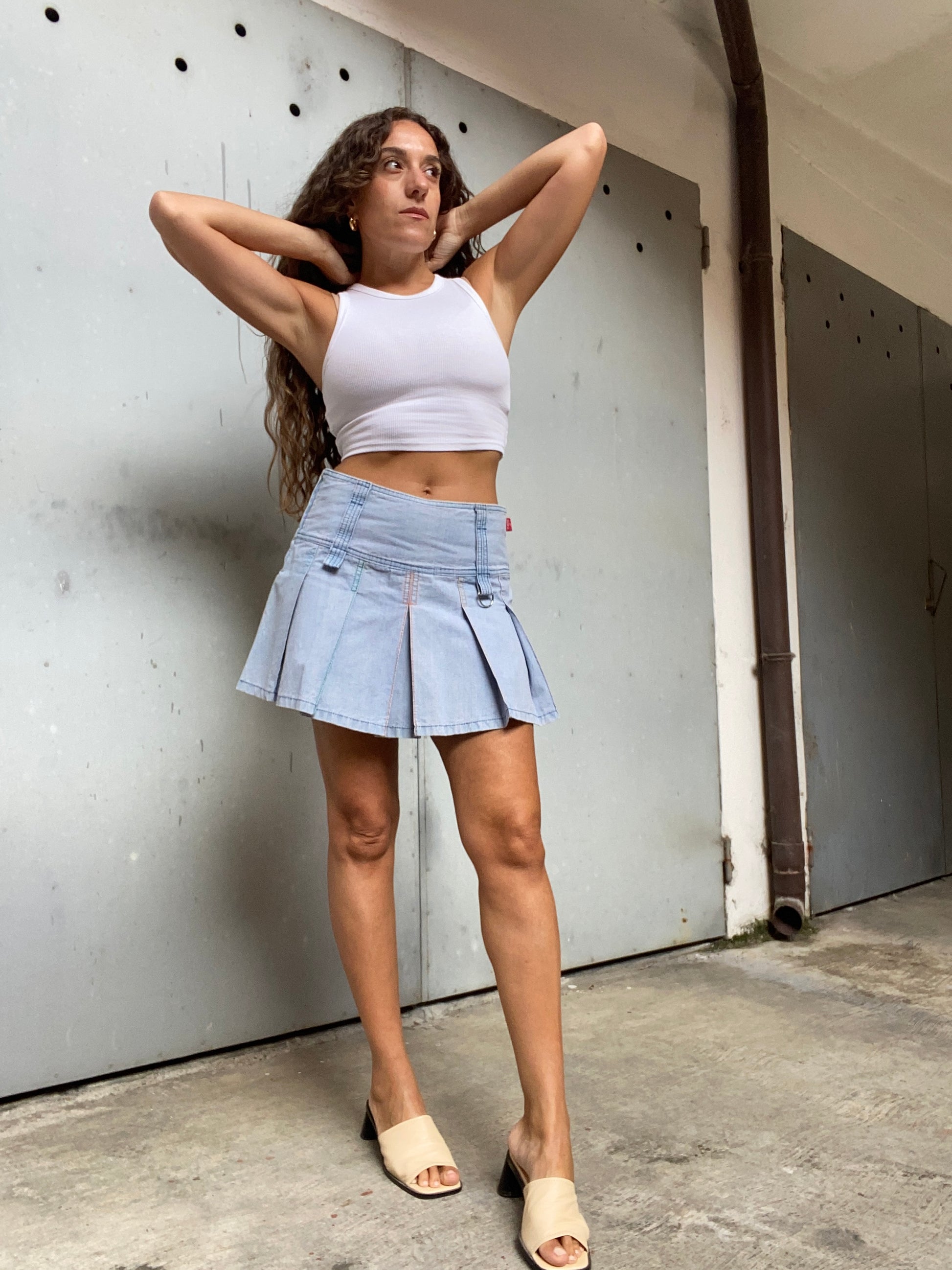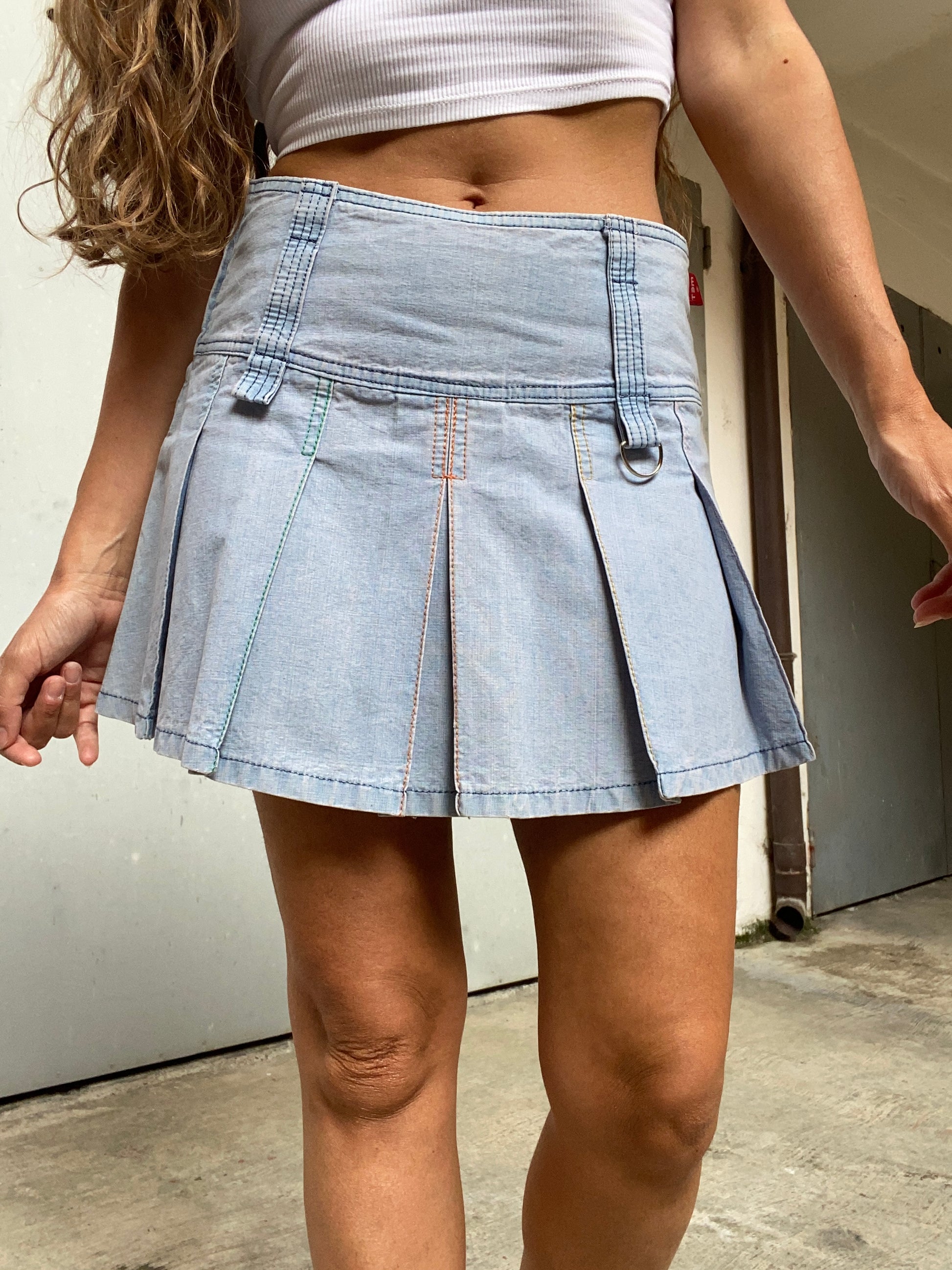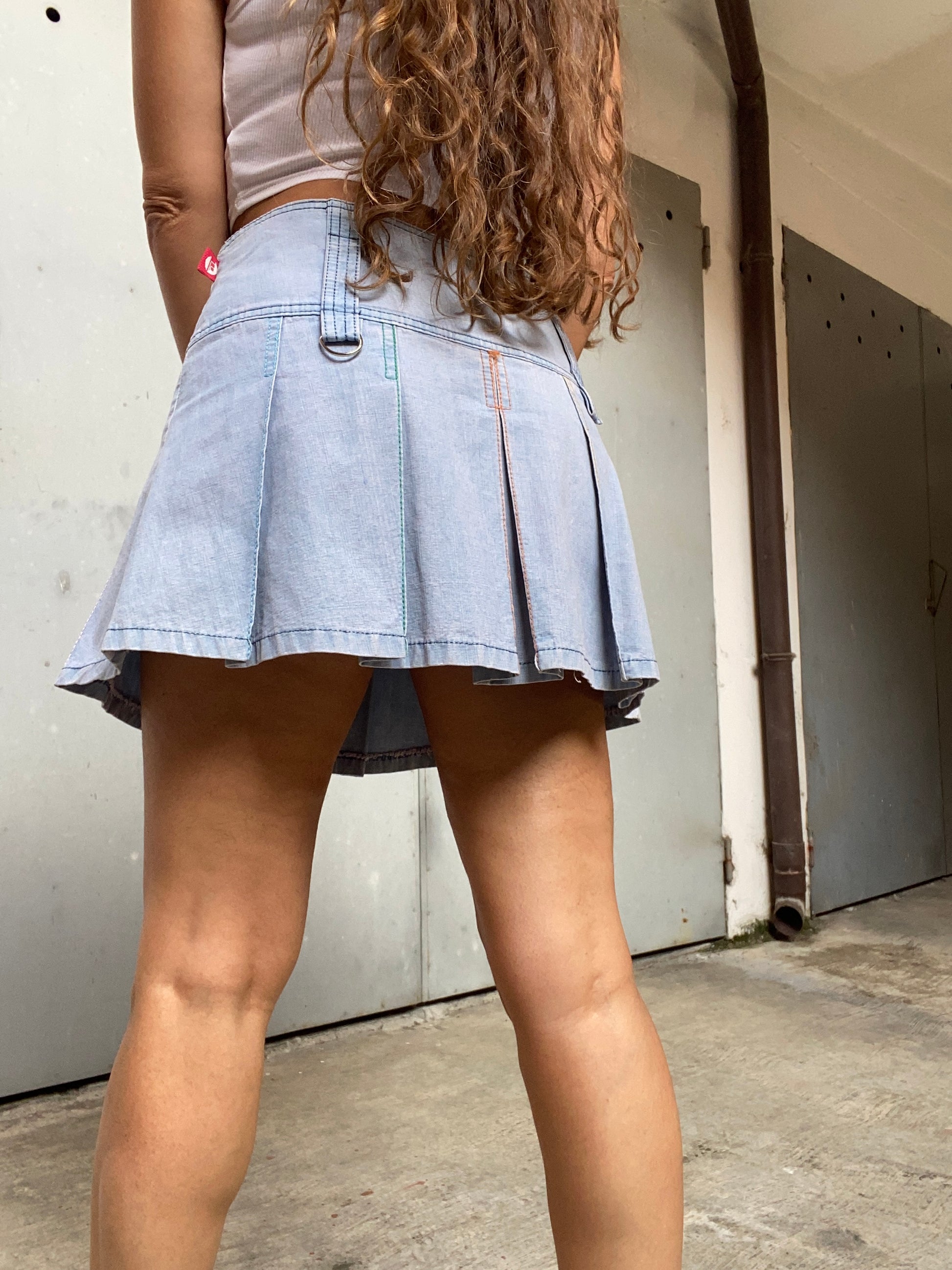 ✨ Mini gonna in jeans a pieghe, vita bassa, perfetta per un look anni 2000 super trendy!