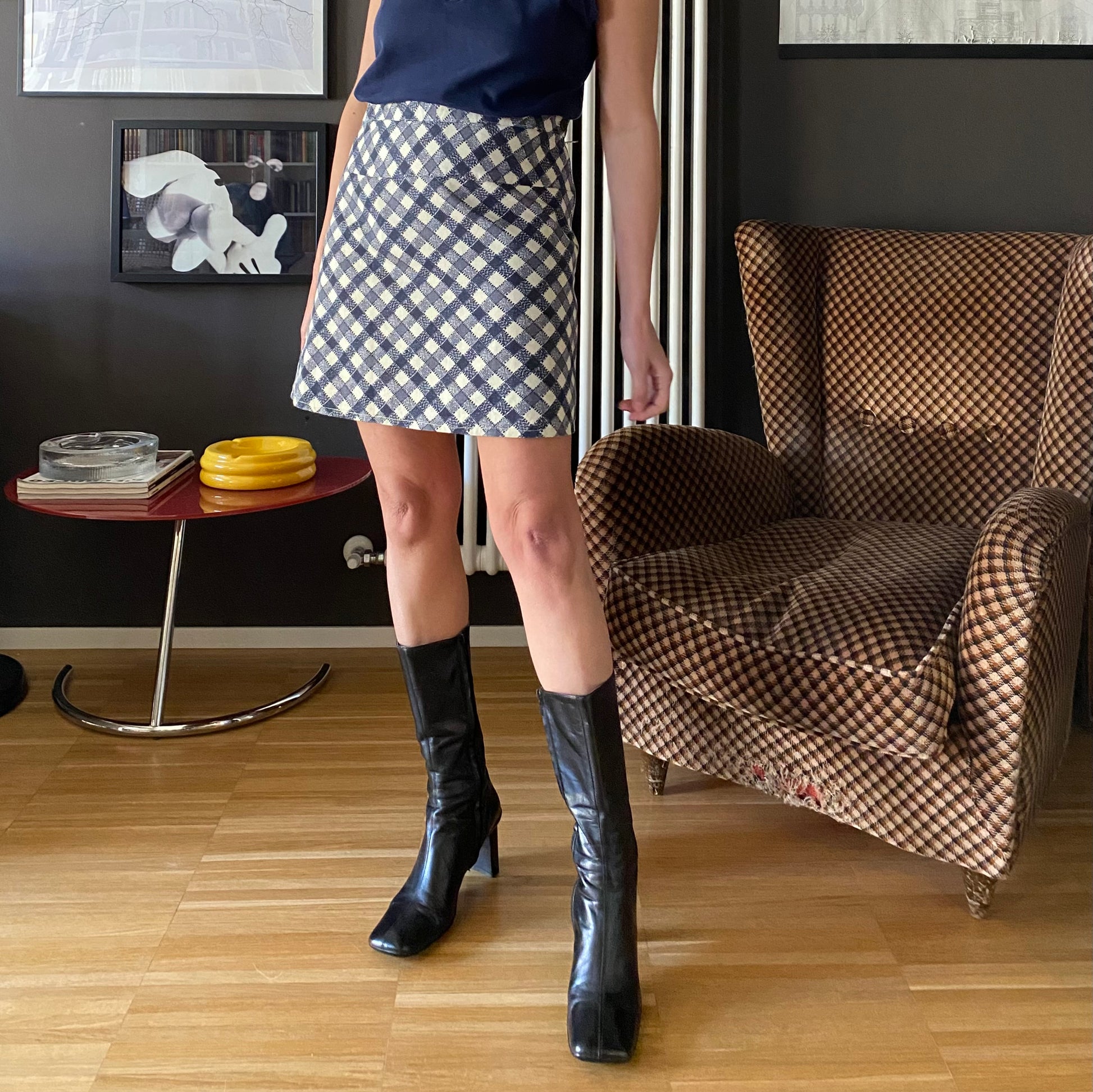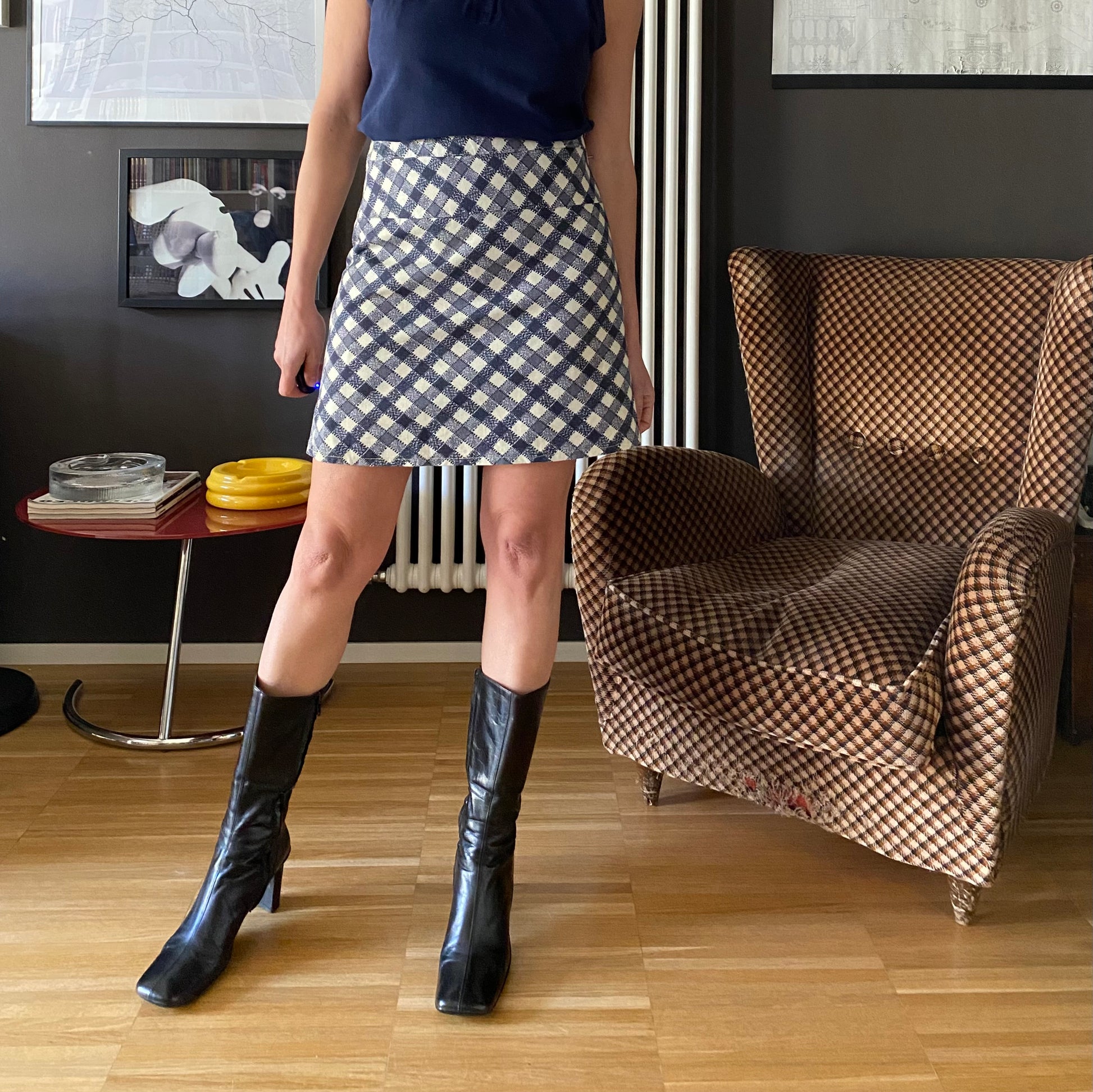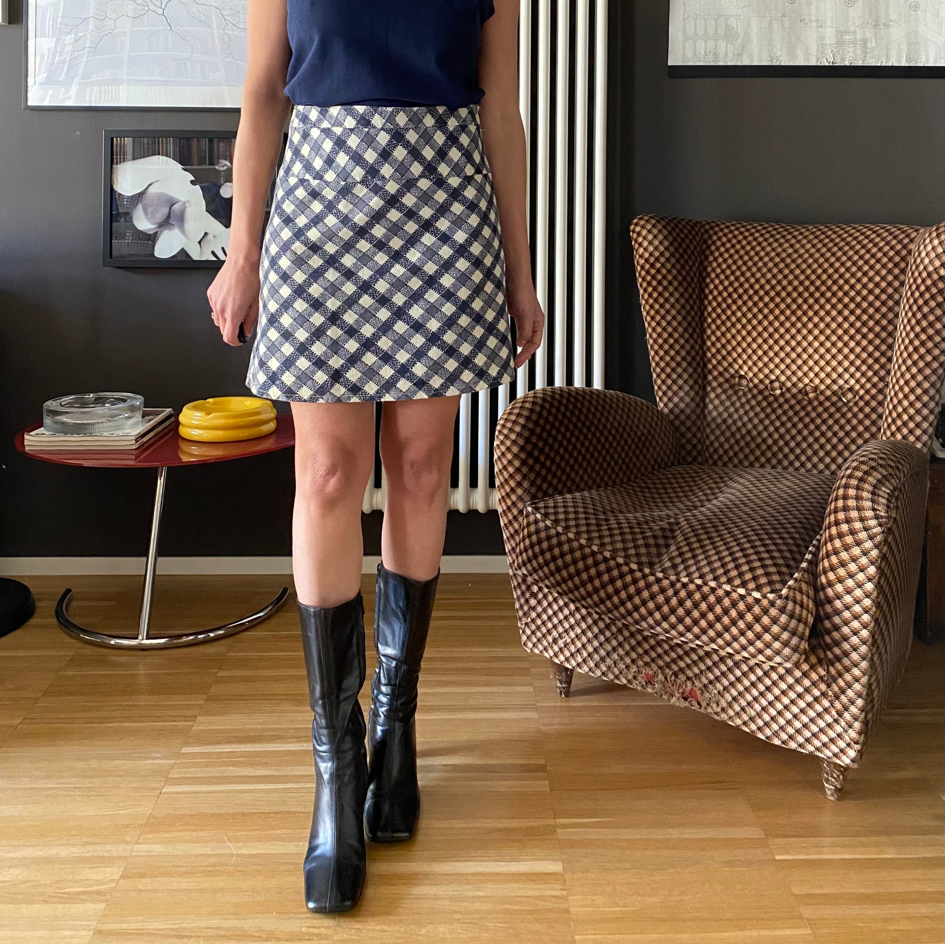 Gonna mini a trapezio con fantasia a righe oblique blu su fondo bianche che creano un bel gioco ottico di pattern a rombi.