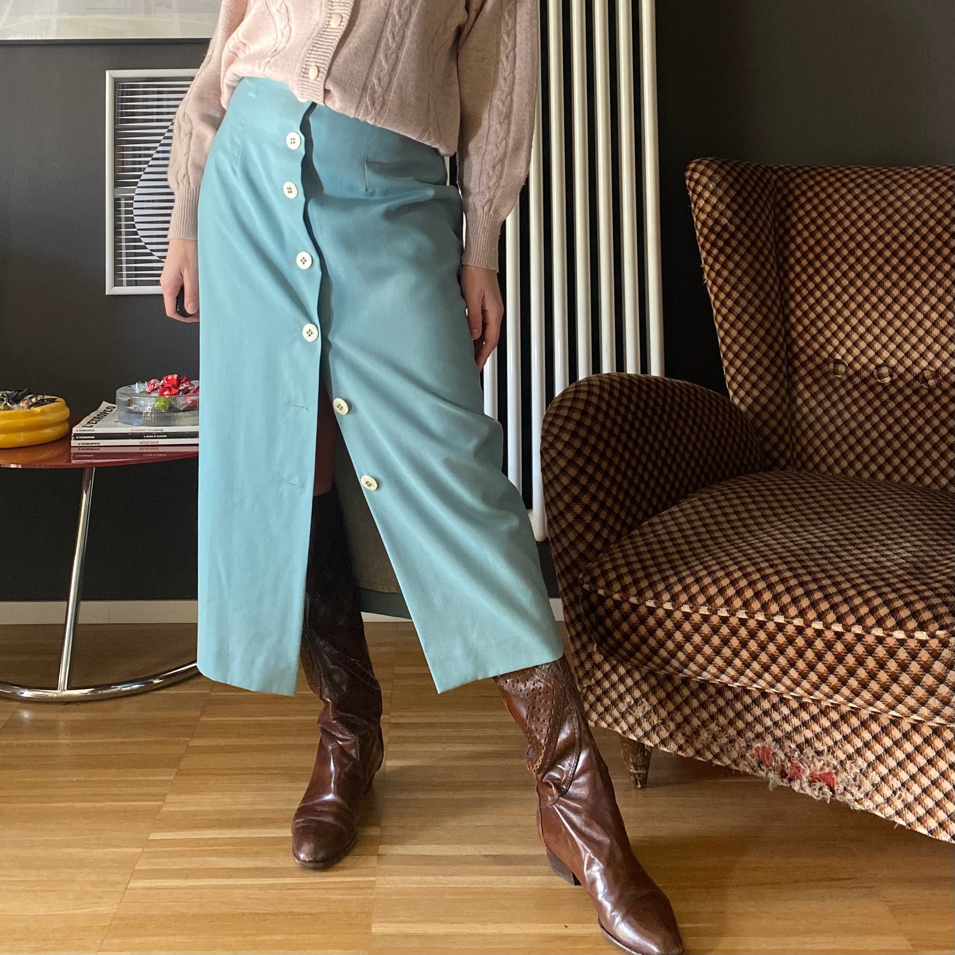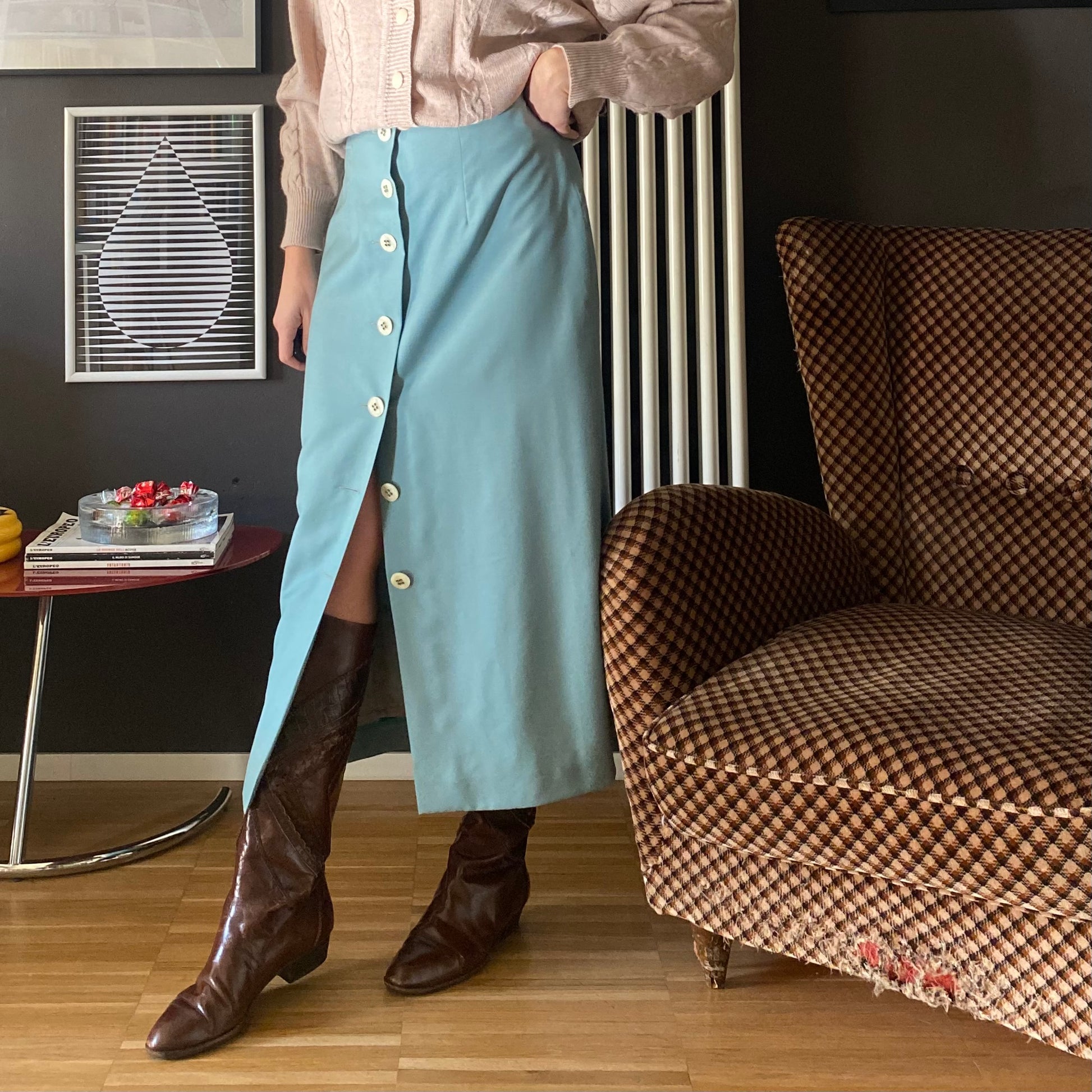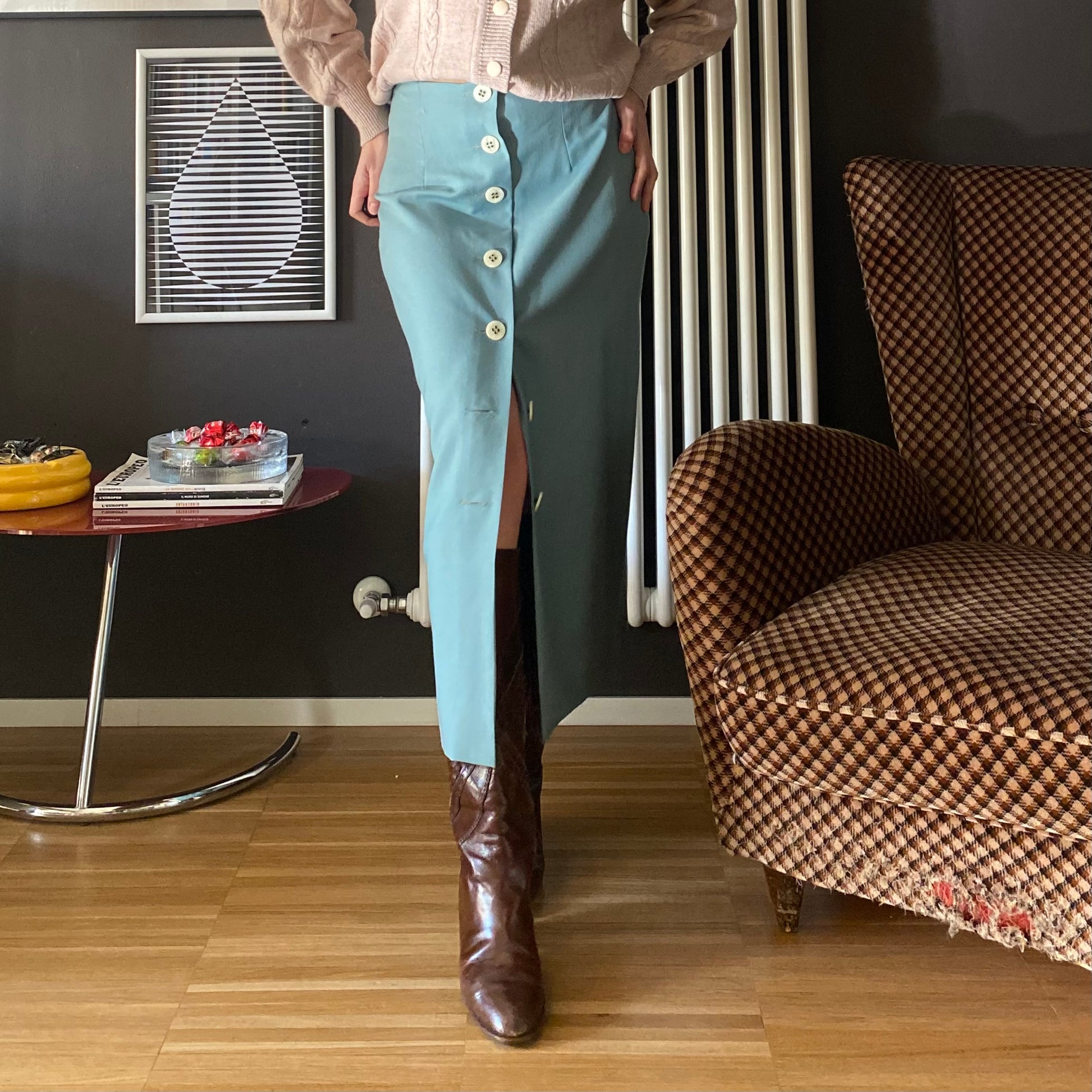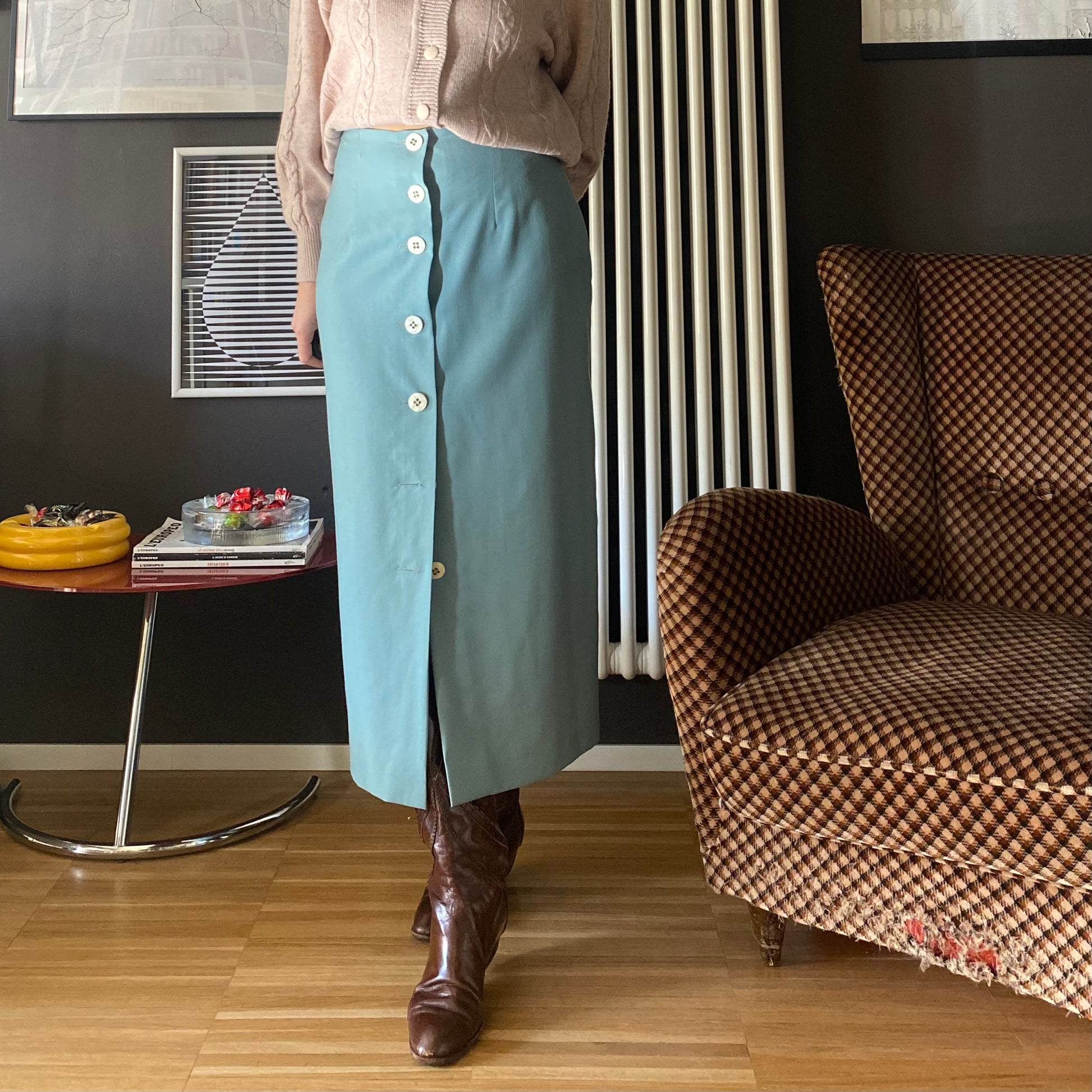 Vita alta con chiusura centrale anteriore con grandi bottoni madreperla da regolare per dare più o meno profondità allo spacco.
