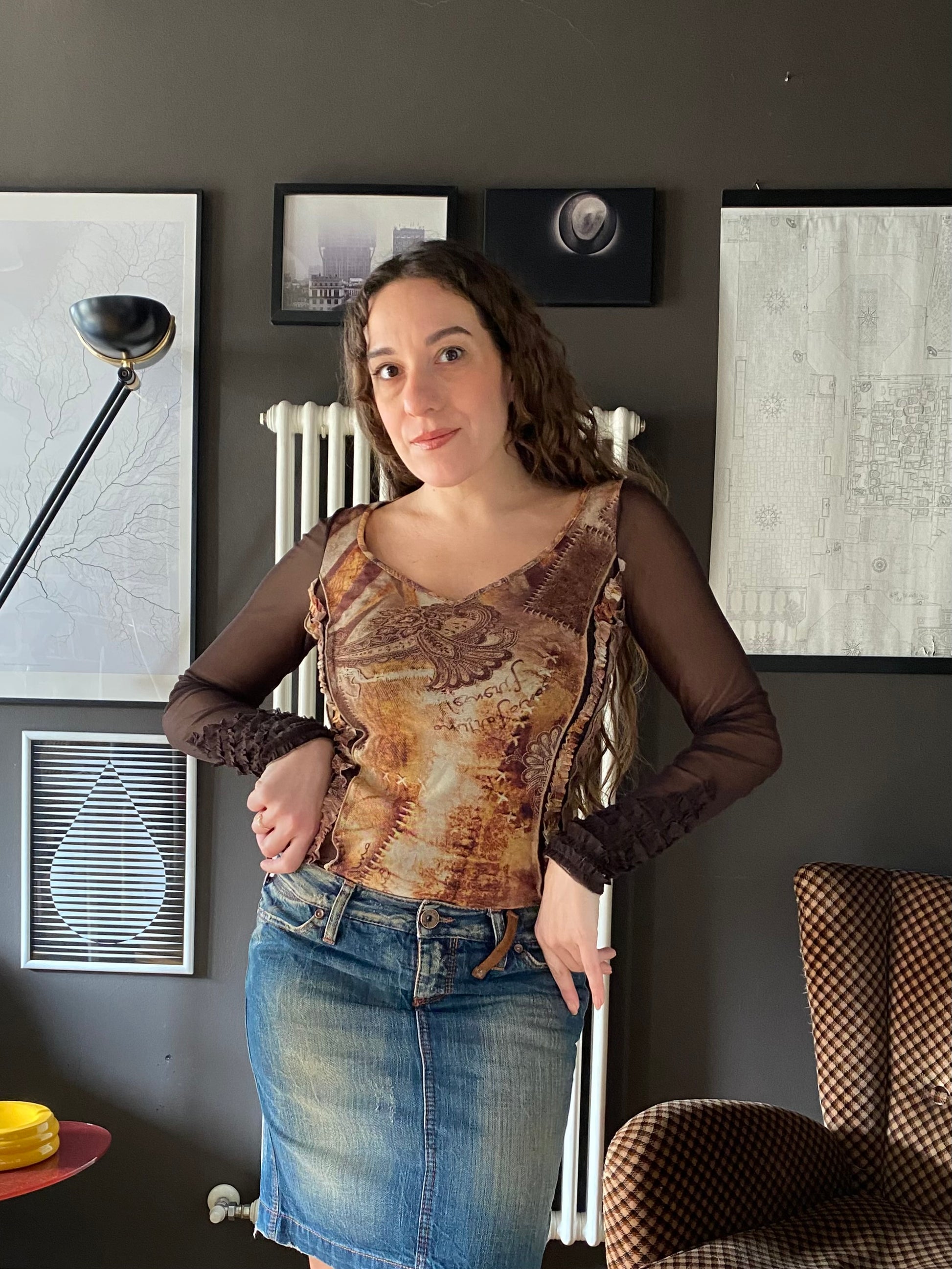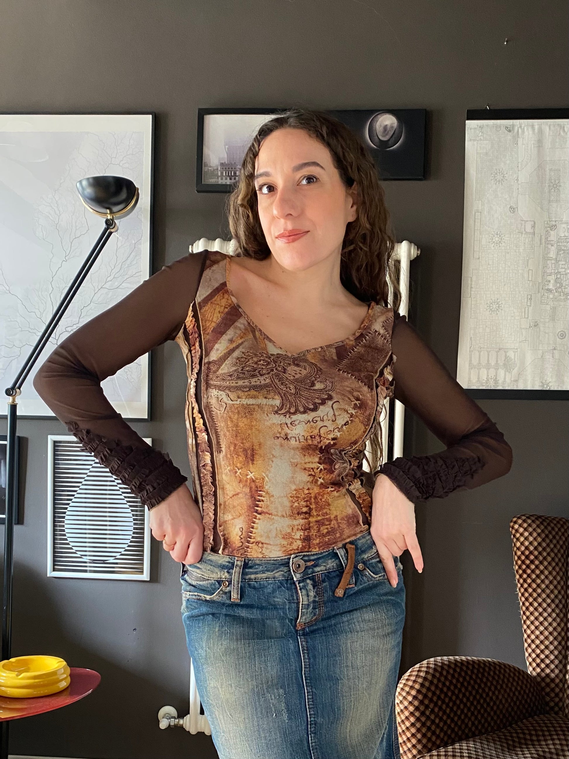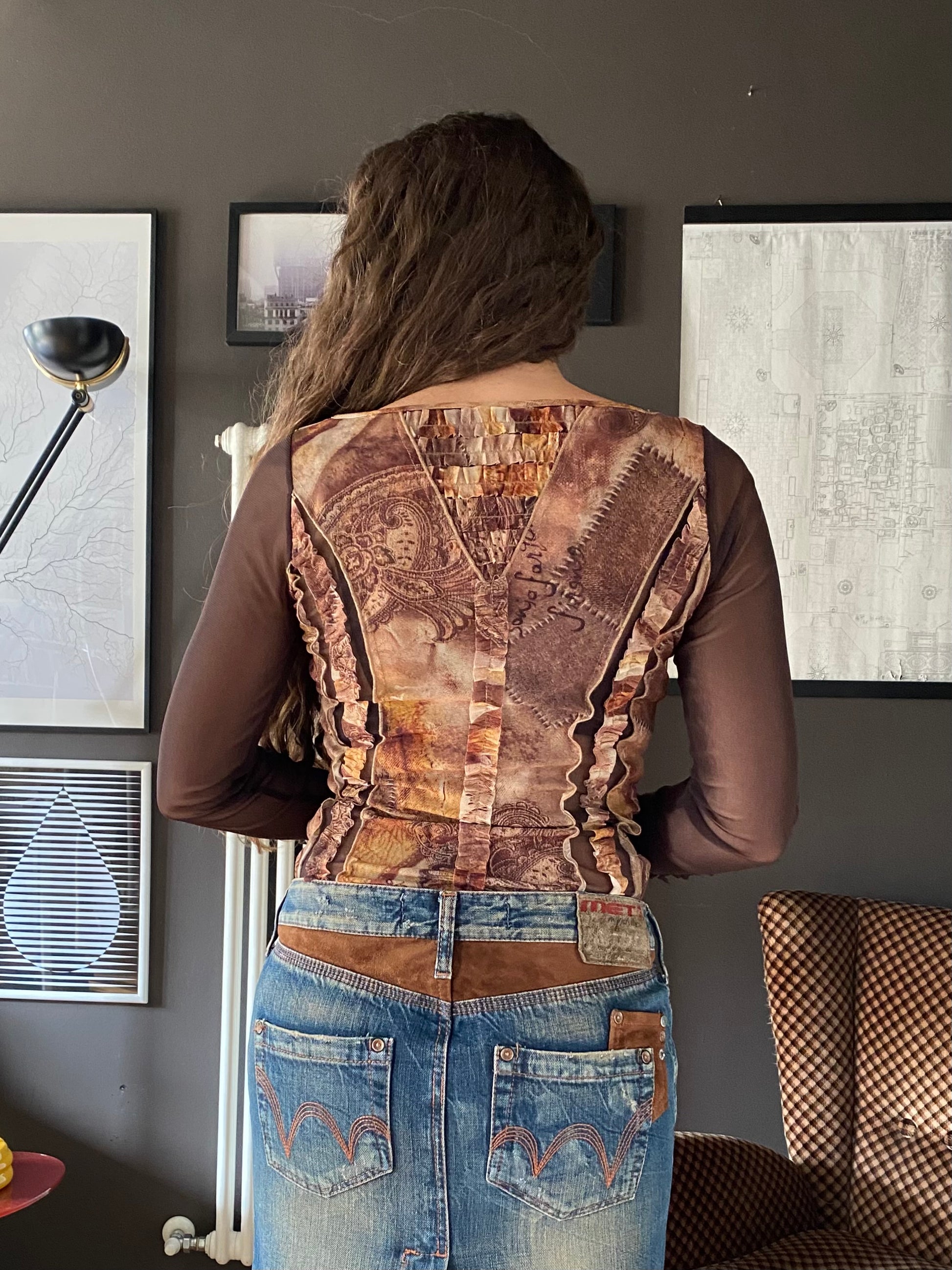 Lavorazione patchwork con strati di mesh sovrapposti. Fantasia cashmere dai toni del beige e del marrone.