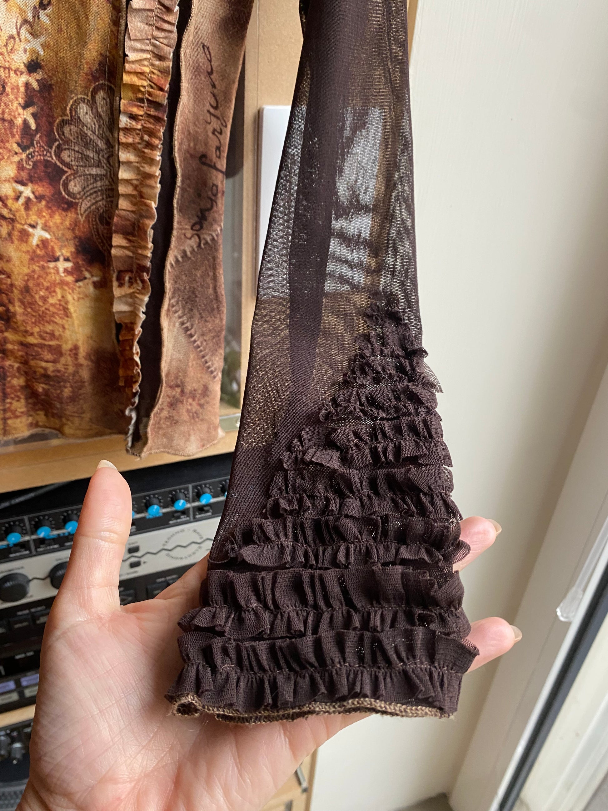 Maniche color marrone, trasparenti, con lavorazione plissettata sui polsini.