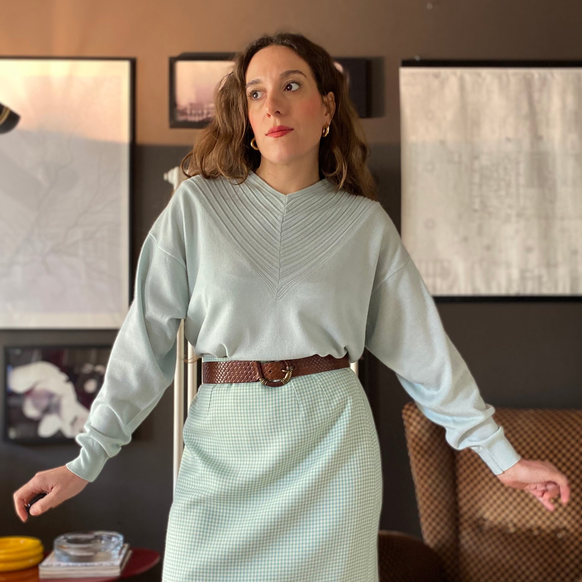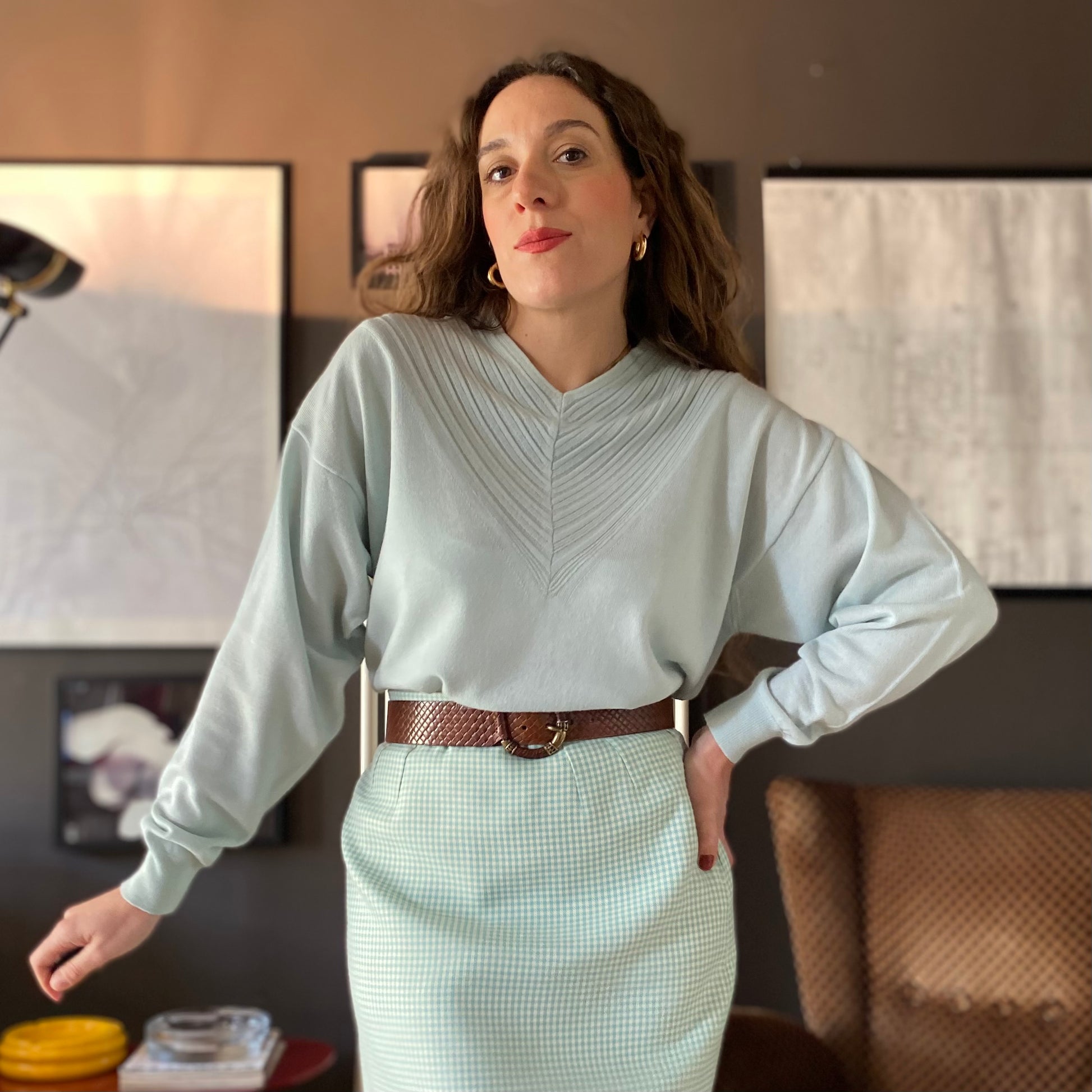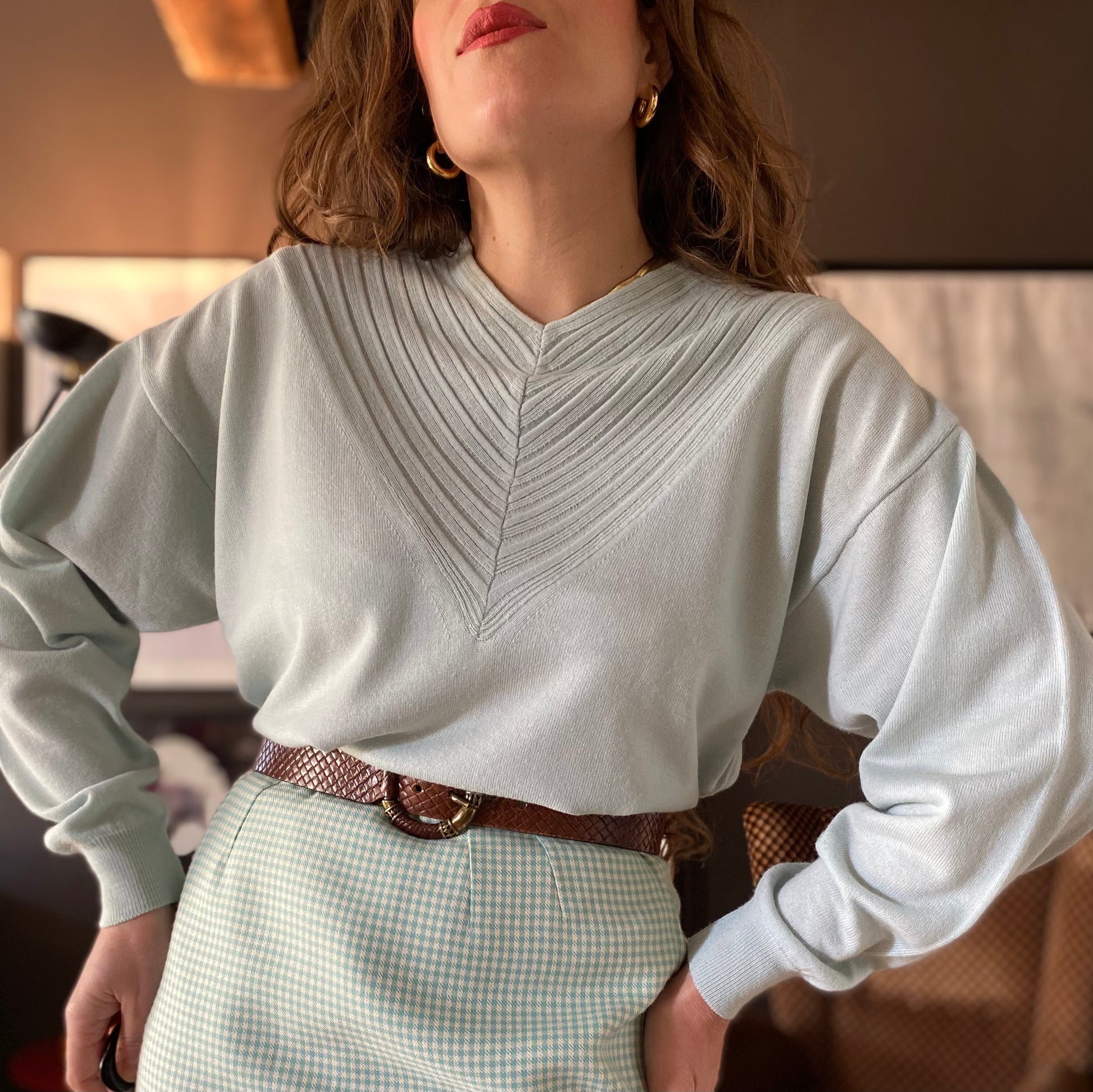 Dolcissimo pullover anni 80 con piccolo scollo a V ornato da righe oblique che dalle spalle si congiungono verso il centro formando un grande triandolo inverso.