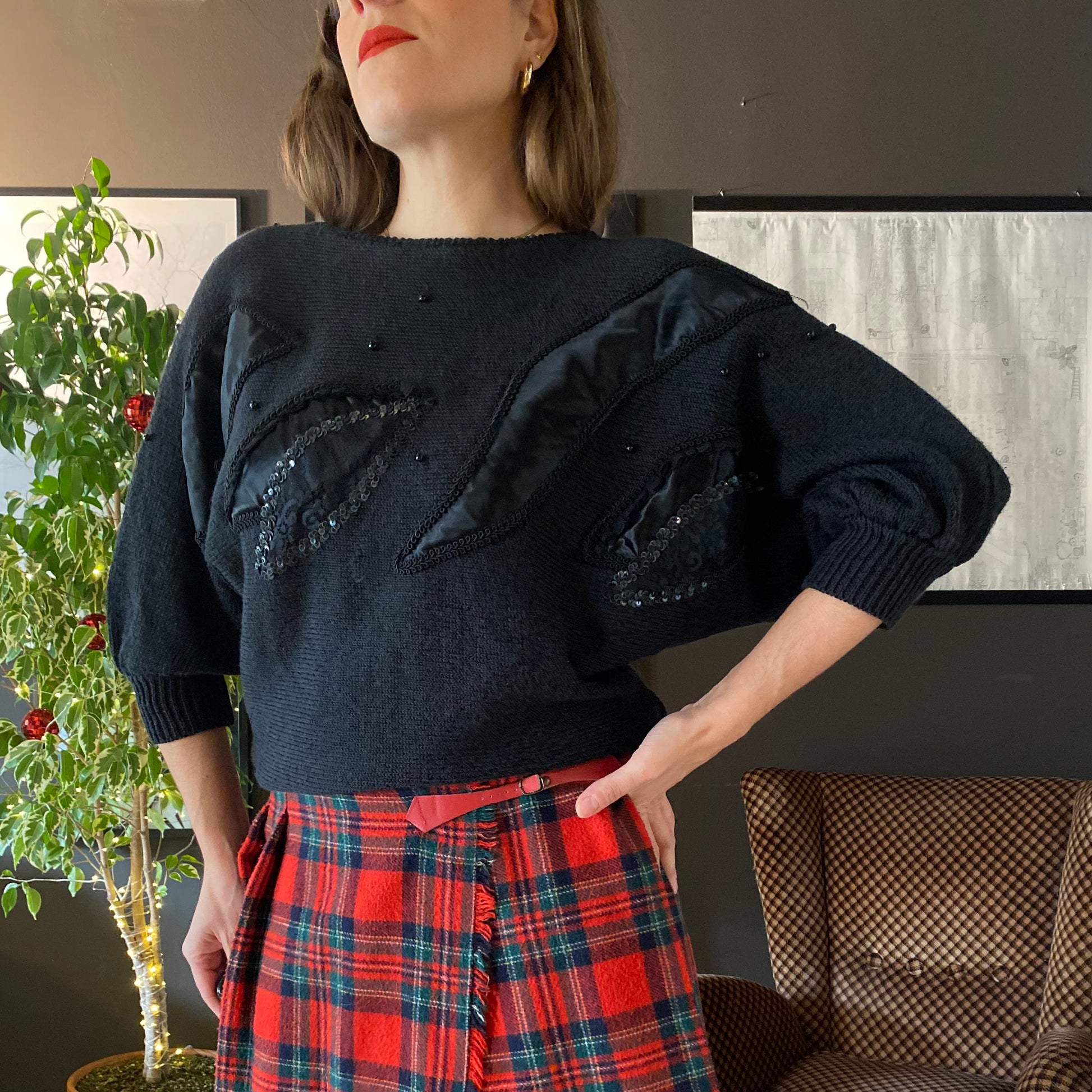 Maglioncino super 80s con scollo a barchetta e manica a pipistrello al gomito.