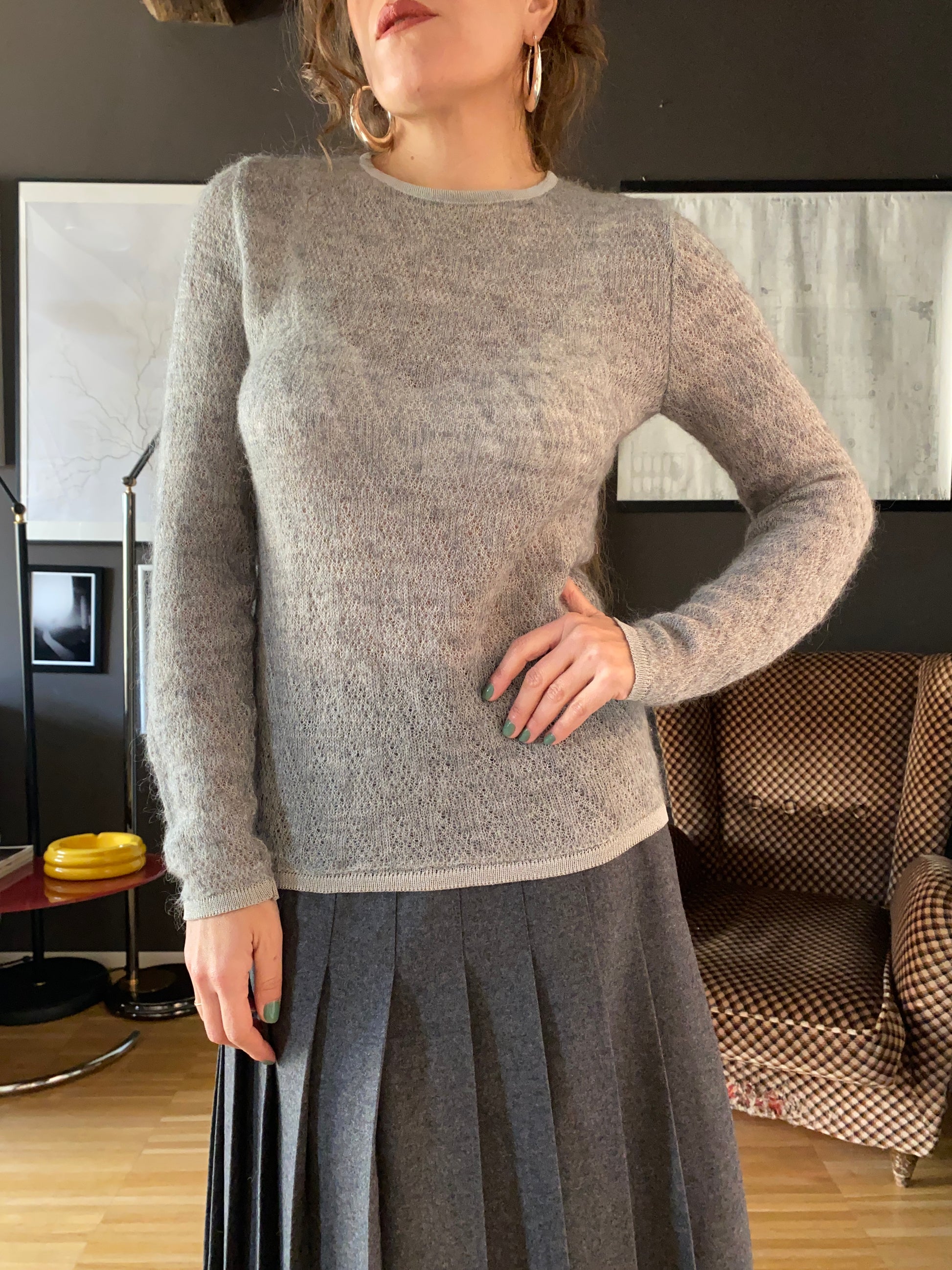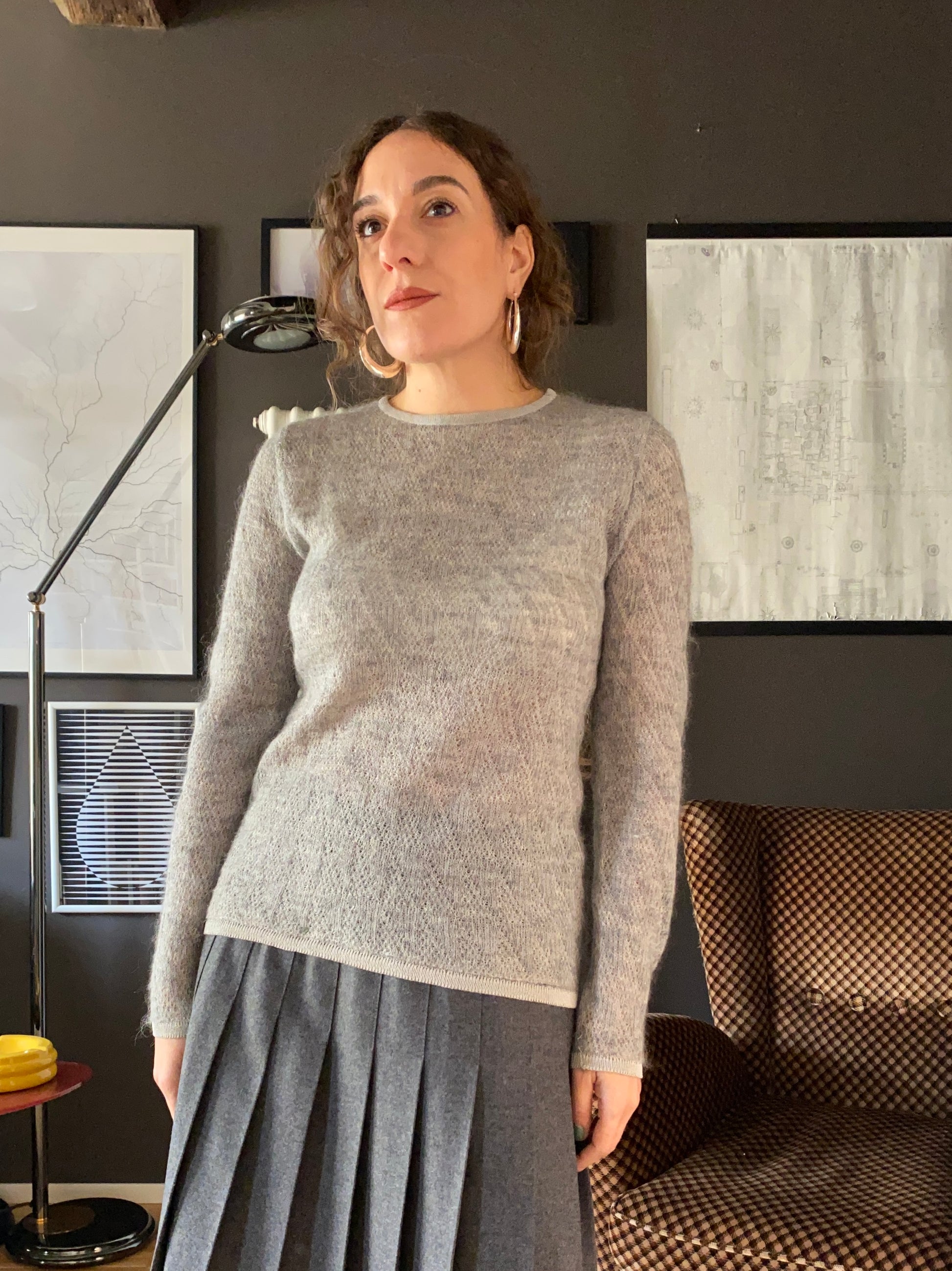 Motivo a rombi, traforato e pelosino. Scollo tondo con rifinitura argento in maglia di viscosa come sui polsini e sull'orlo.