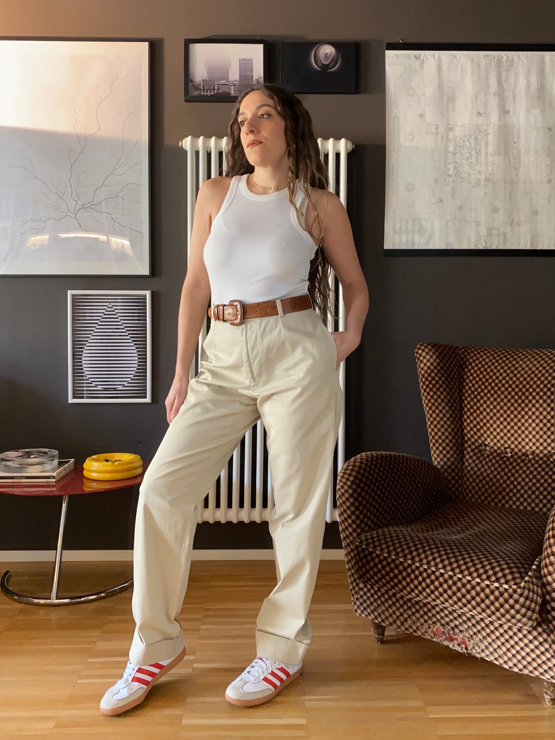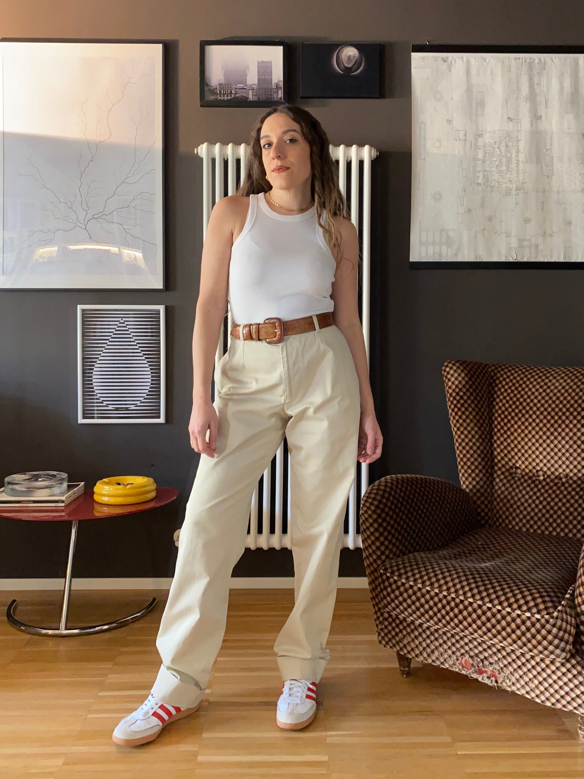 Con risvolto e senza piega centrale, a vita alta, modello tre tadche, due davanti e una dietro.