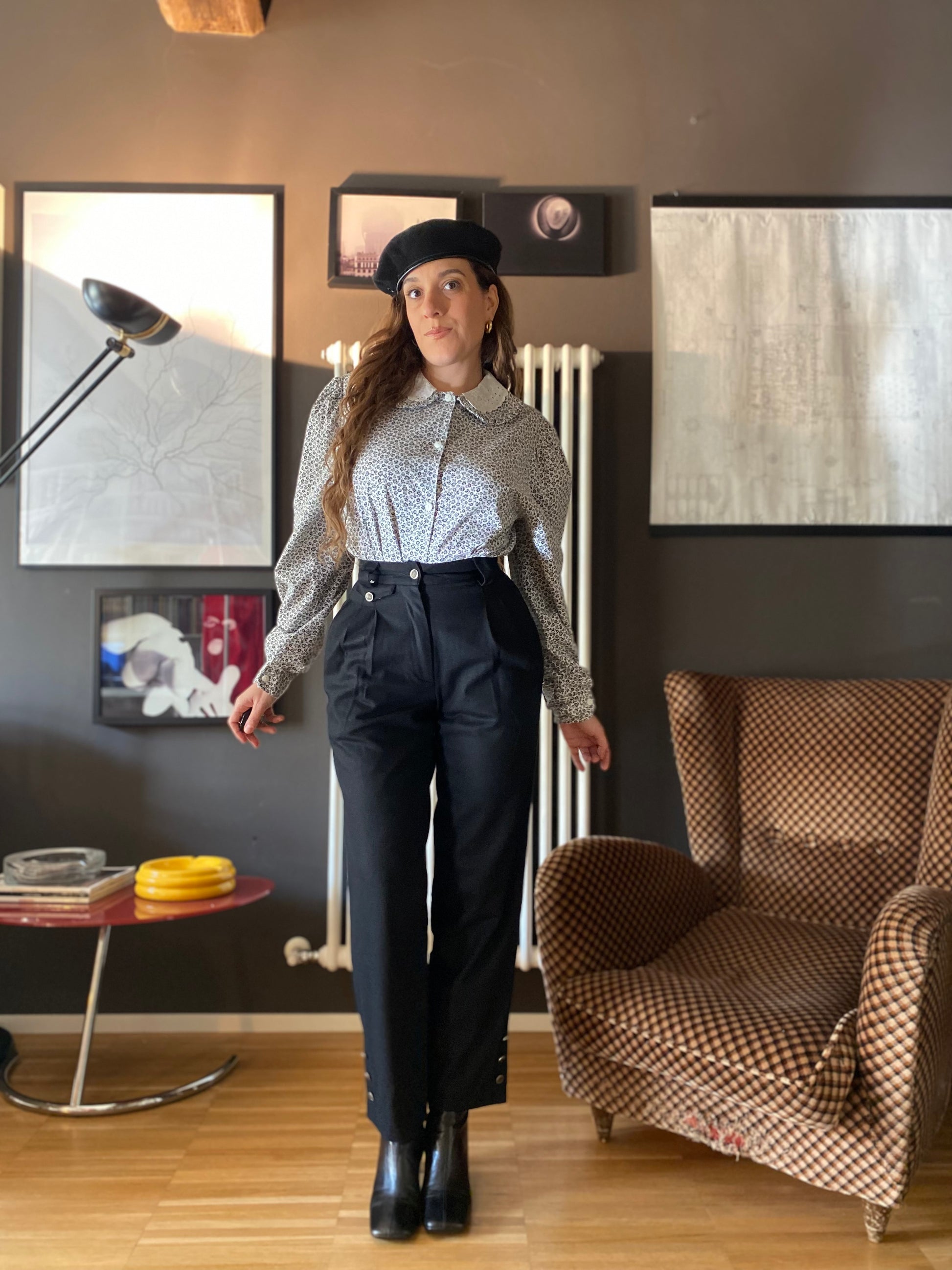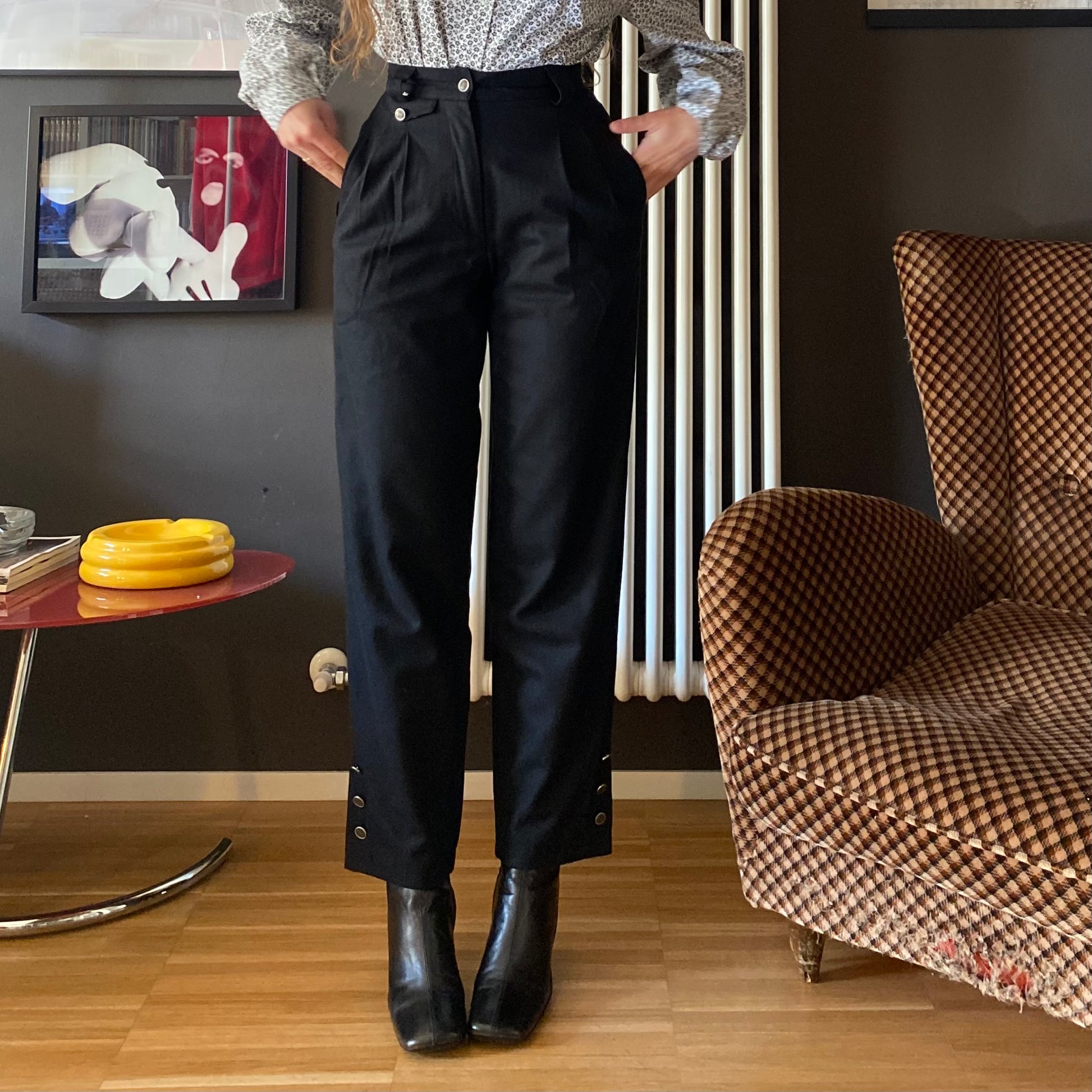 Vita alta con pences e finto taschino portamonete sul davanti con bottoncino metallico.