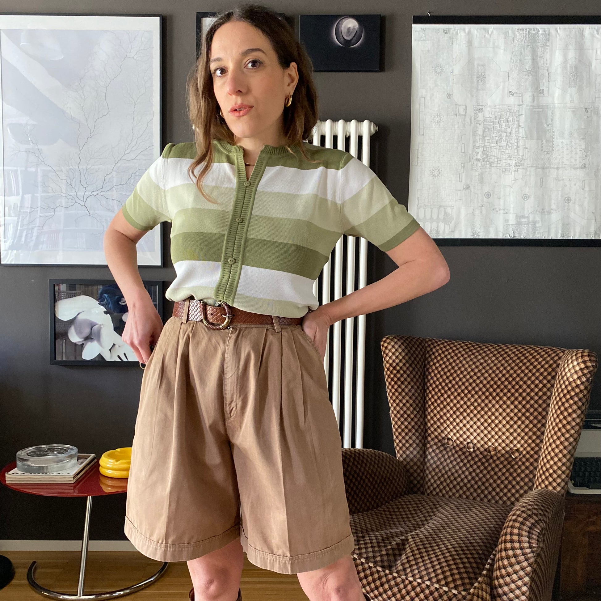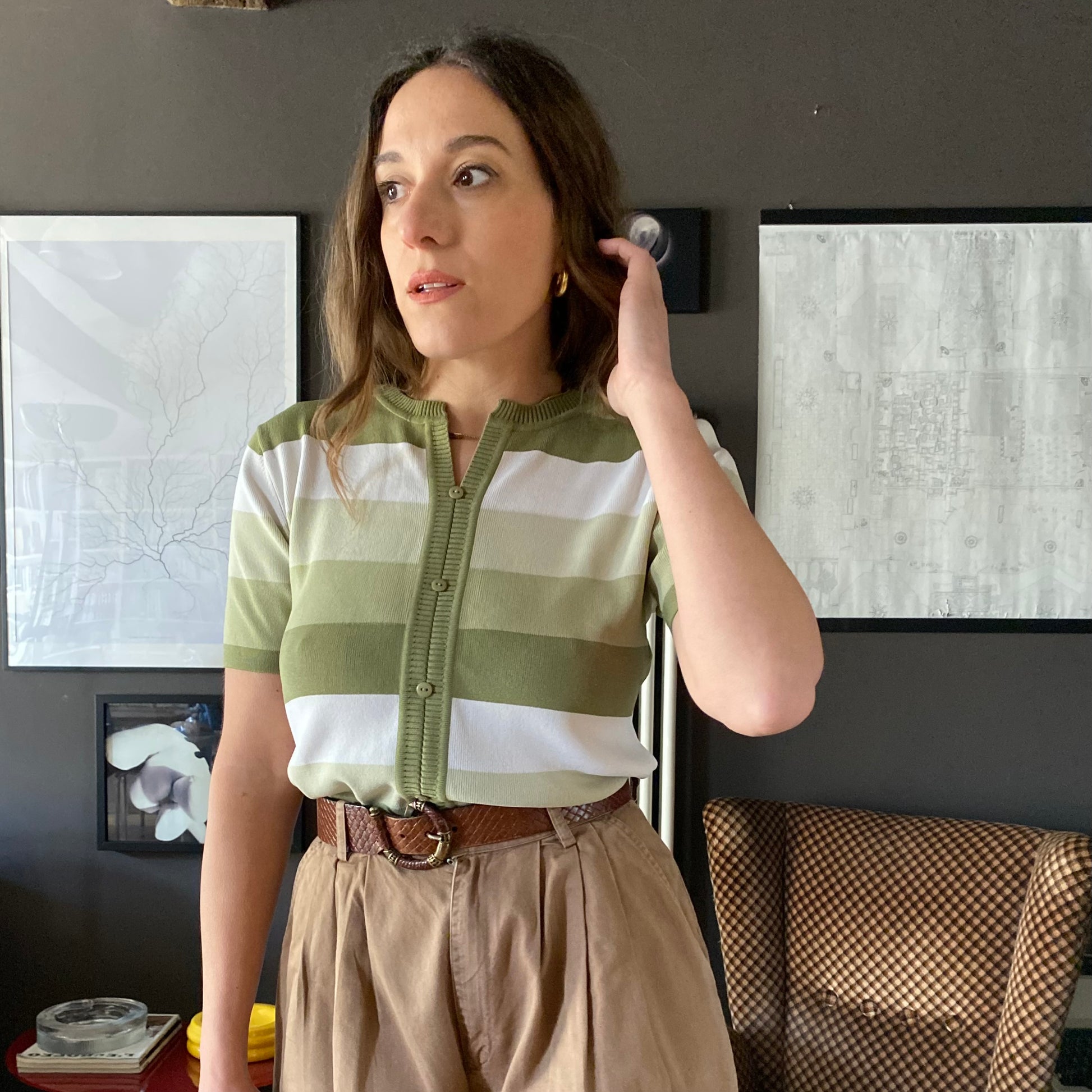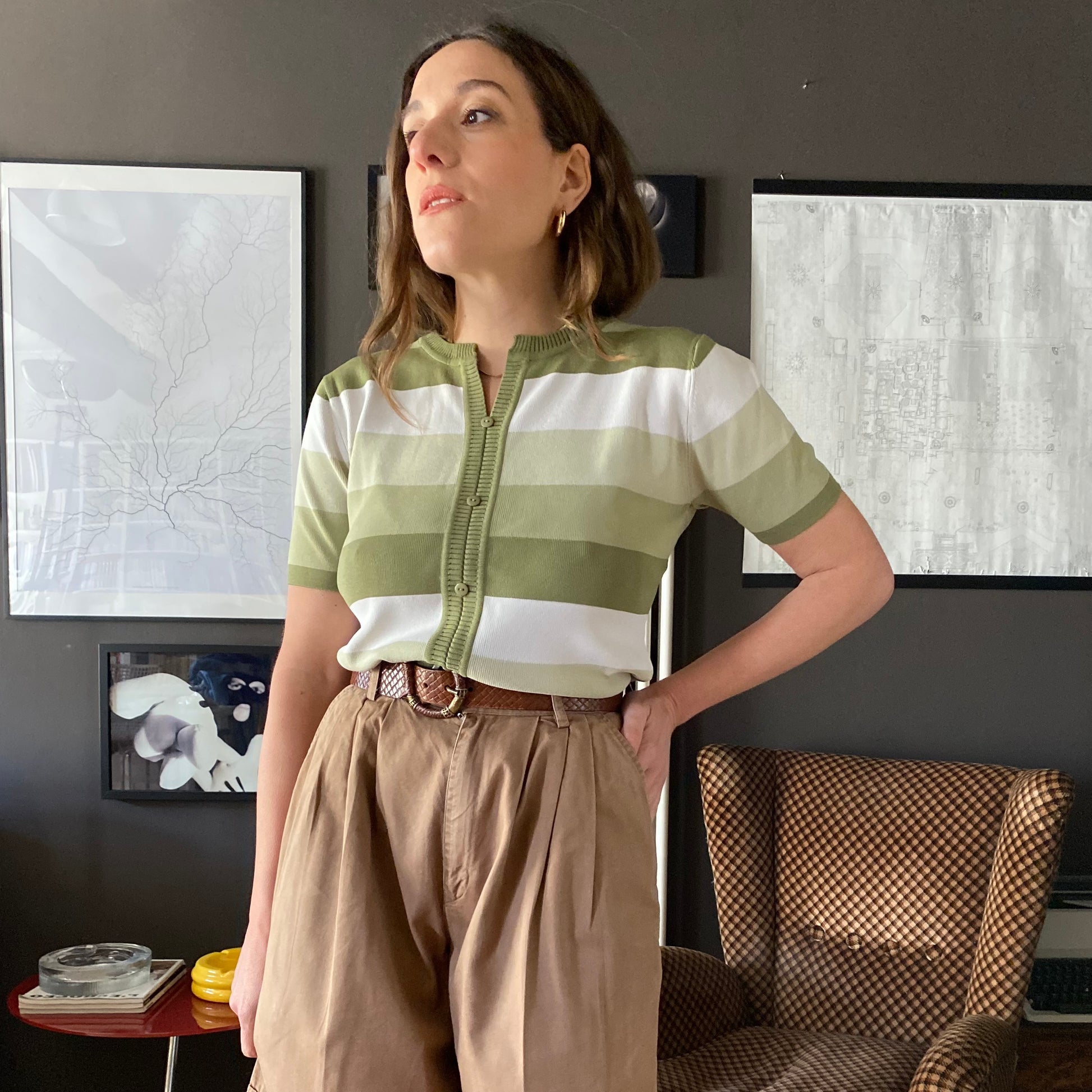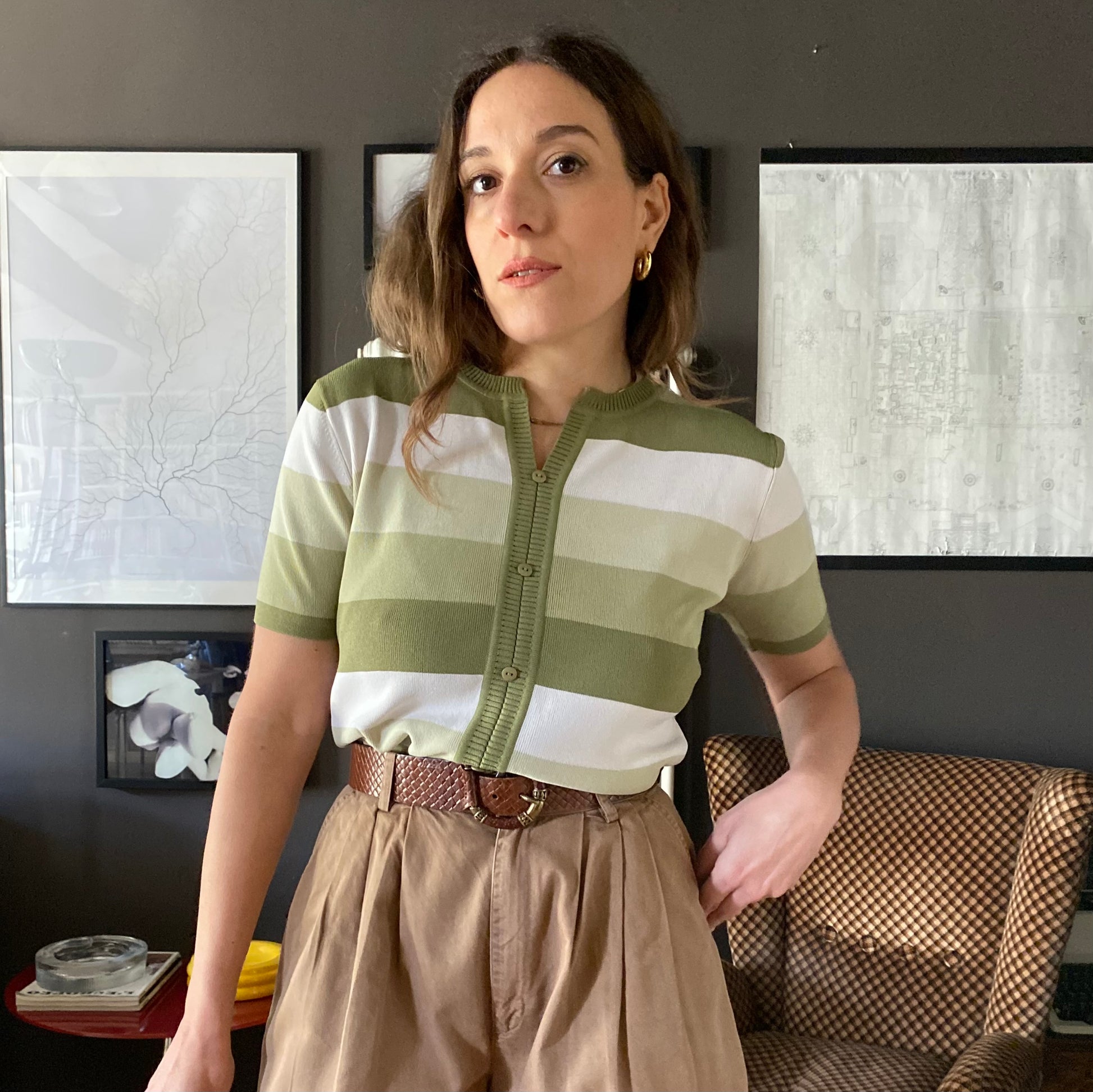 Tshirt tipo cardigan con bottoncini finti, second hand a righe bianche e dai toni del verde oliva.